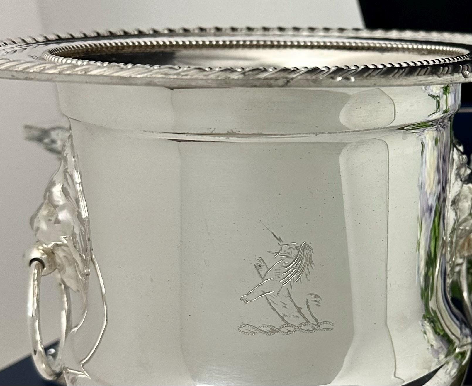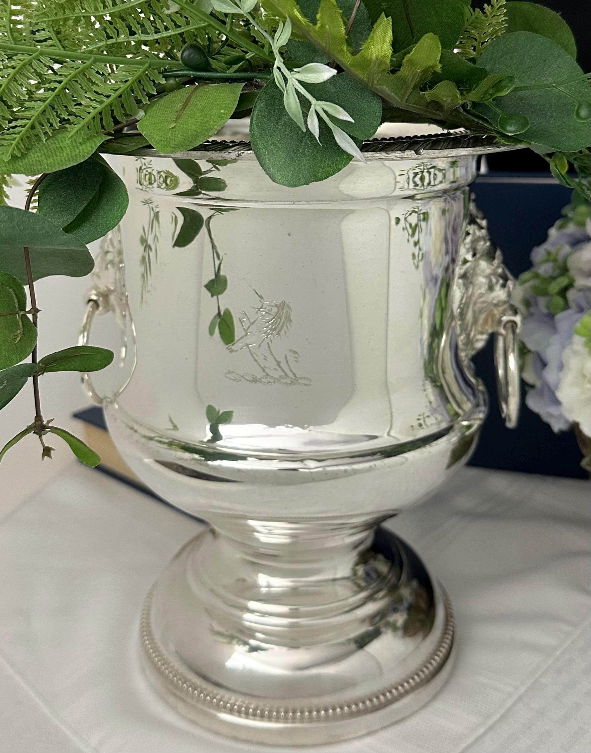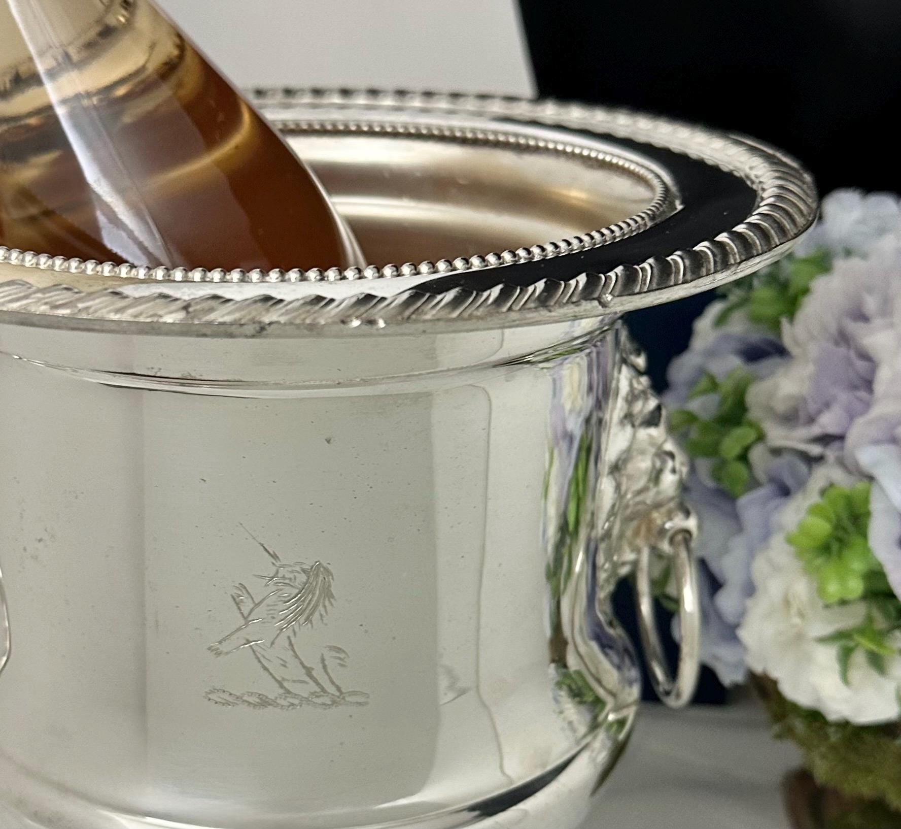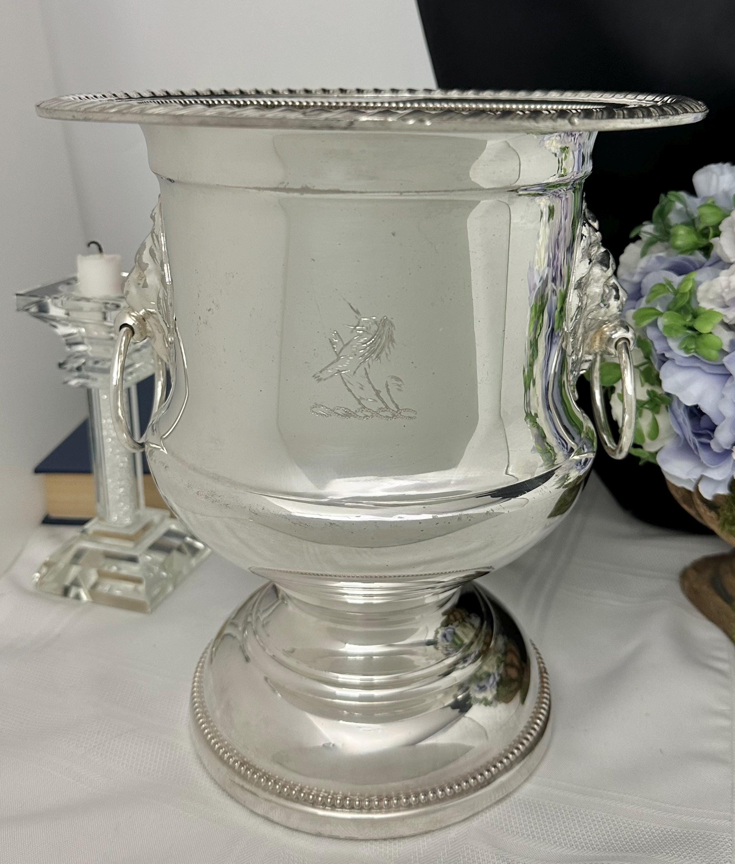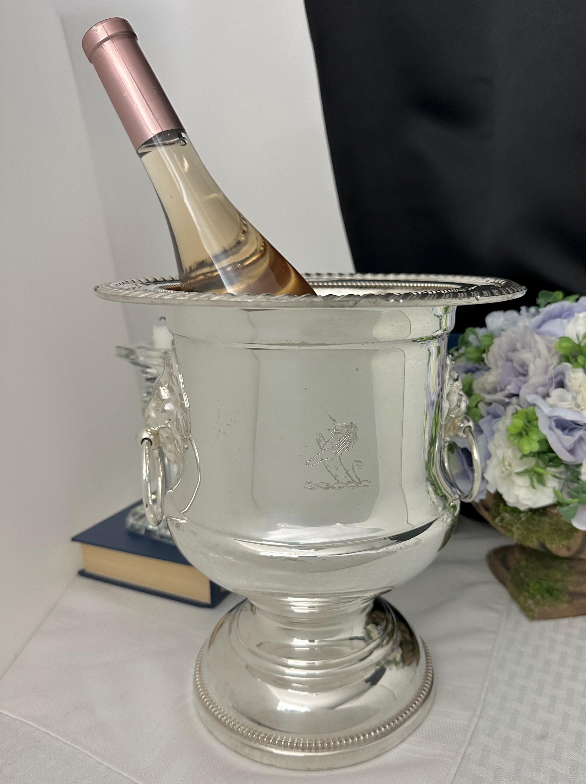 This vintage Champagne Bucket by KSM (Krefelder Silberwarenfabik Muller) is German with a Georgian style design. Made of silver-plated metal, it features lion handles, Beaded rim and foot along with a shield on the front, adding a touch of traditional elegance to any occasion. The Shield on the front is a flier bird motif.