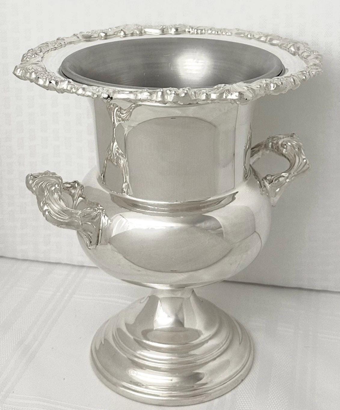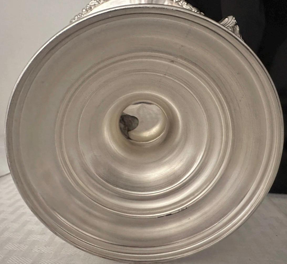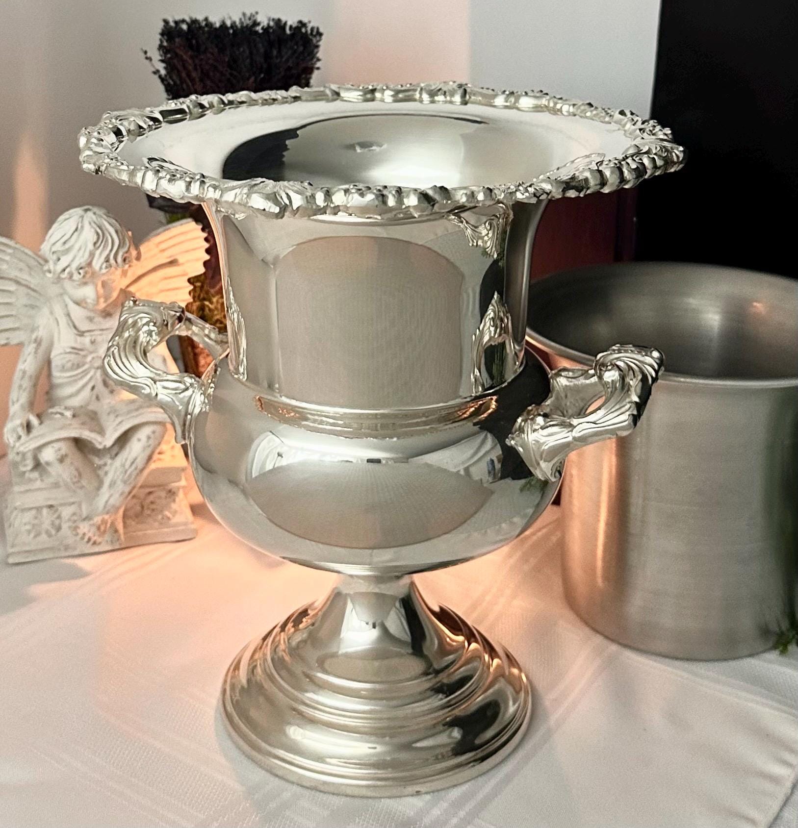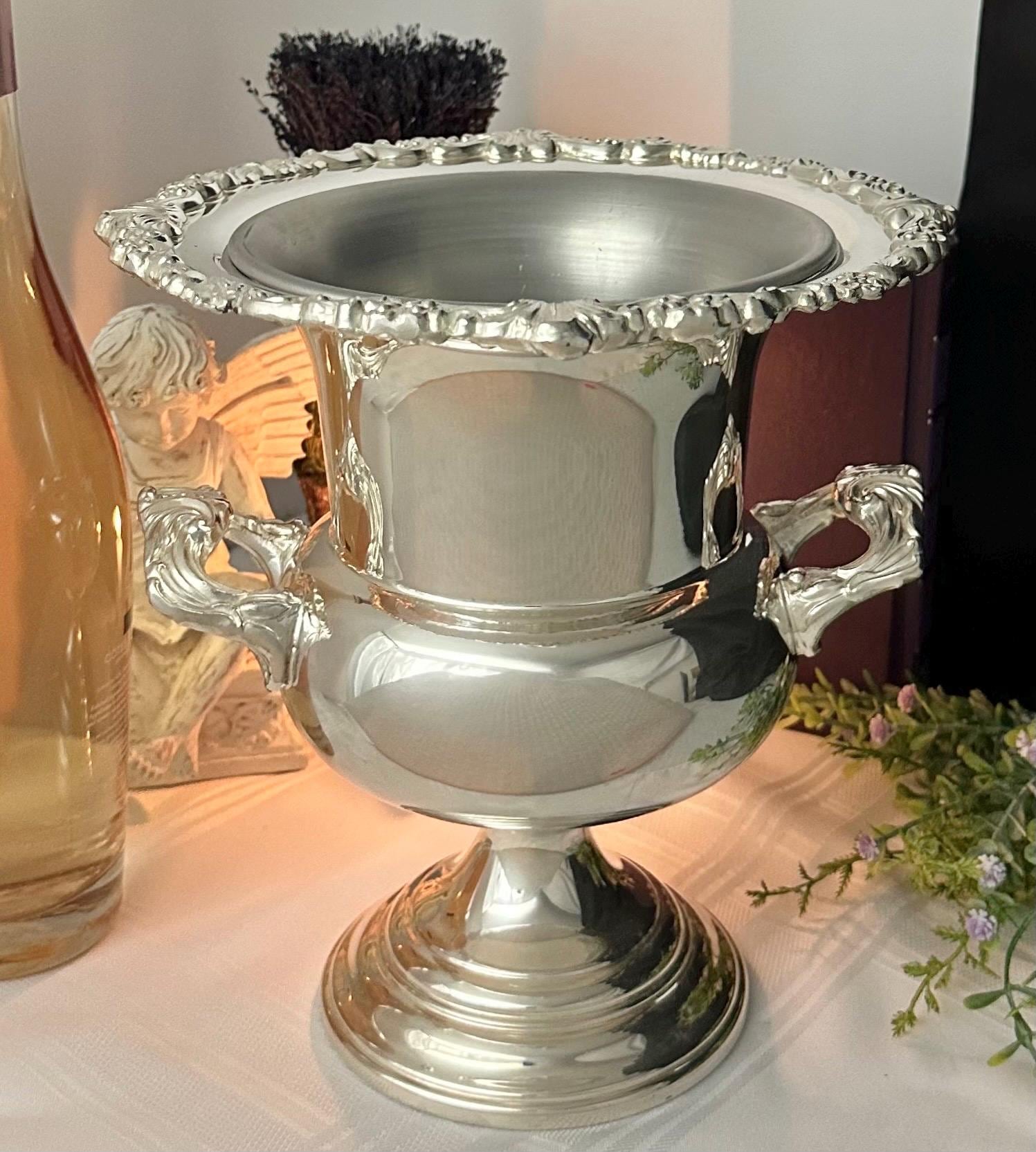 This can also be used as a trophy, flower urn, wine chiller to an ice bucket. It has flowered ornate handles and a tiered foot. The silver plate is in wonderful condition on the inside as well on the outside with age appropriate surface wear. The piece is polished and ready to use and enjoy for years to come!