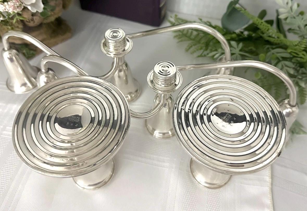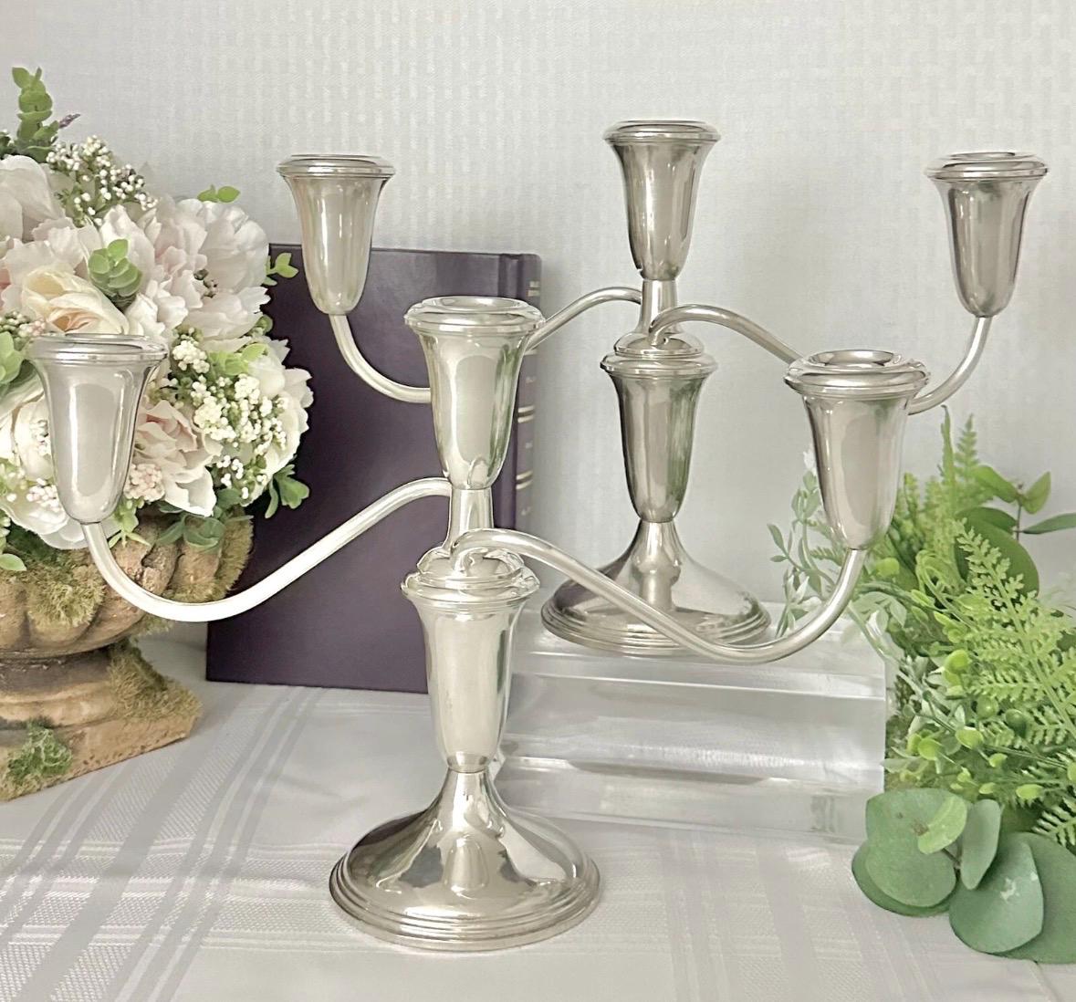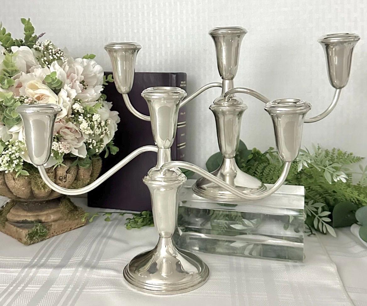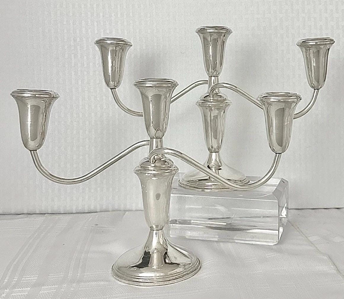 This is for a pair of Sterling Silver Empire #384 Candelabras that measure: 7.5 inches tall x 11.5 inches wide x 3.5 inches deep. They are in beautiful condition pieces and ready to use and enjoy for years to come.