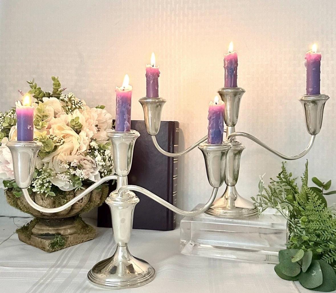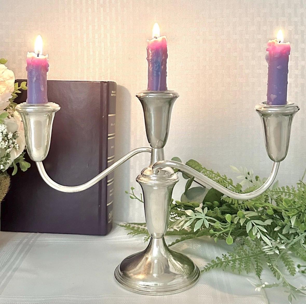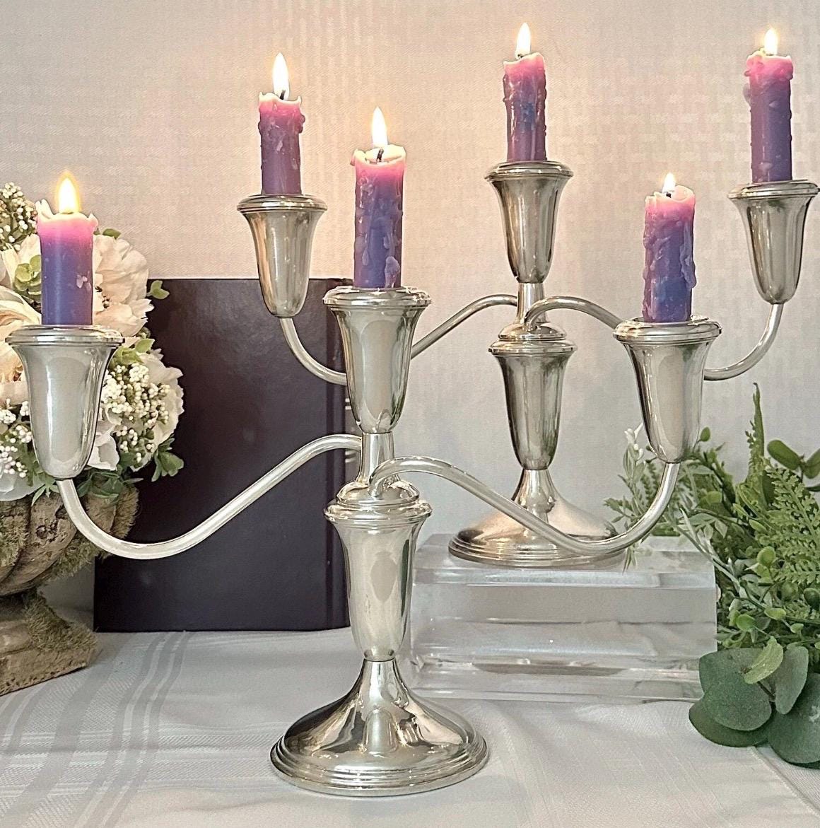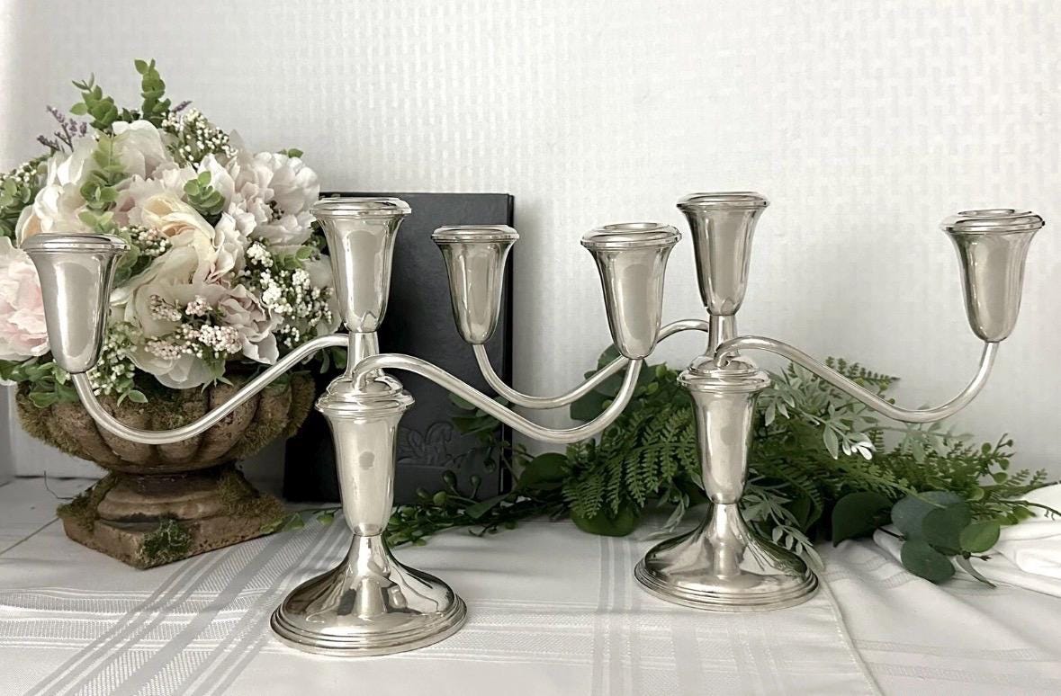 This is for a pair of Sterling Silver Empire #384 Candelabras that measure: 7.5 inches tall x 11.5 inches wide x 3.5 inches deep. They are in beautiful condition pieces and ready to use and enjoy for years to come.