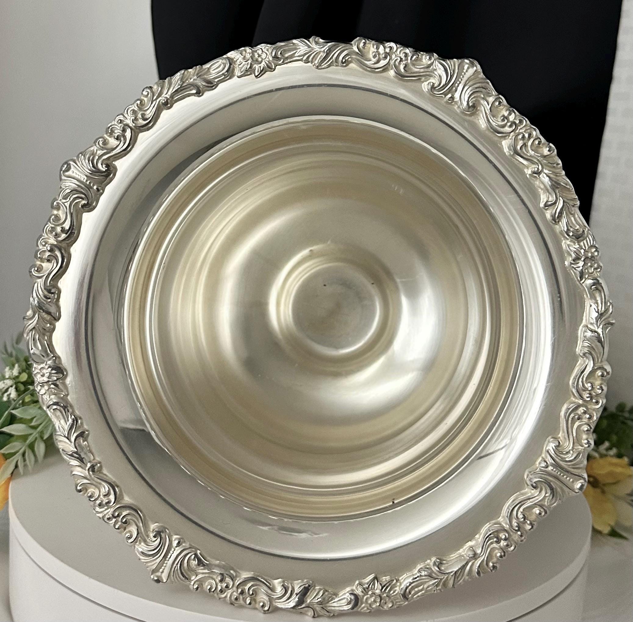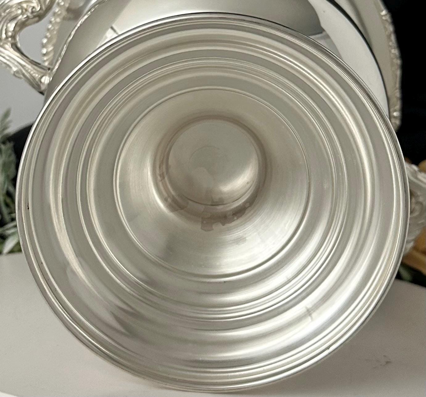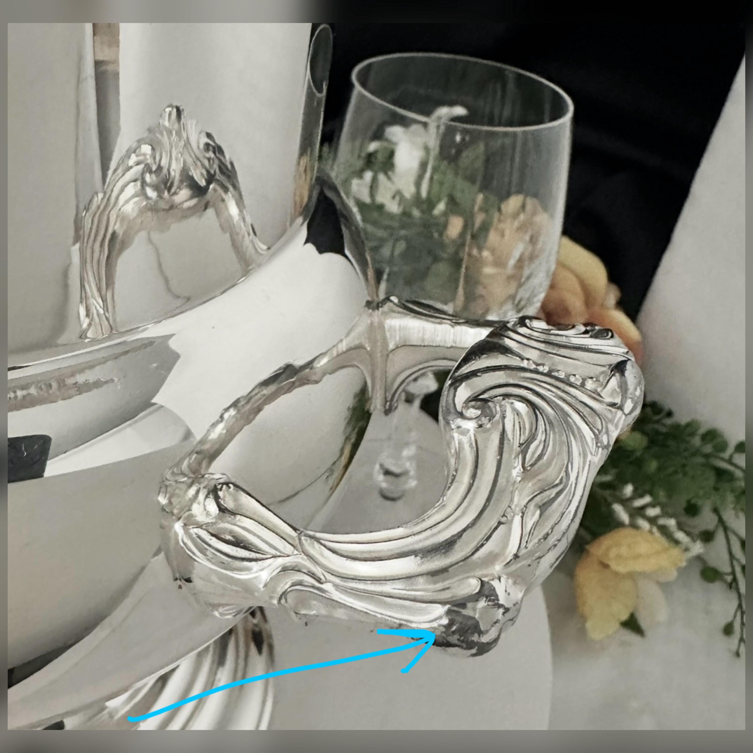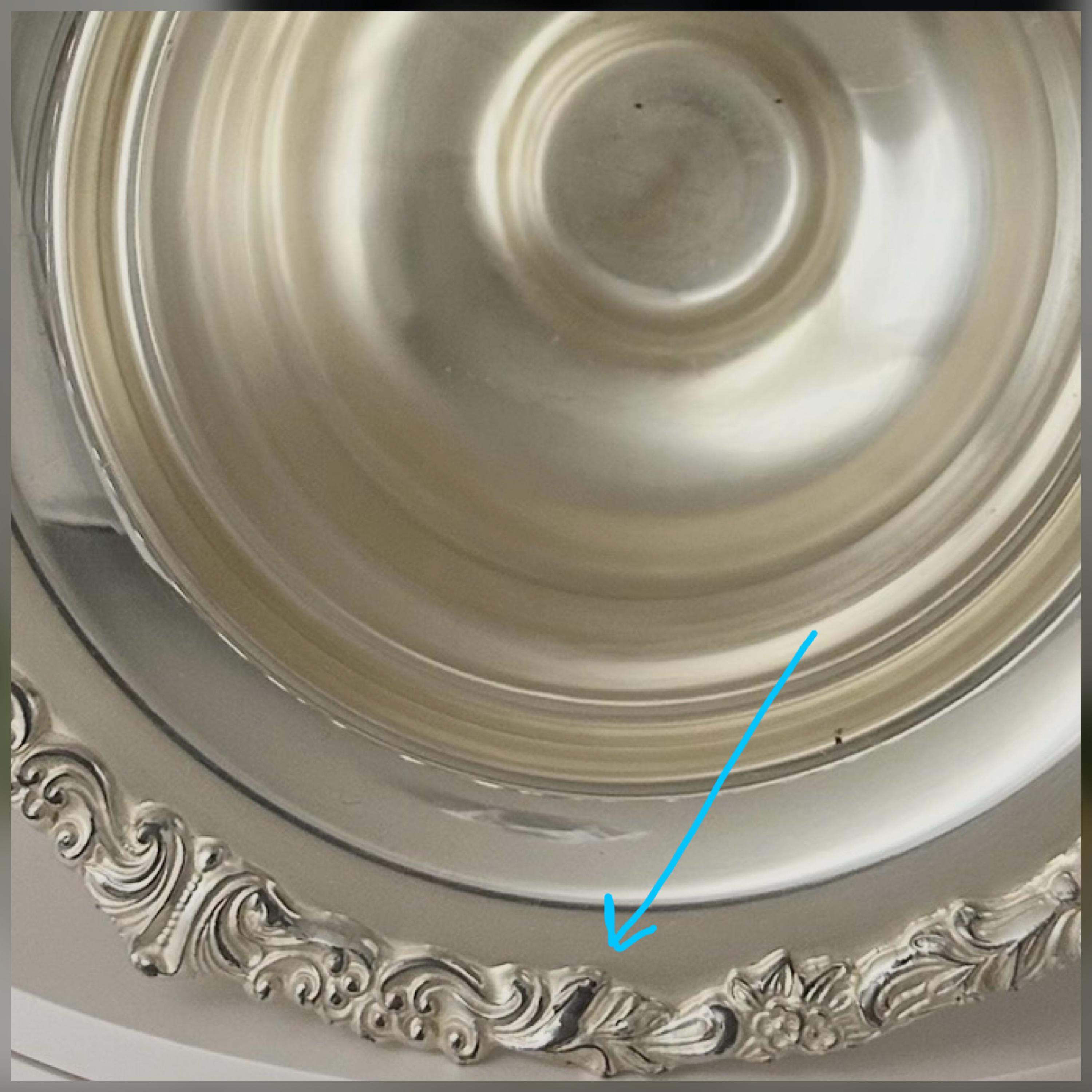 **There is wear on the silver plate on the handle and the rim - shown in the pictures. This is discounted some for the wear as mentioned. There are no dents and the inside is in wonderful condition.