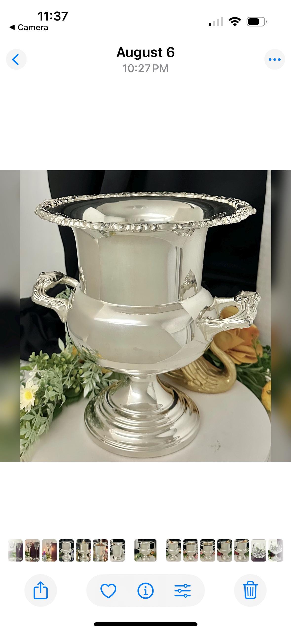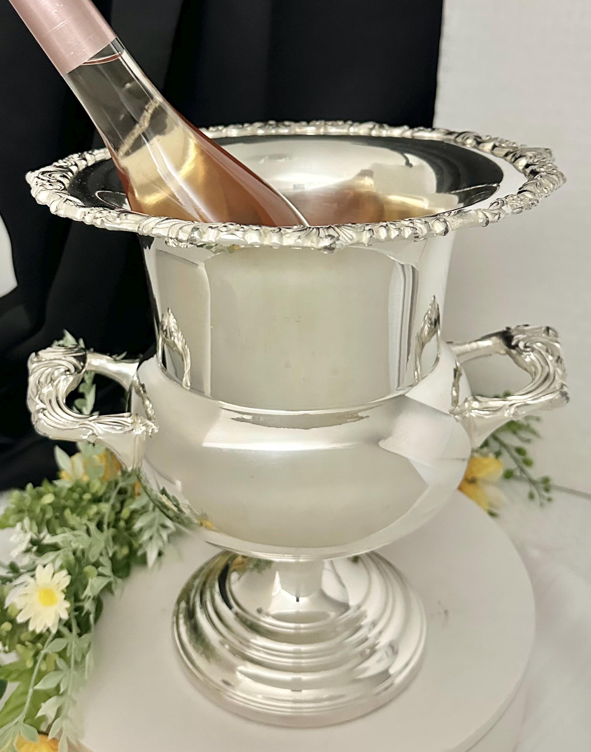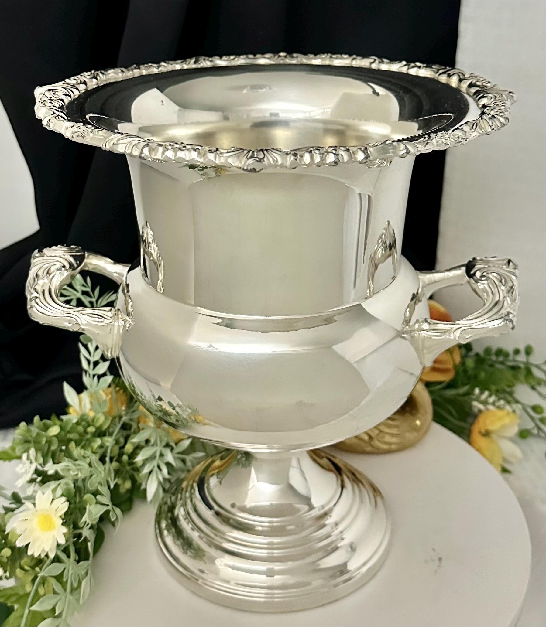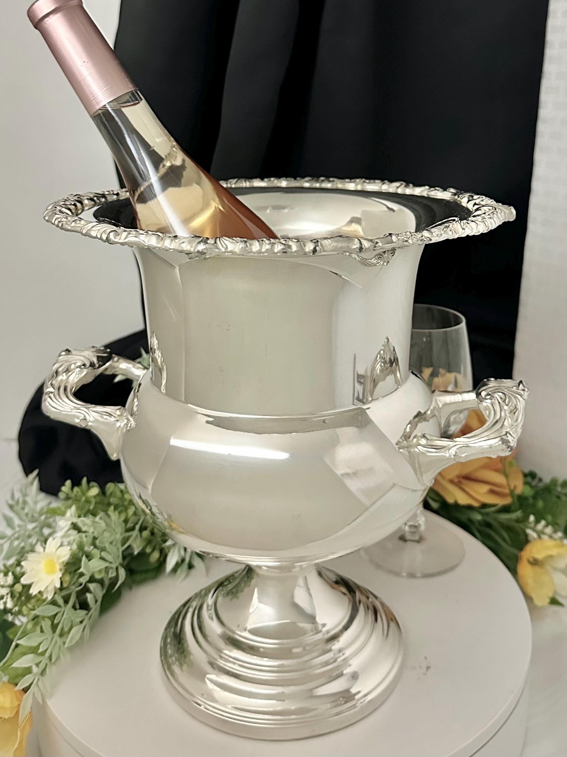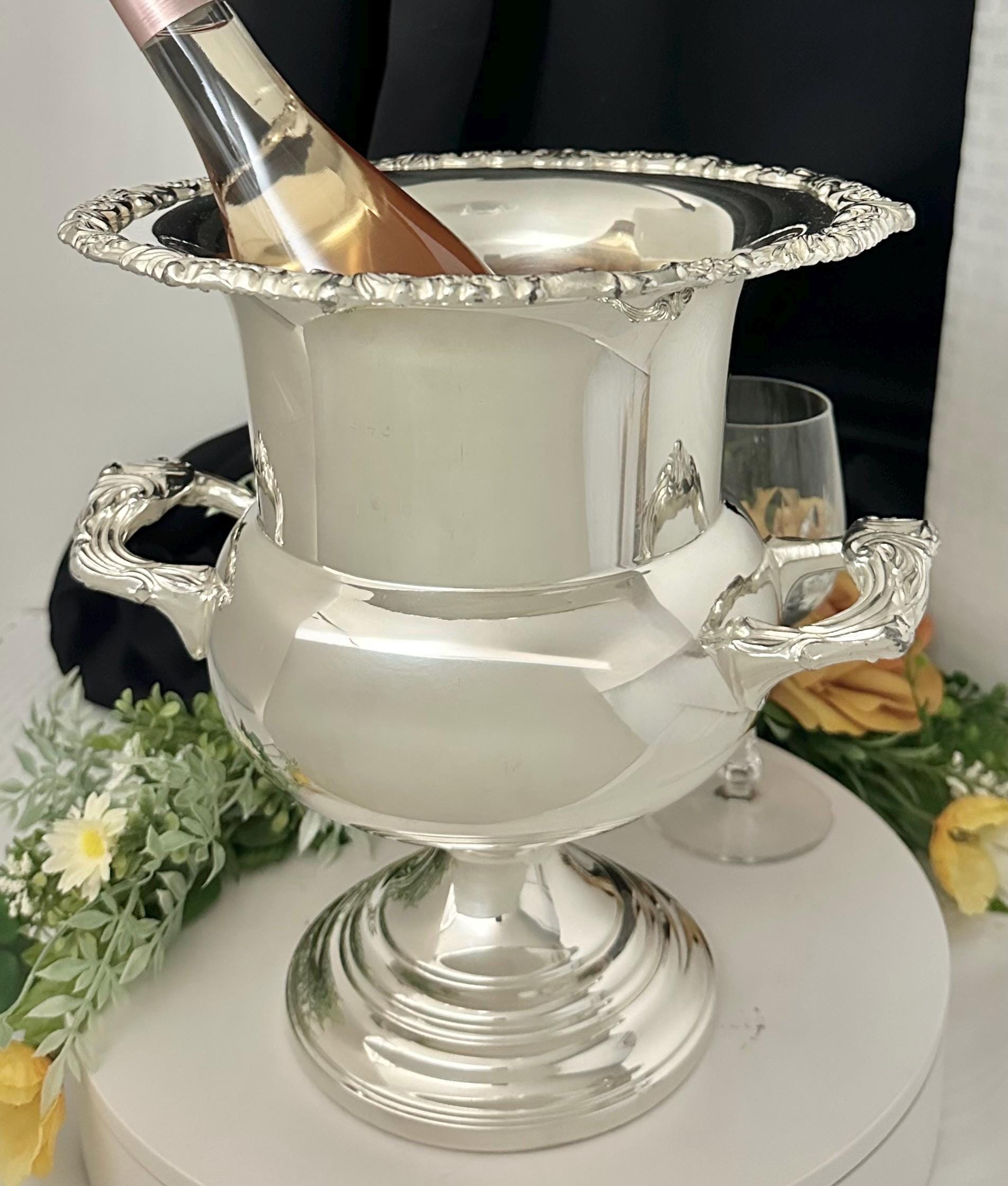 The piece is not only for holding champagne but also used as an ice bucket, flower vase, flower urn to trophy vase and is not monogrammed. The urn is polished and will make for a lovely item to be used and kept for years to come.