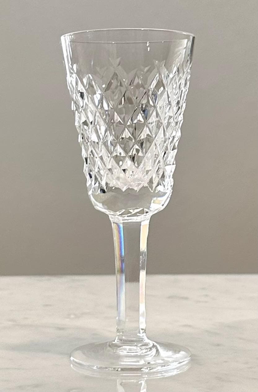 Elevate your collection with this Alana Waterford Crystal Sherry Glass. This is for 1 elegantly crafted glass designed to impress. Made in Ireland, the crystal's pristine clarity is complemented by the sophisticated diamond cuts, creating a traditional look that's both timeless and chic. The glass has a height of 5 1/8 inches and a diameter of 2 1/8 inches approximately. This holds 2 Oz of liquid.