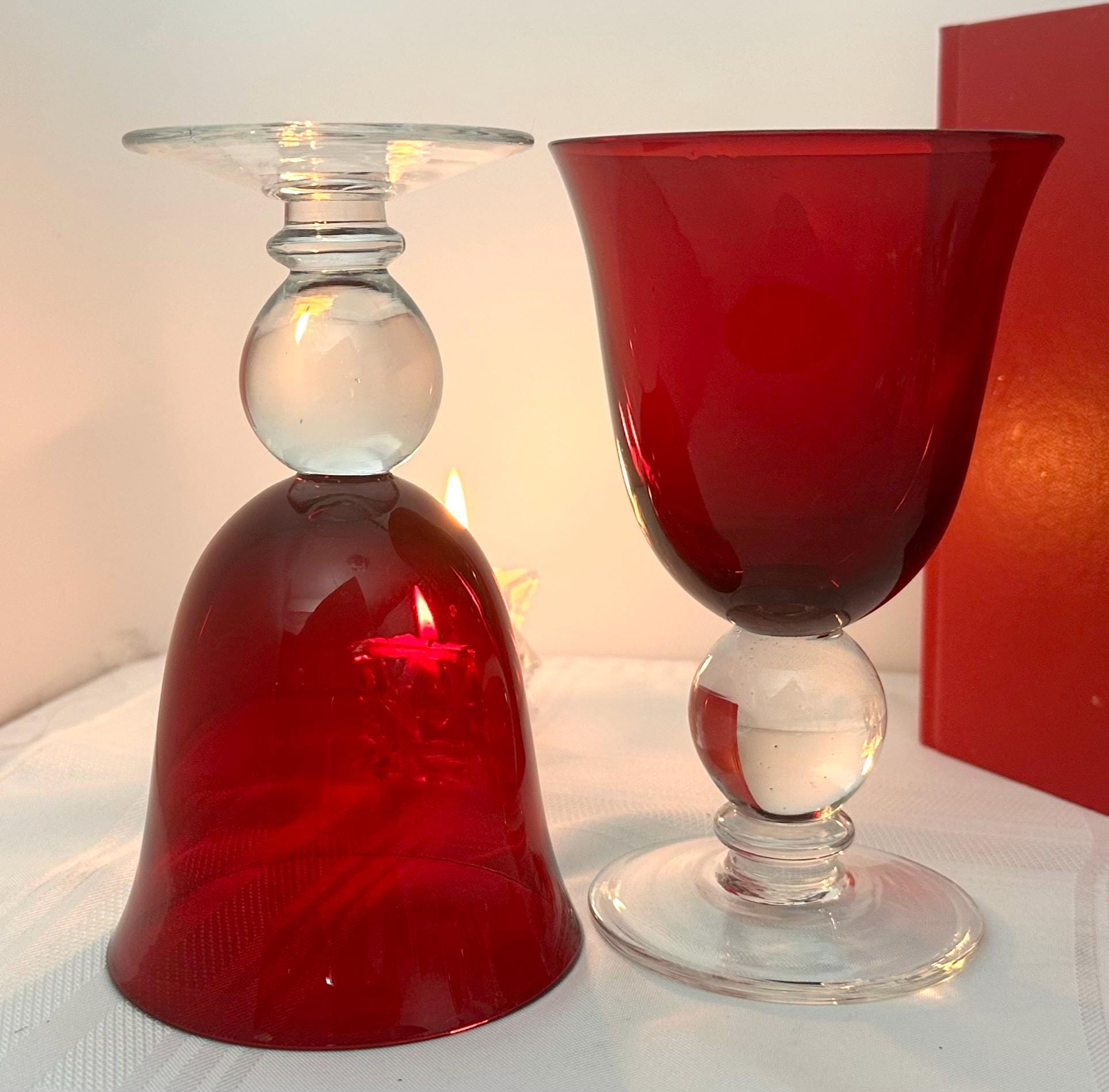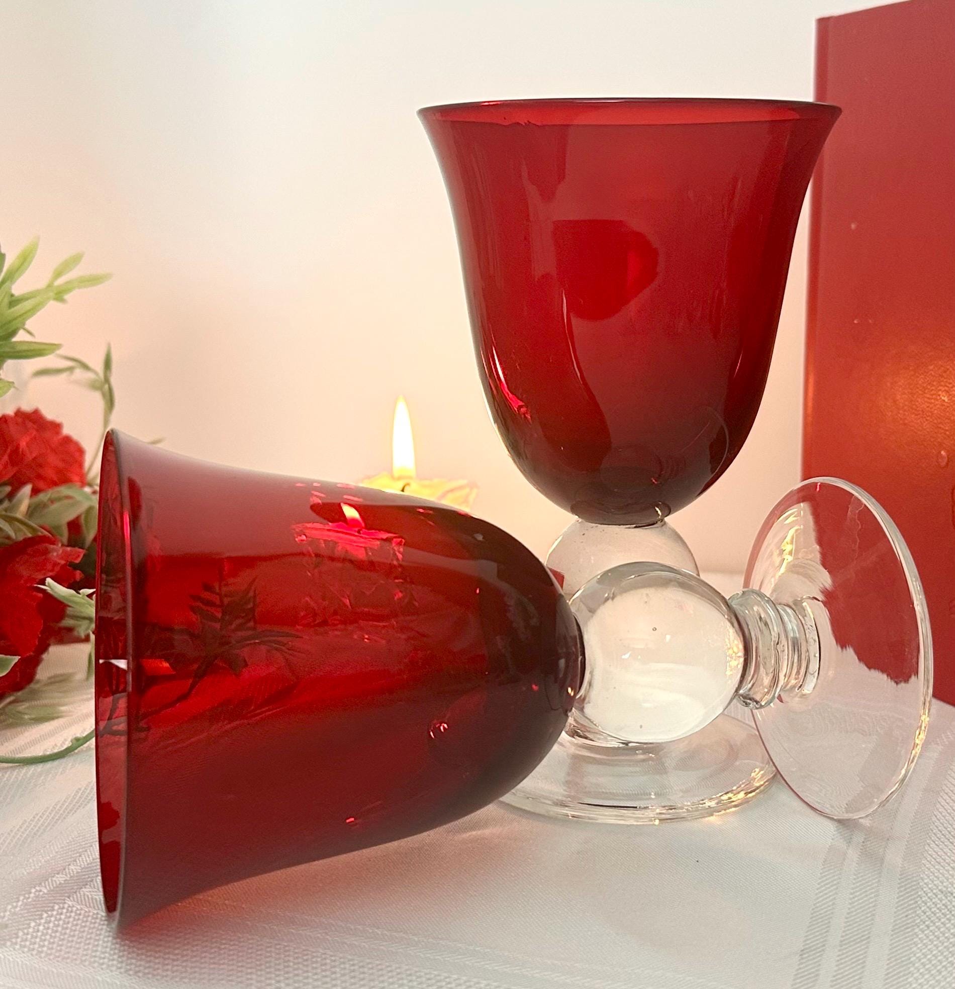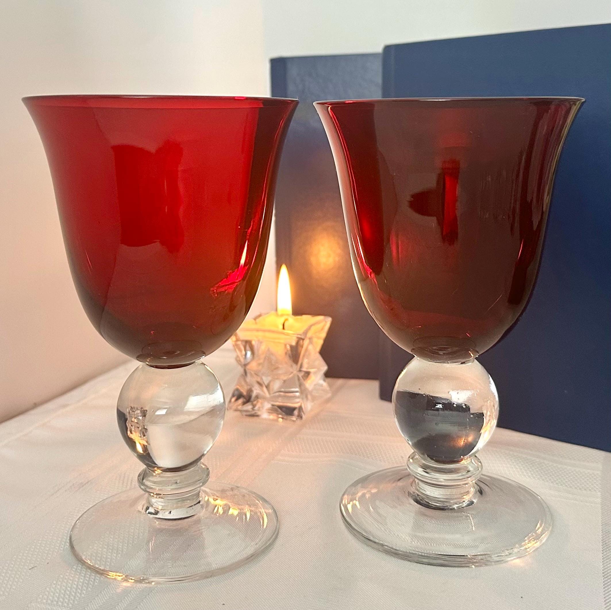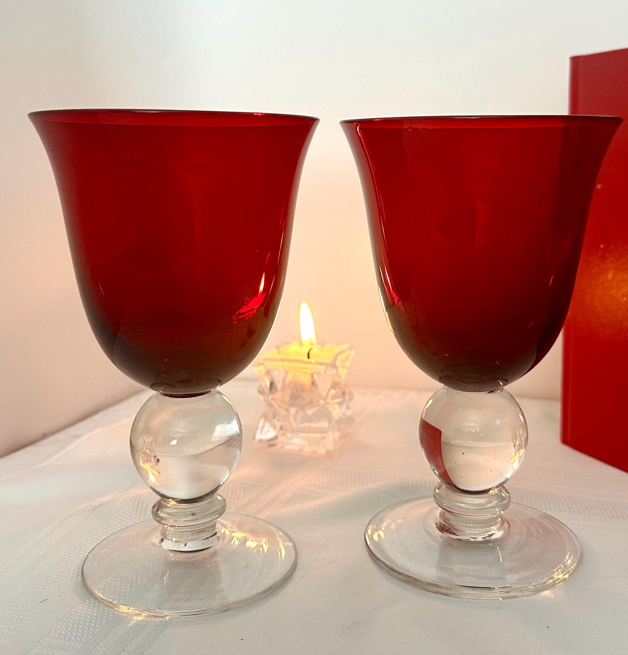 This is for a pair of Ruby Red Vintage Water Glasses with a clear ball stem. This style is a charming addition to any home bar or kitchen collection. Made of ruby red blown glass, these tulip round goblets have a clear ball footed stemmed design.