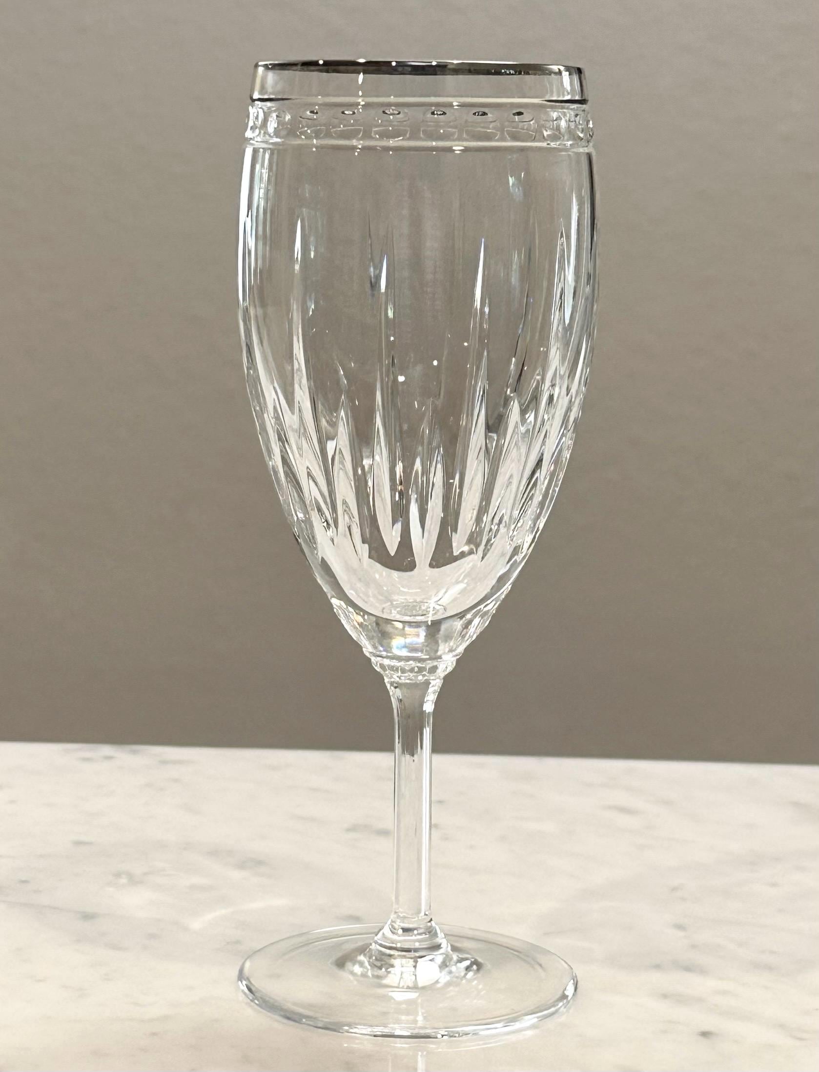 This is for 1 Lenox Jewel Platinum Iced Tea Beverage Glass. This is a vintage piece with a unique silver-rimmed design, perfect for all occasions. Made of elegant blown glass with vertical cuts and a platinum trimmed rim, this round glass features a column stem and a diameter of 2 5/8 inches.