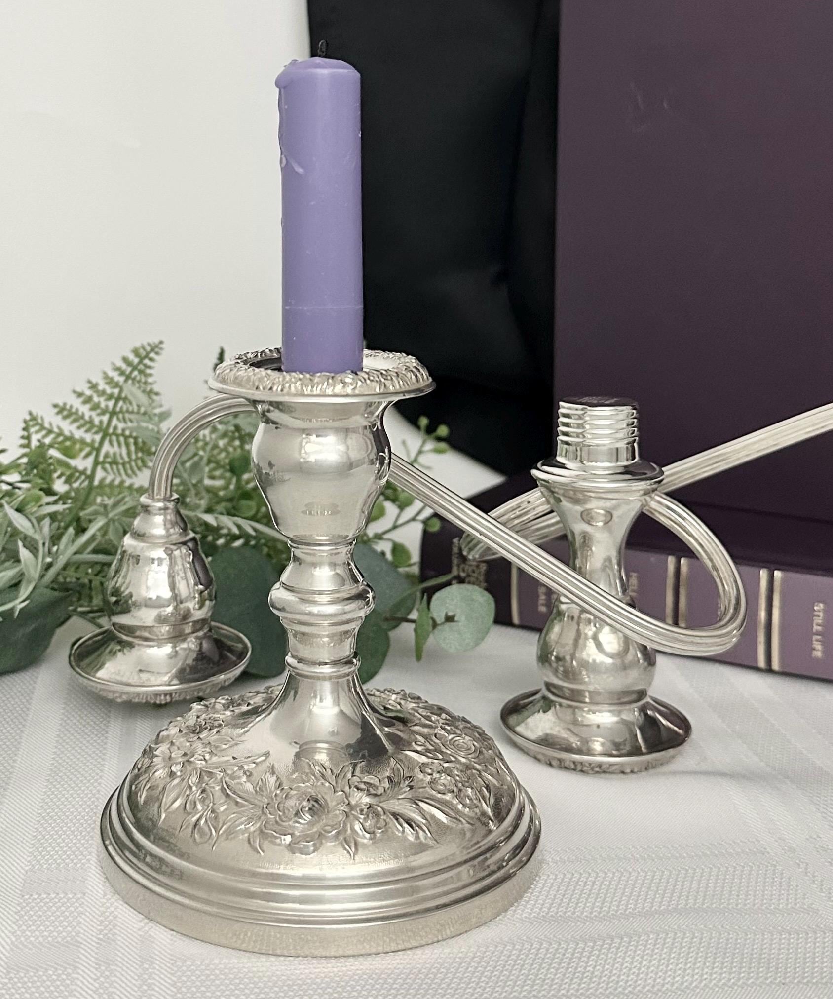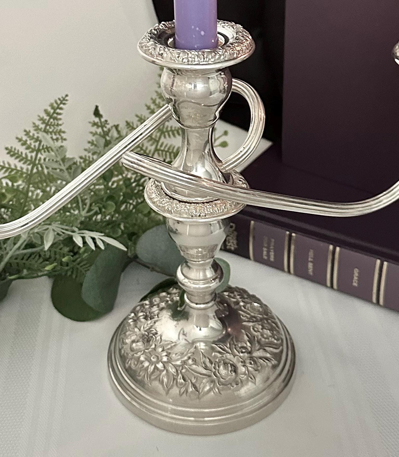 This is a discontinued piece of sterling hollowware with a floral pattern on the base and around the candle cups. The pattern is referred to as - Repousse / Chased and is a discontinued item.