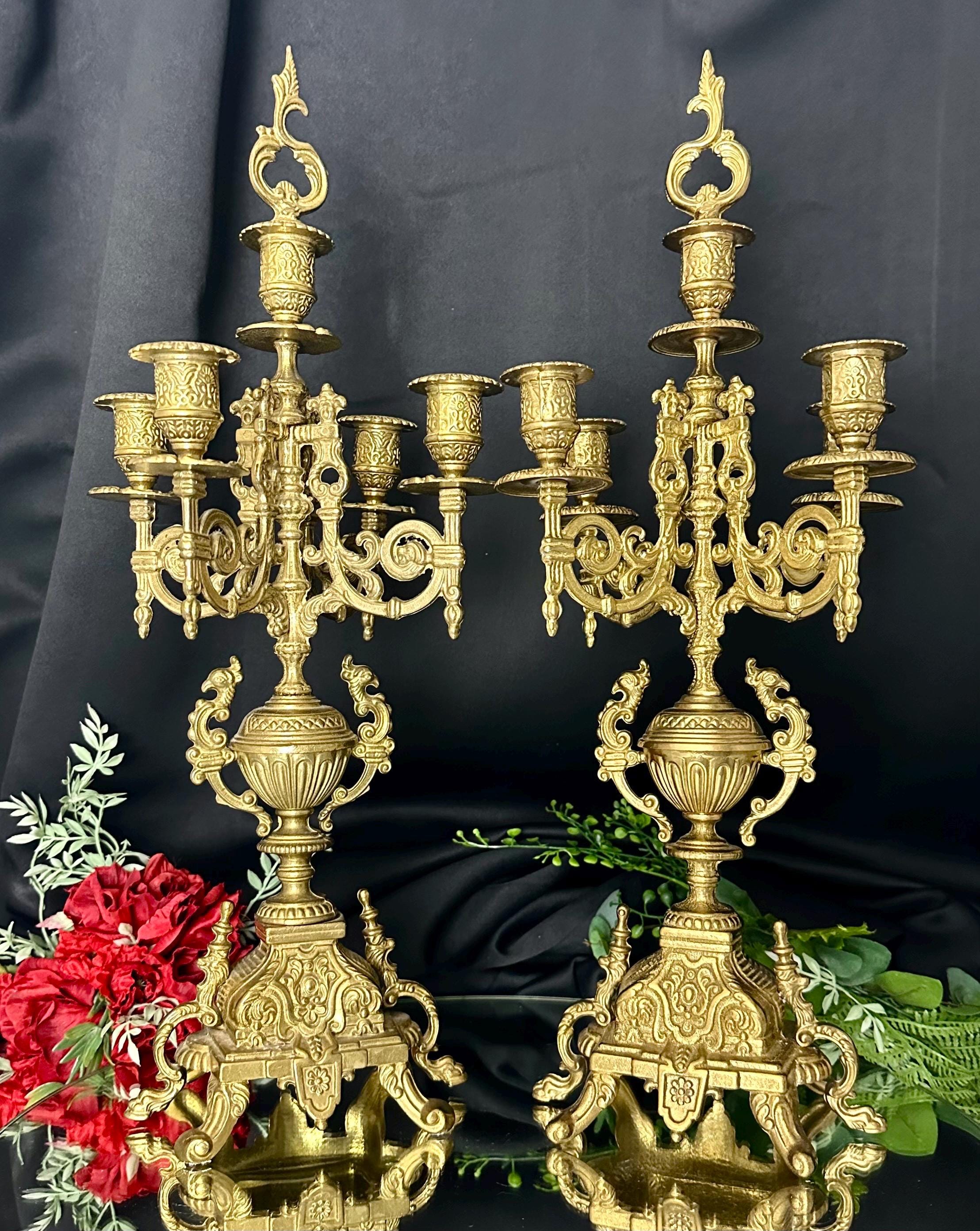 When looking at these candelabras you will see so much detail through out the entire piece. On the sides there are dragons, to scrolls and animal type feet. This is in good age appropriate vintage condition. To keep these in good condition it is recommended to remove wax drippings esp green.