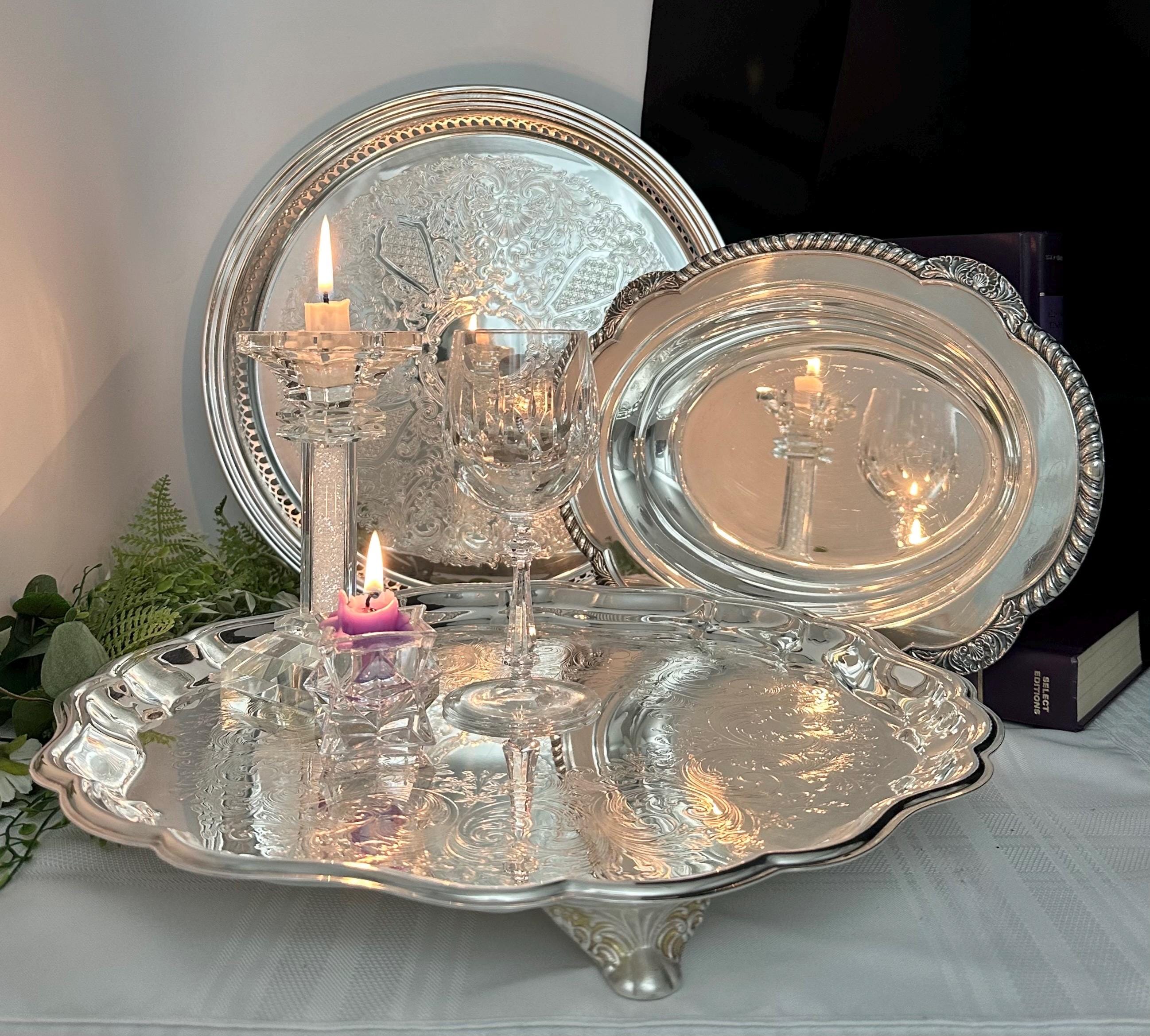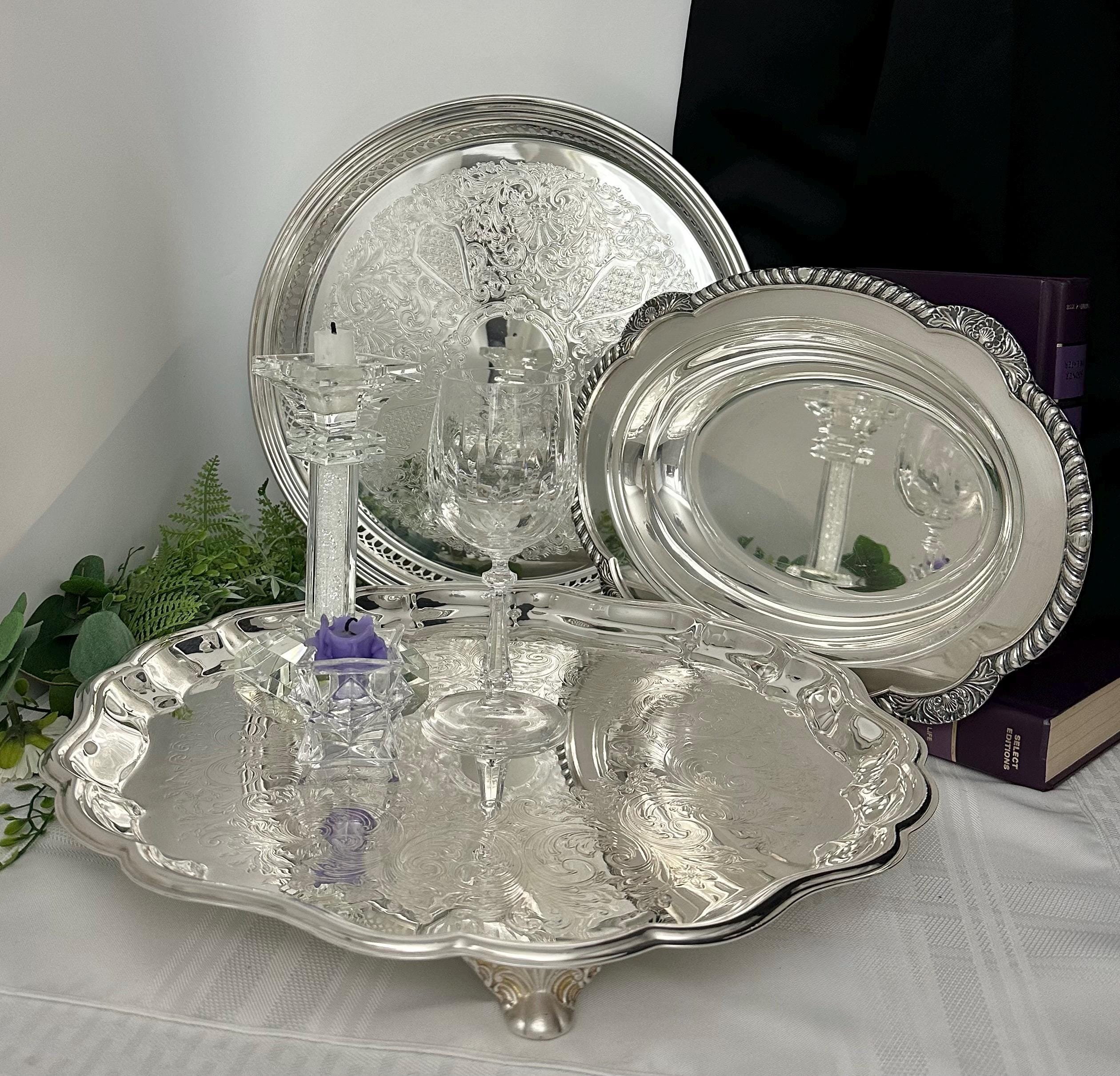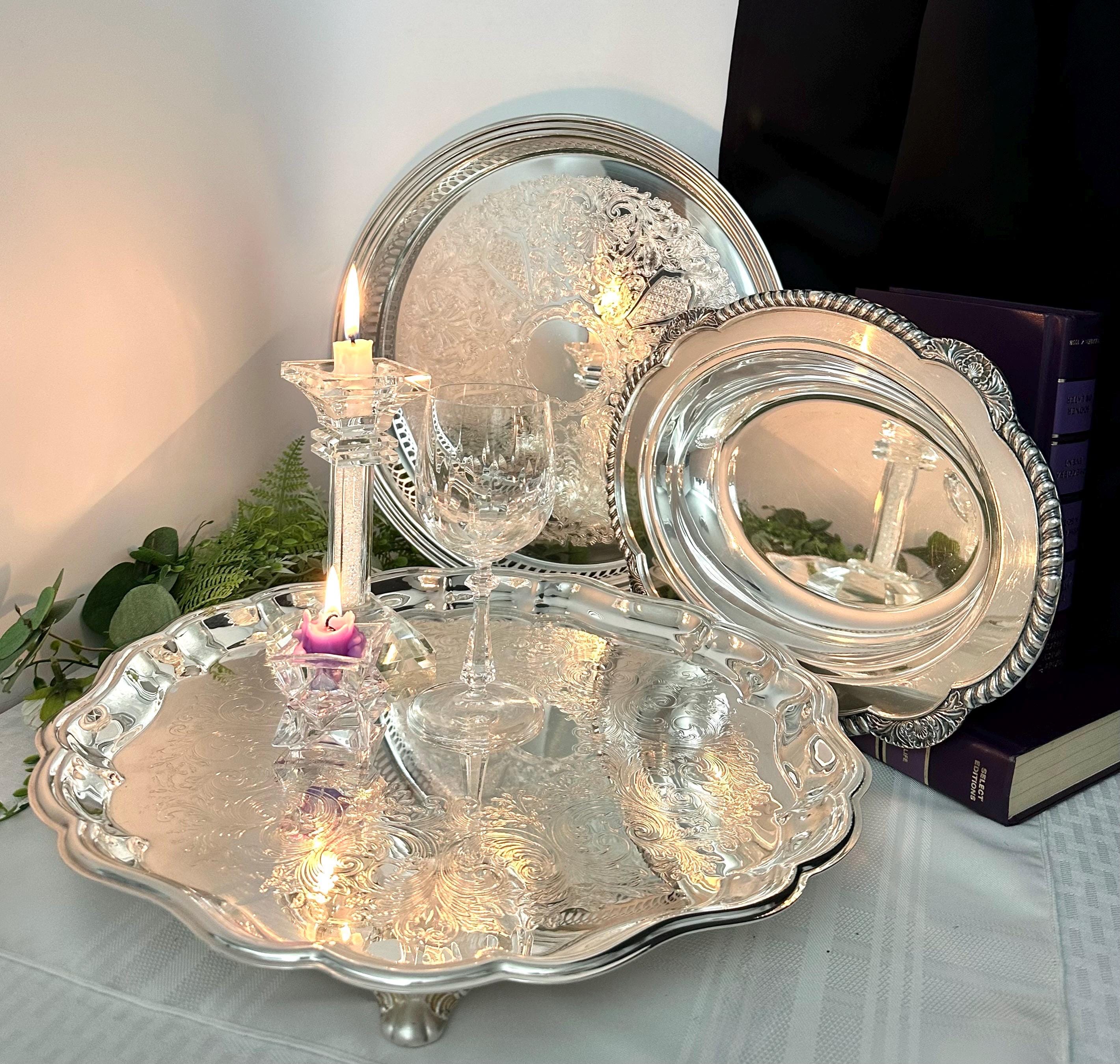 This is for a set of 3 vintage Silver Plated serving pieces. These are from various makers and in different patterns. These are wonderful for holding items like candles, tea set pieces to serving dishes. These are polished and in wonderful condition.