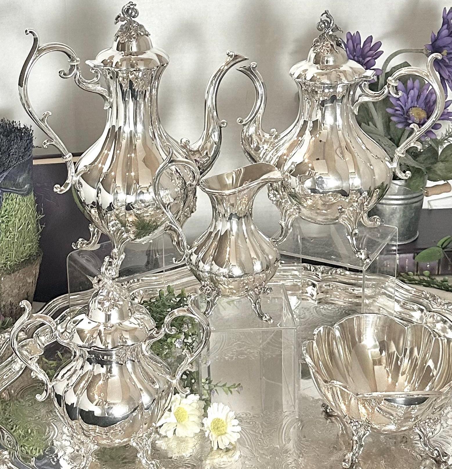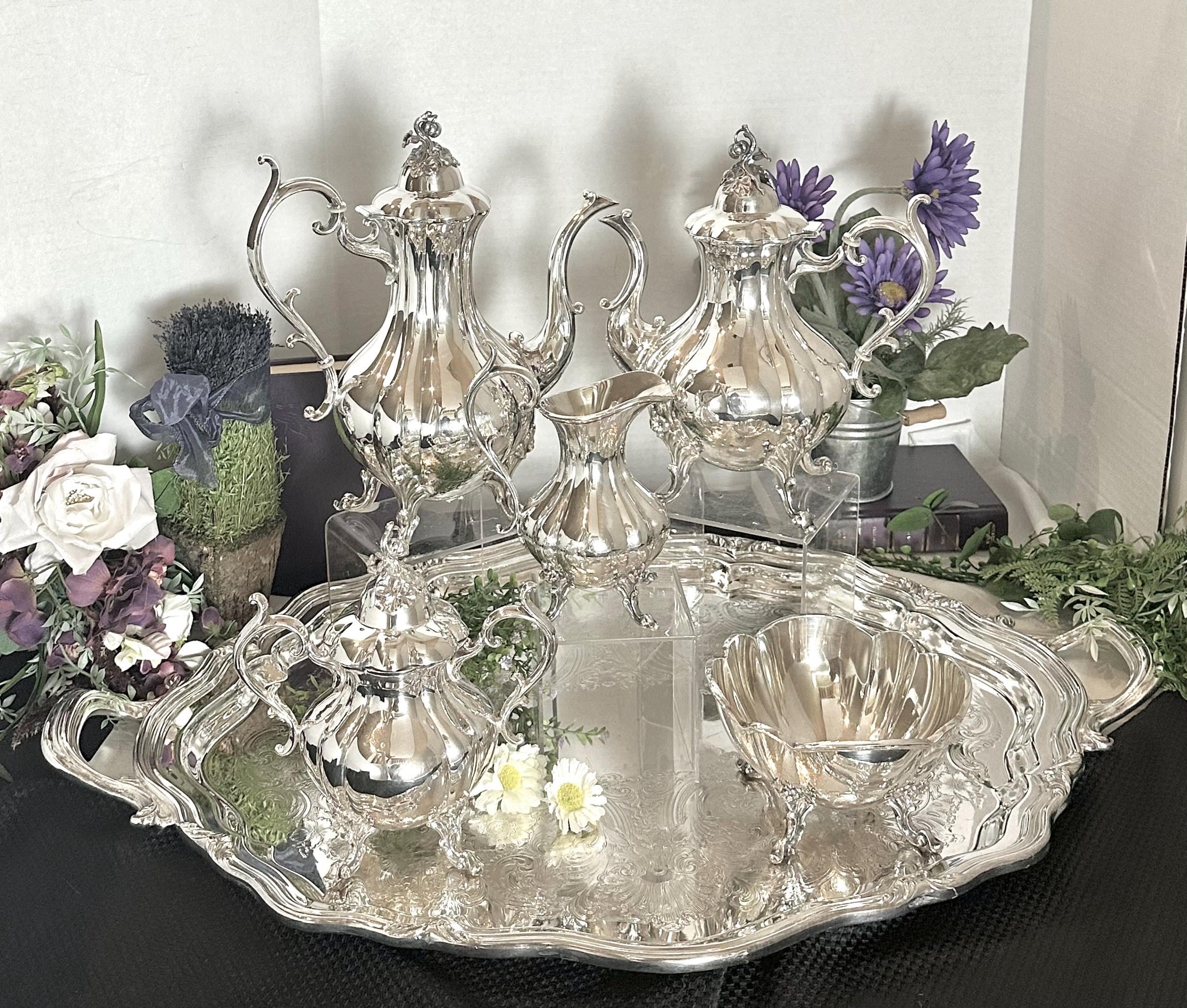 The silver plate is so shiny and well taken care of along with the original large matching tray. This vintage set is special and surely will be loved for years to come and be lovely display pieces as well as a set to use thru the years.