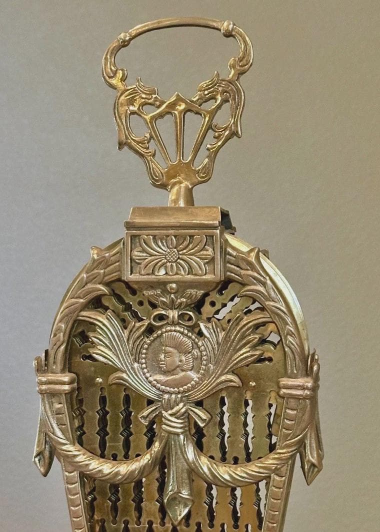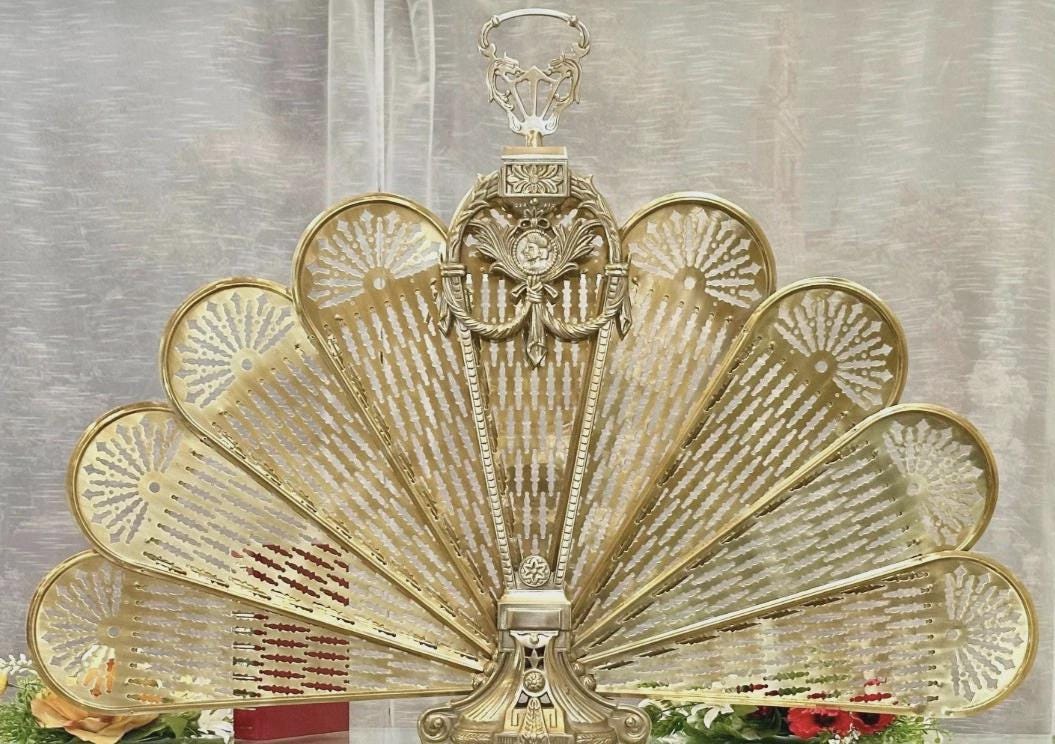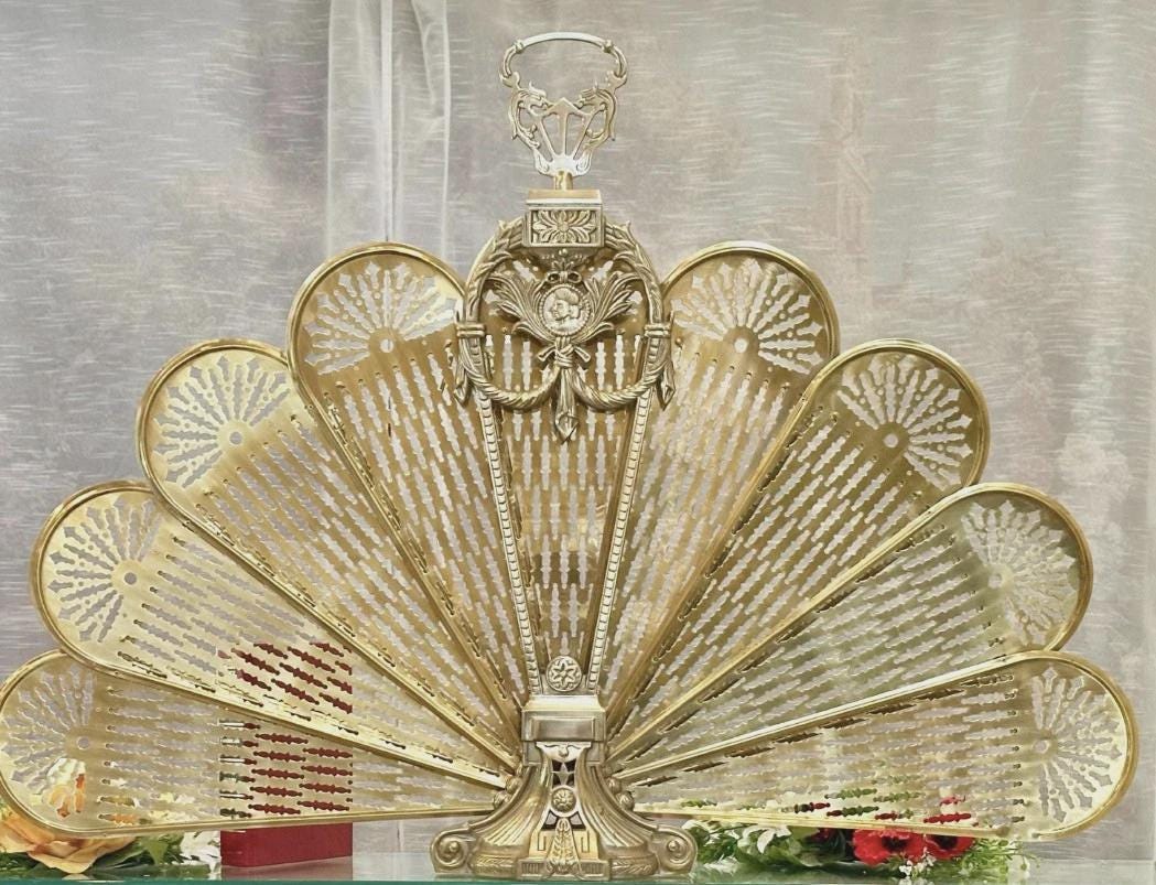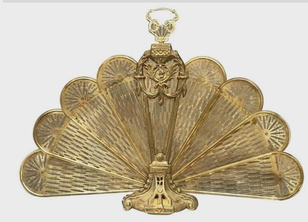 This is for a wonderful Vintage brass "peacock fan" fireplace screen. It looks lovely open and yet still very decorative when sitting closed. This lovely piece has an ornate design and is two sided with a Vintage style Cameo Face mounted on the front with a raised motif. It also is adorned with a Finial/handle in a dragon motif on the top for carrying it.