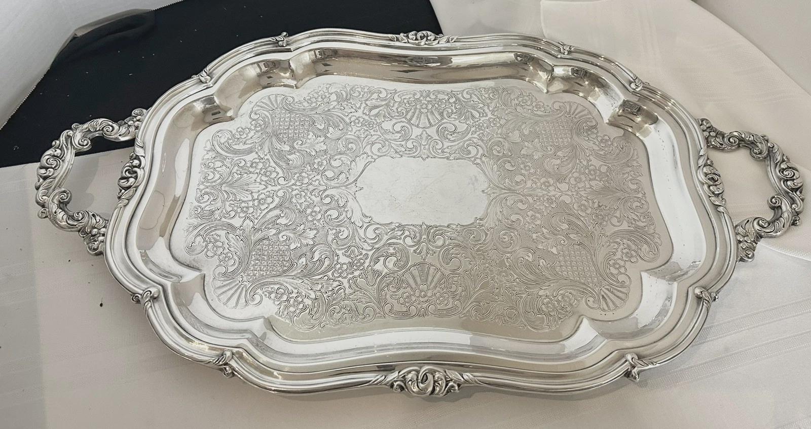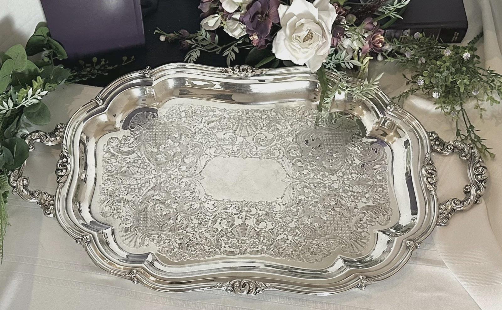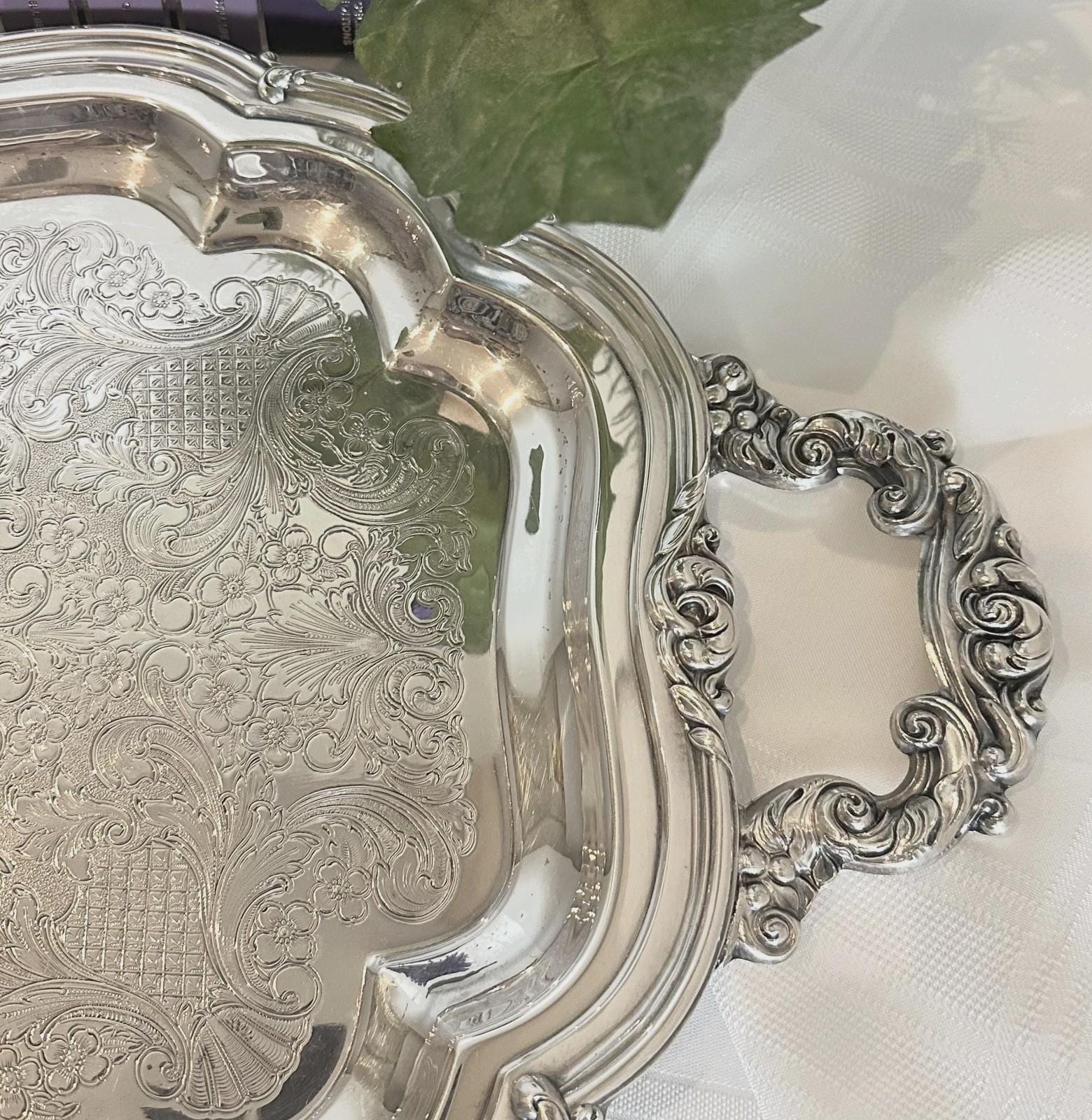 This is for a truly beautiful Silver Plated Tea Tray in the Heirloom line - Melon pattern (Doesn't state maker but matches with it being from Oneida). This is a luxurious addition to any home, featuring a beautiful swirl floral and Victorian style design. Made in the United States with silverplate composition, this tea tray / butlers serving tray is both practical and elegant. I just love this piece!