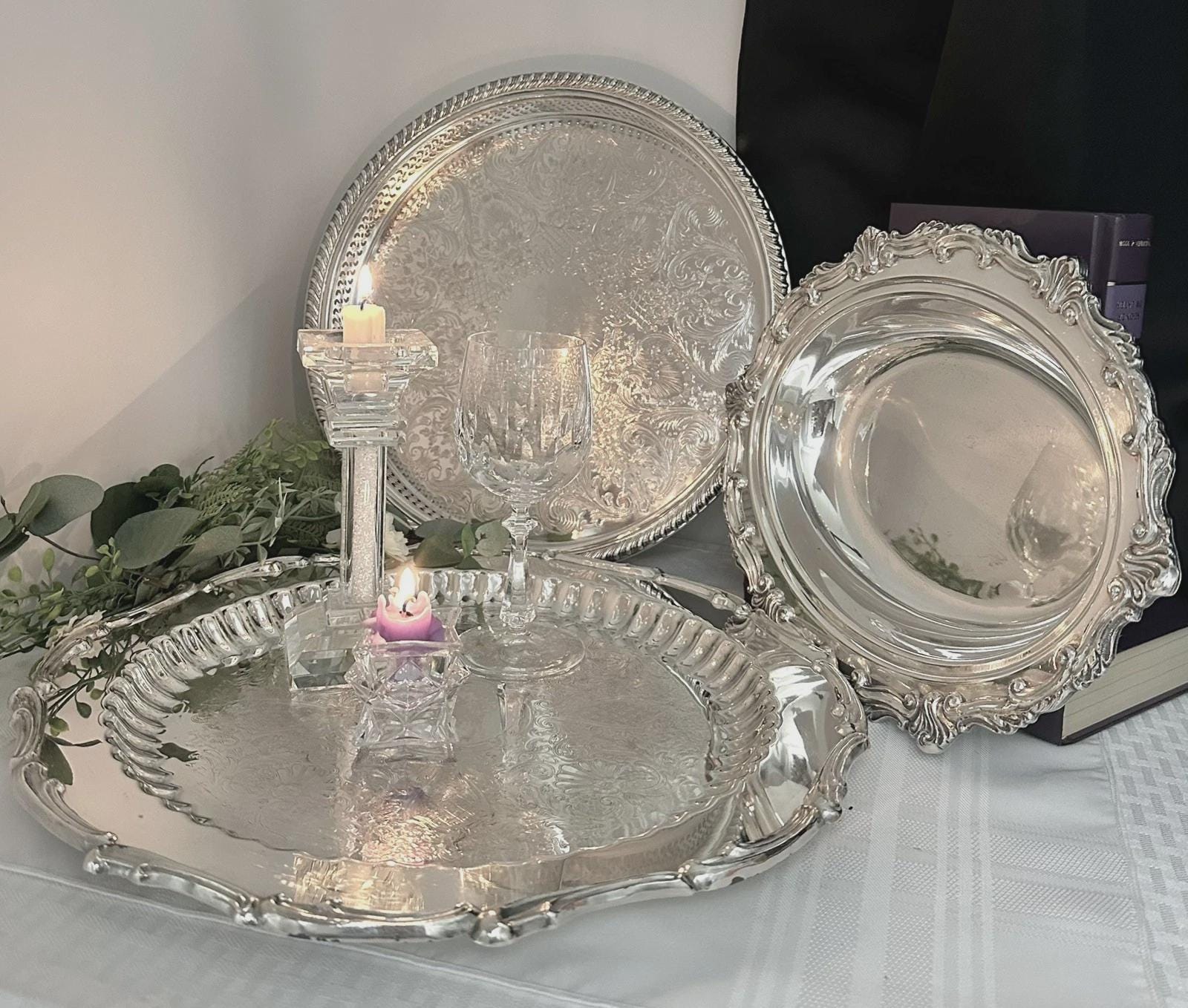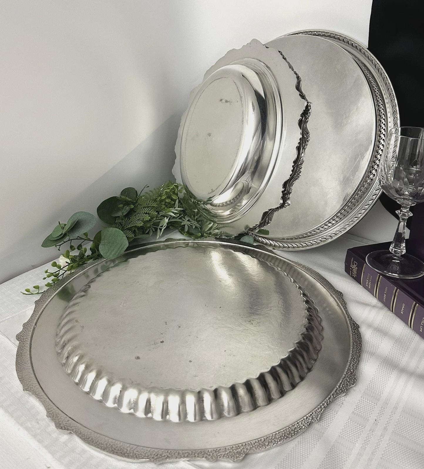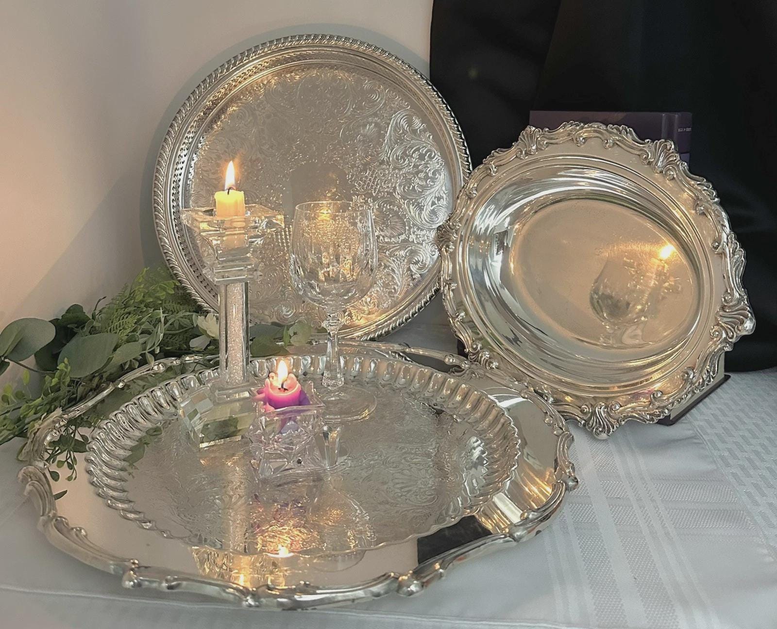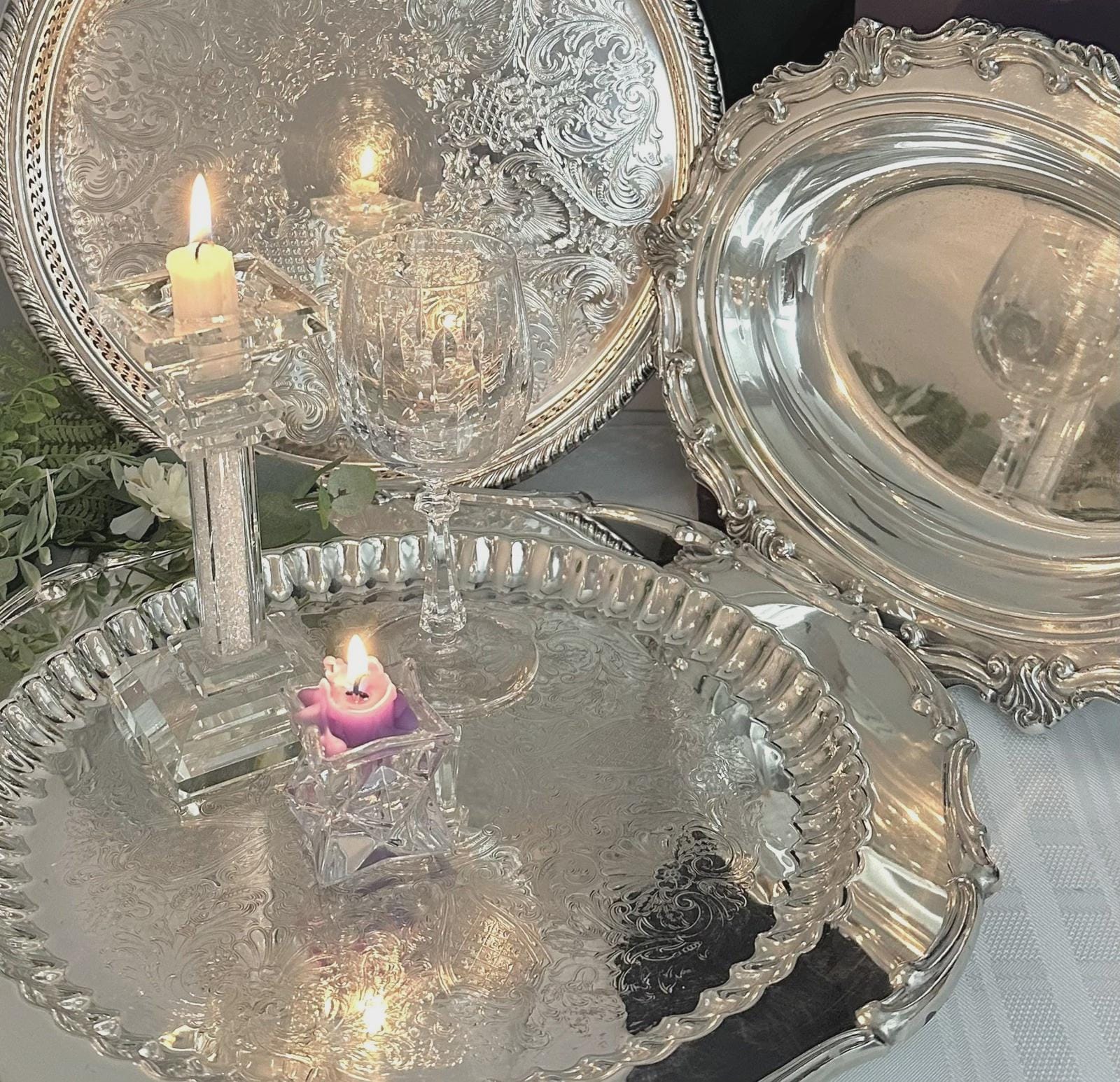 This is for a set of 3 vintage Silver Plated serving pieces. These are from various makers and in different patterns. These are wonderful for holding items like candles, tea set pieces to serving dishes. These are polished and in wonderful condition.