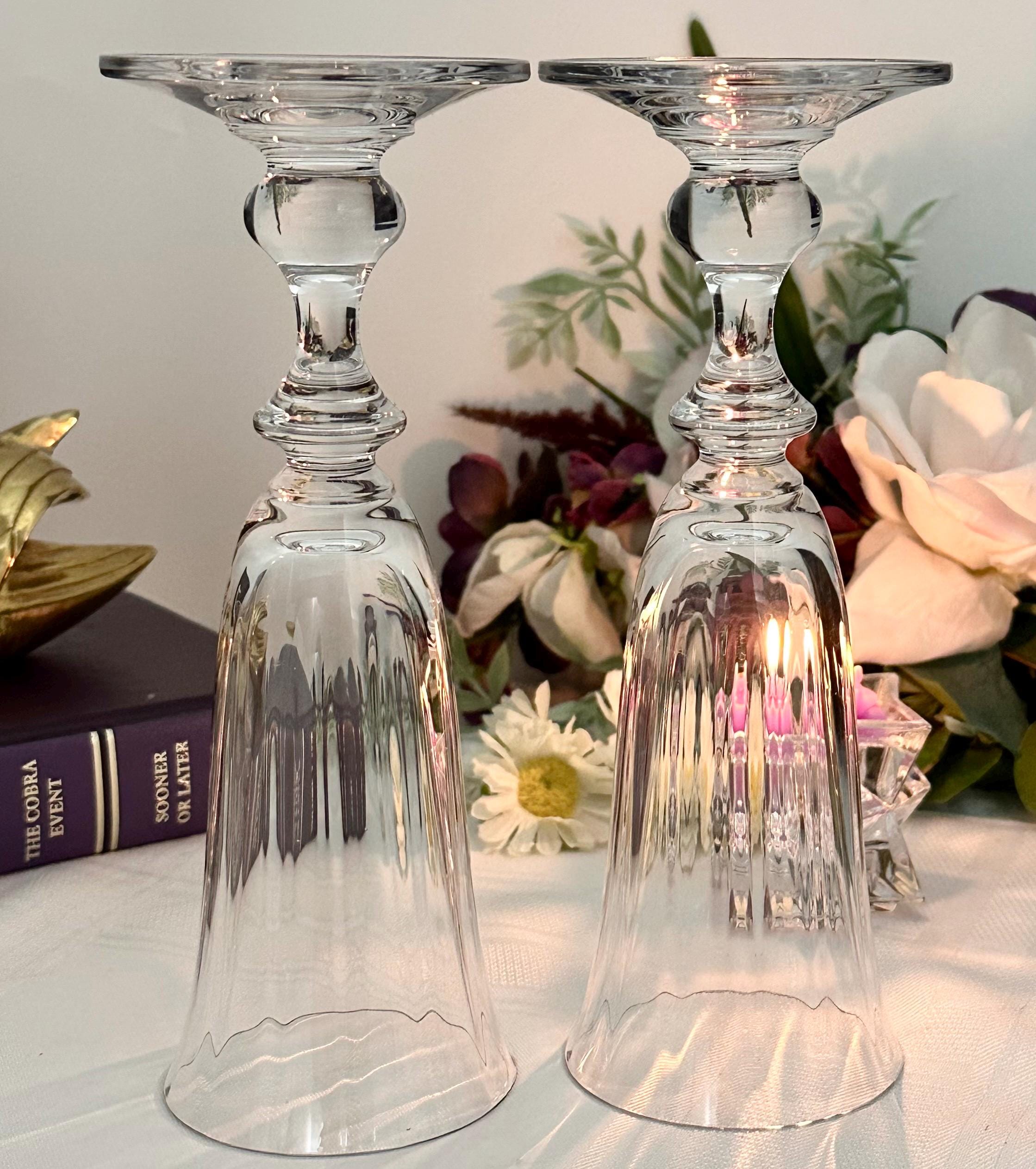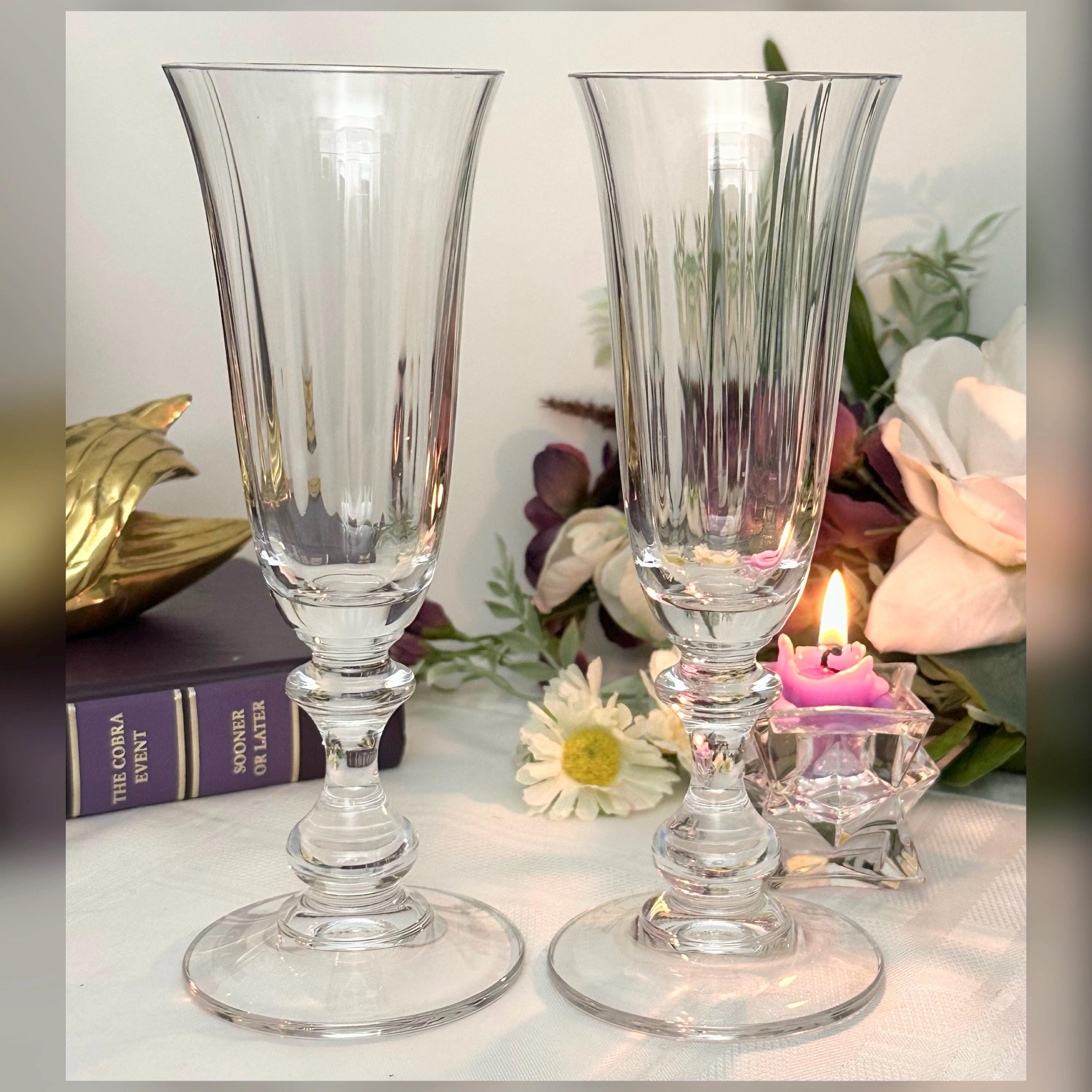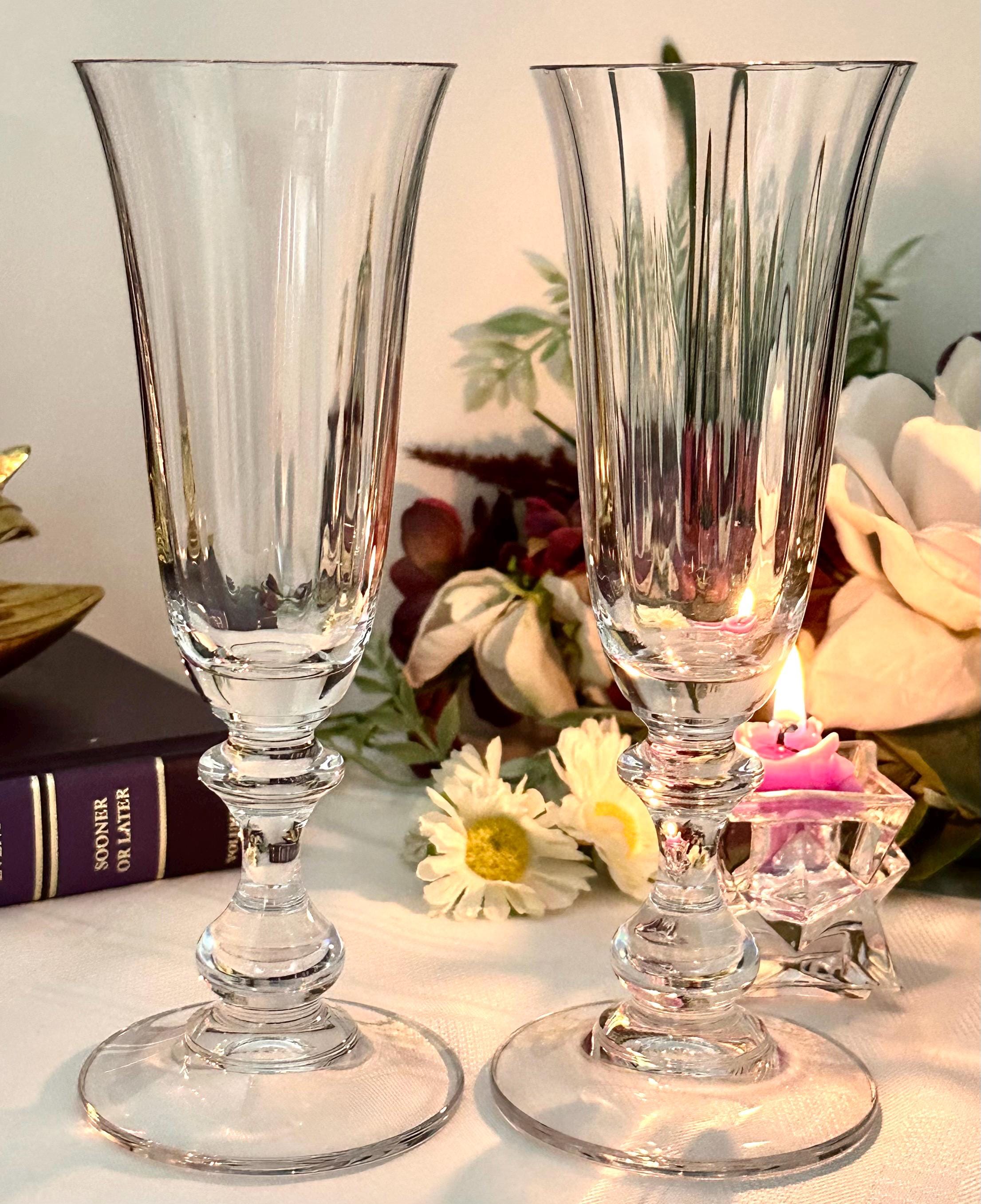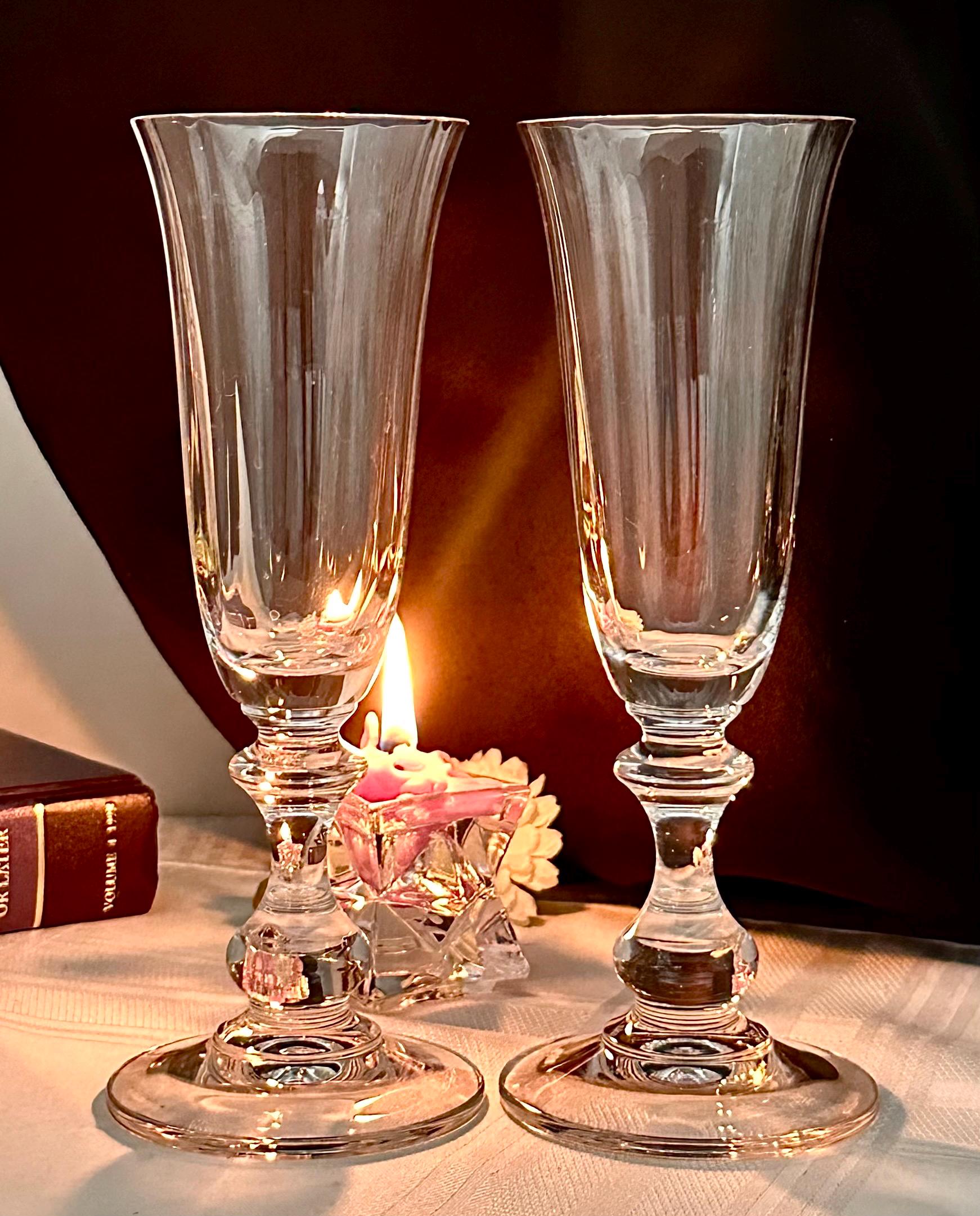 This if for 2 Vintage Champagne Flutes in the French Countryside pattern. The bowl is Clear with a decorated knobed stem and are blown glass. These were produced from 1990 - 2016. These measure: 7 5/8 inches tall x 2 5/8 inches in diameter. These are perfect glasses to toast for any special occasion such as a Wedding to anniversary. These are in wonderful condition and would make for perfect replacement glasses or to start a new set.