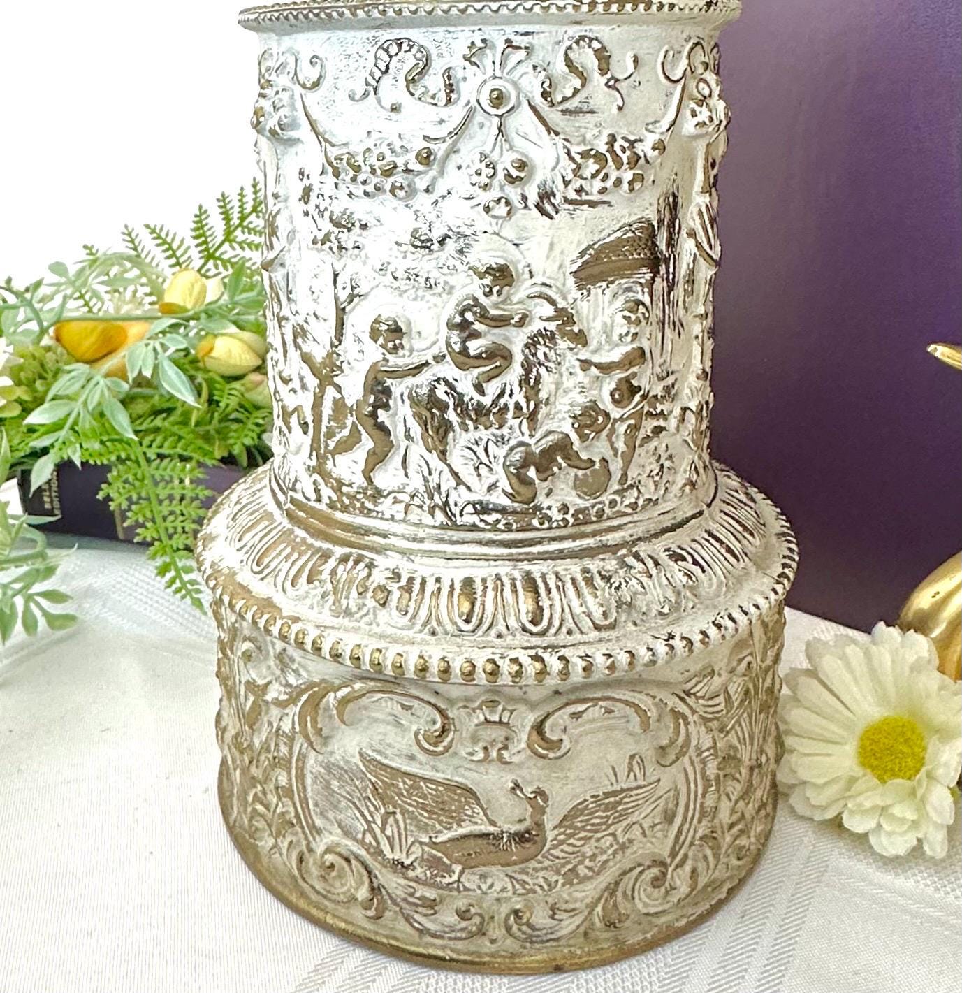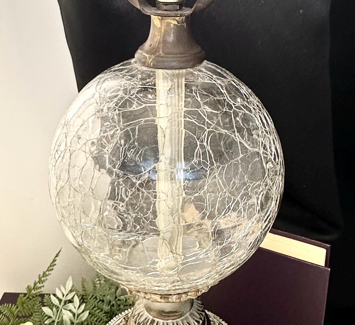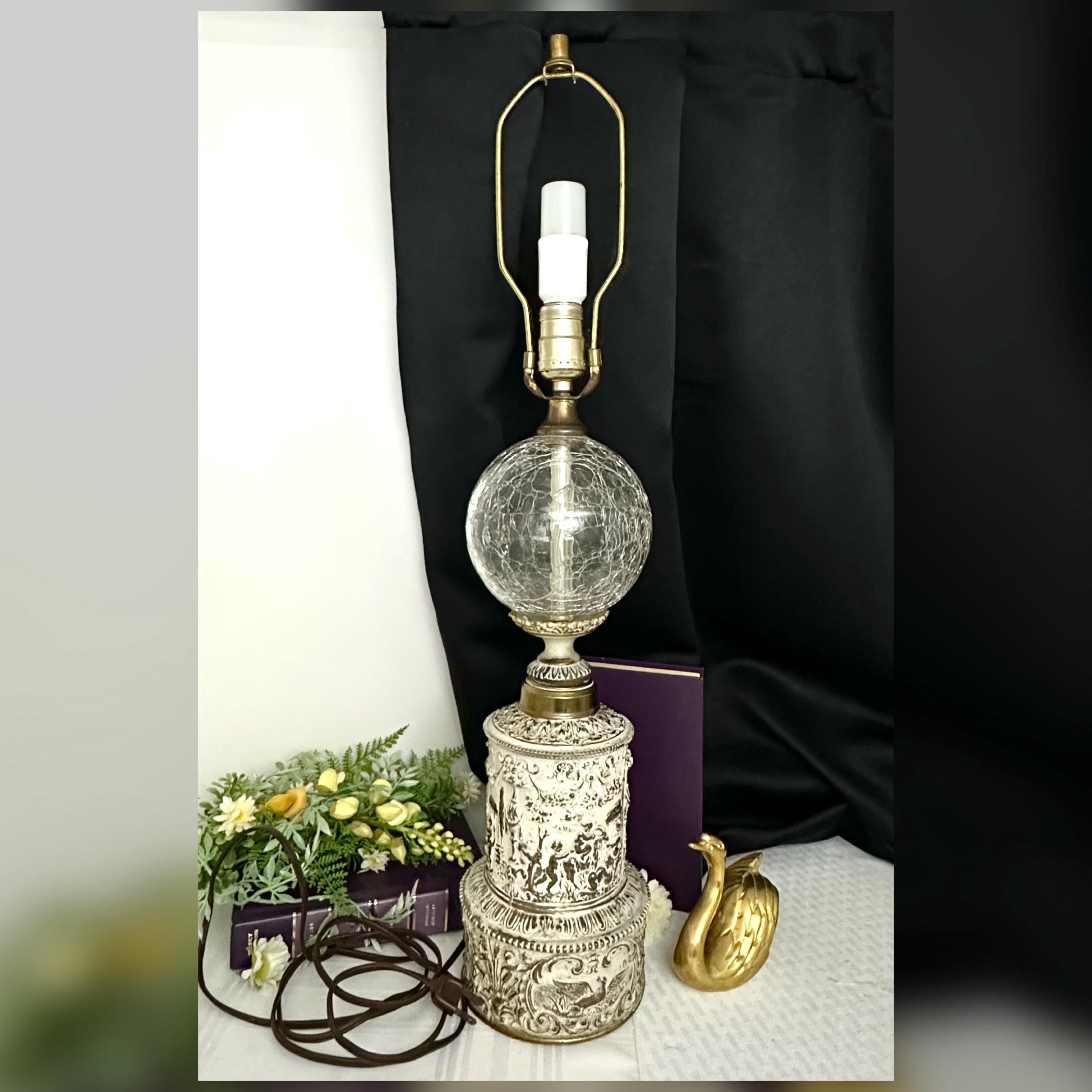 This is for a unique Brass Cherub Table Lamp. This lovely vintage piece has a Crackle Glass Sphere in the stem on top of the white washed Brass Angel Lamp base. The base is full of angels / cherubs playing along with birds and ribbons.