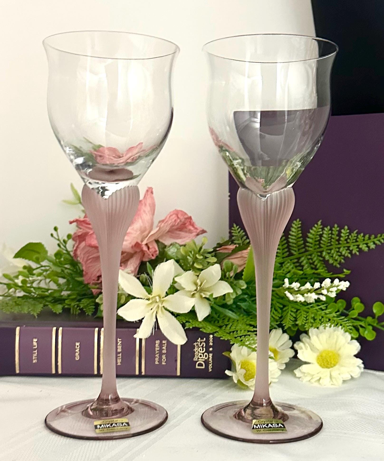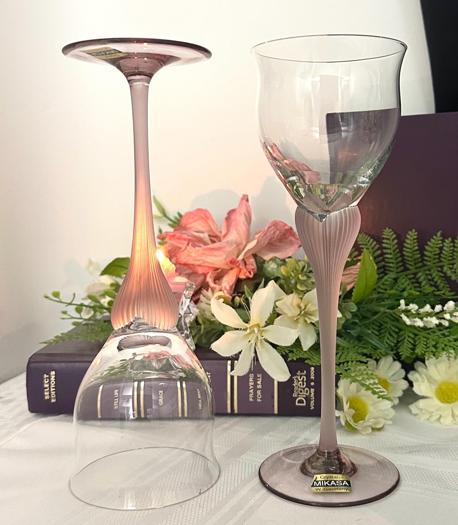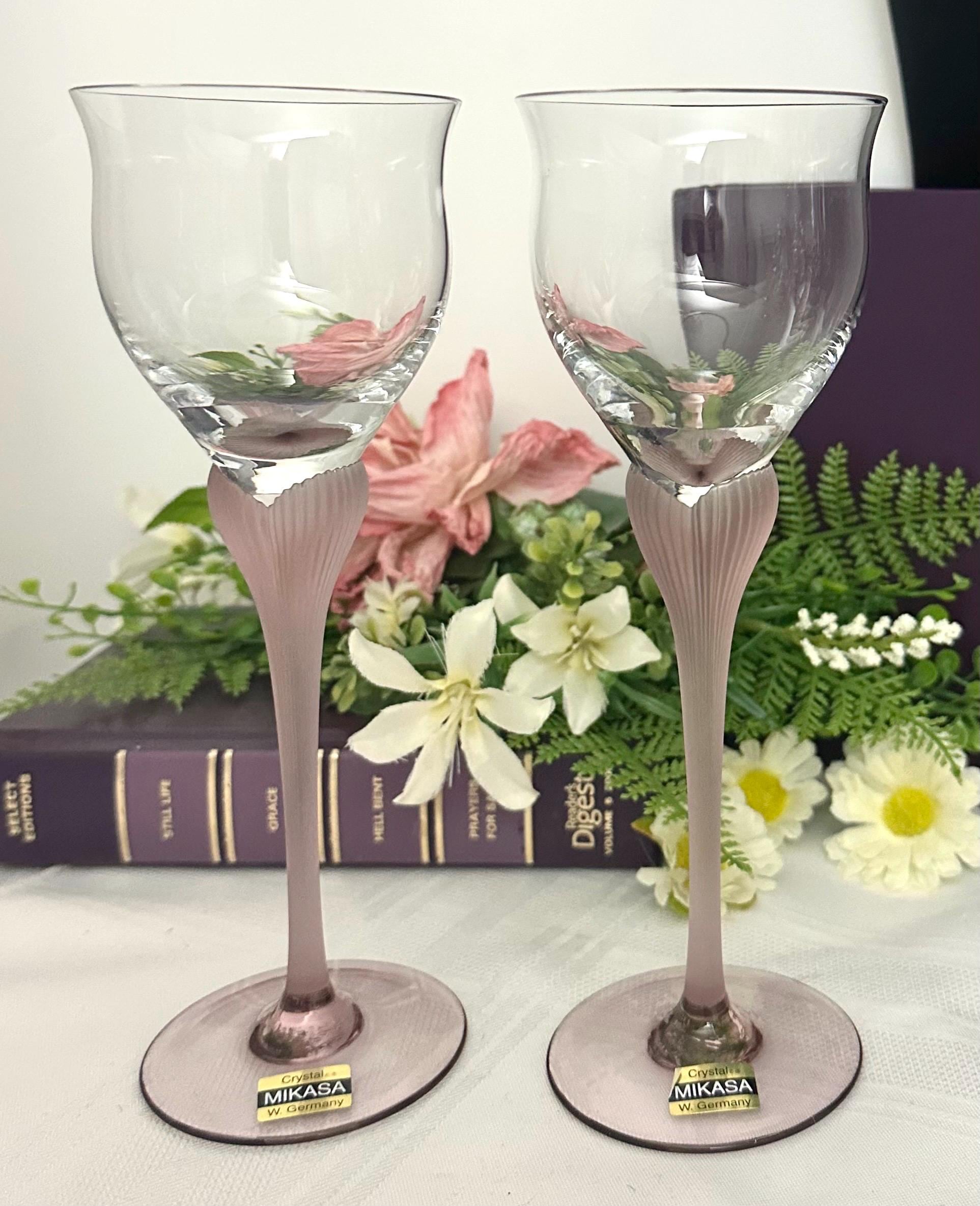 This is for 2 vintage Mikasa Sea Mist frosted stem Wine glasses. The lovely unique frosted Amethyst / pink stem add a stylish addition to any kitchen or dining room. The two-piece set includes elegant round water goblets that are perfect for all occasions and are designed with a ribbed stem for added detail.