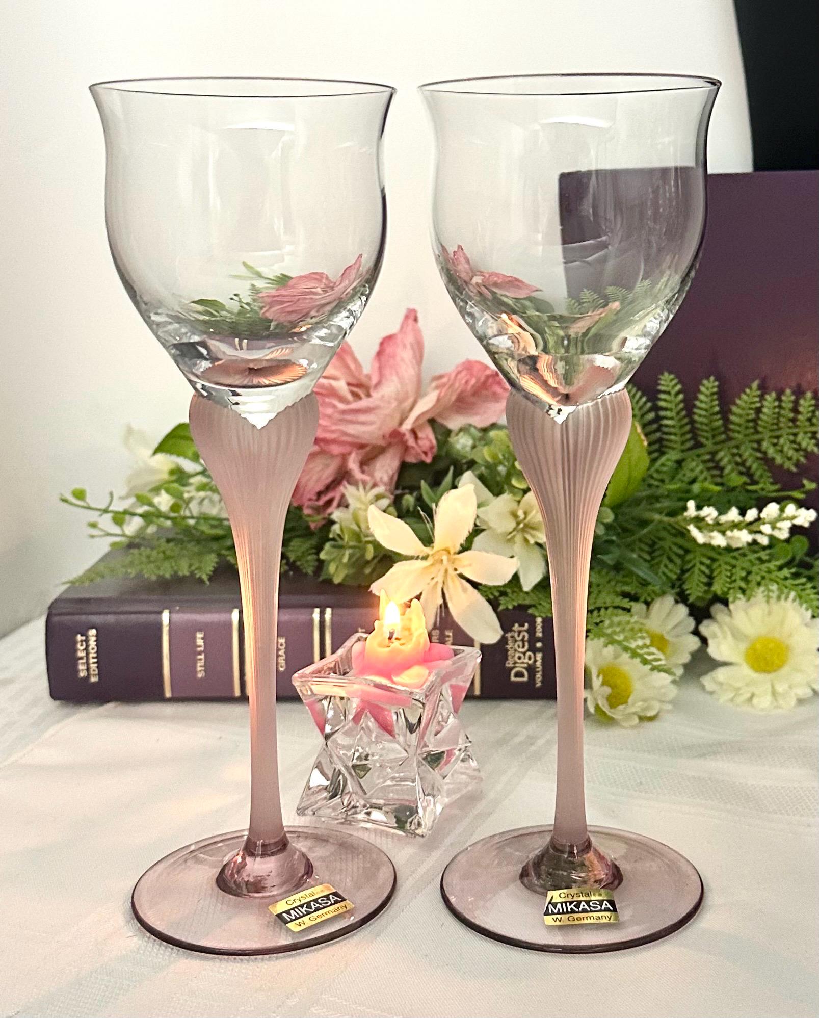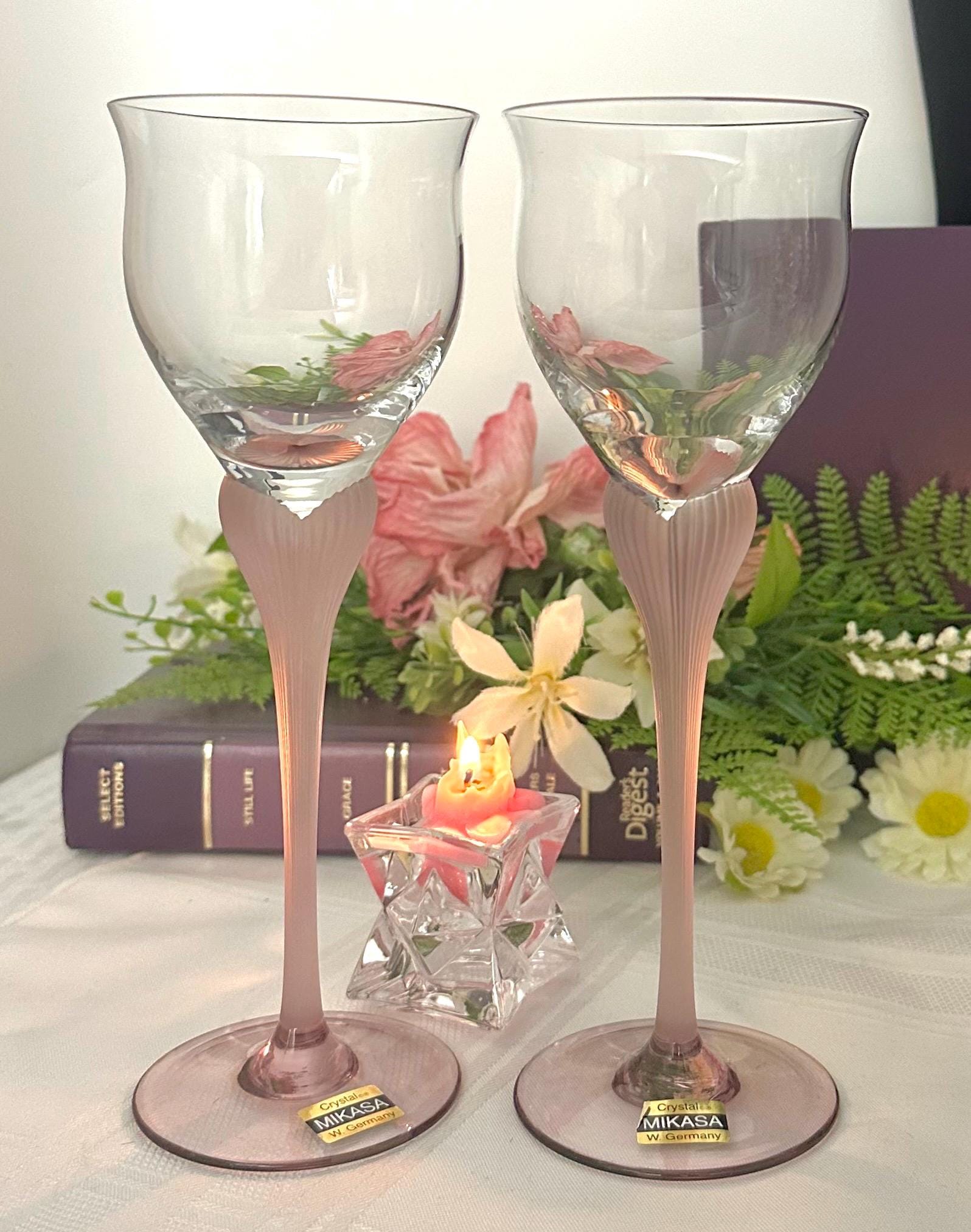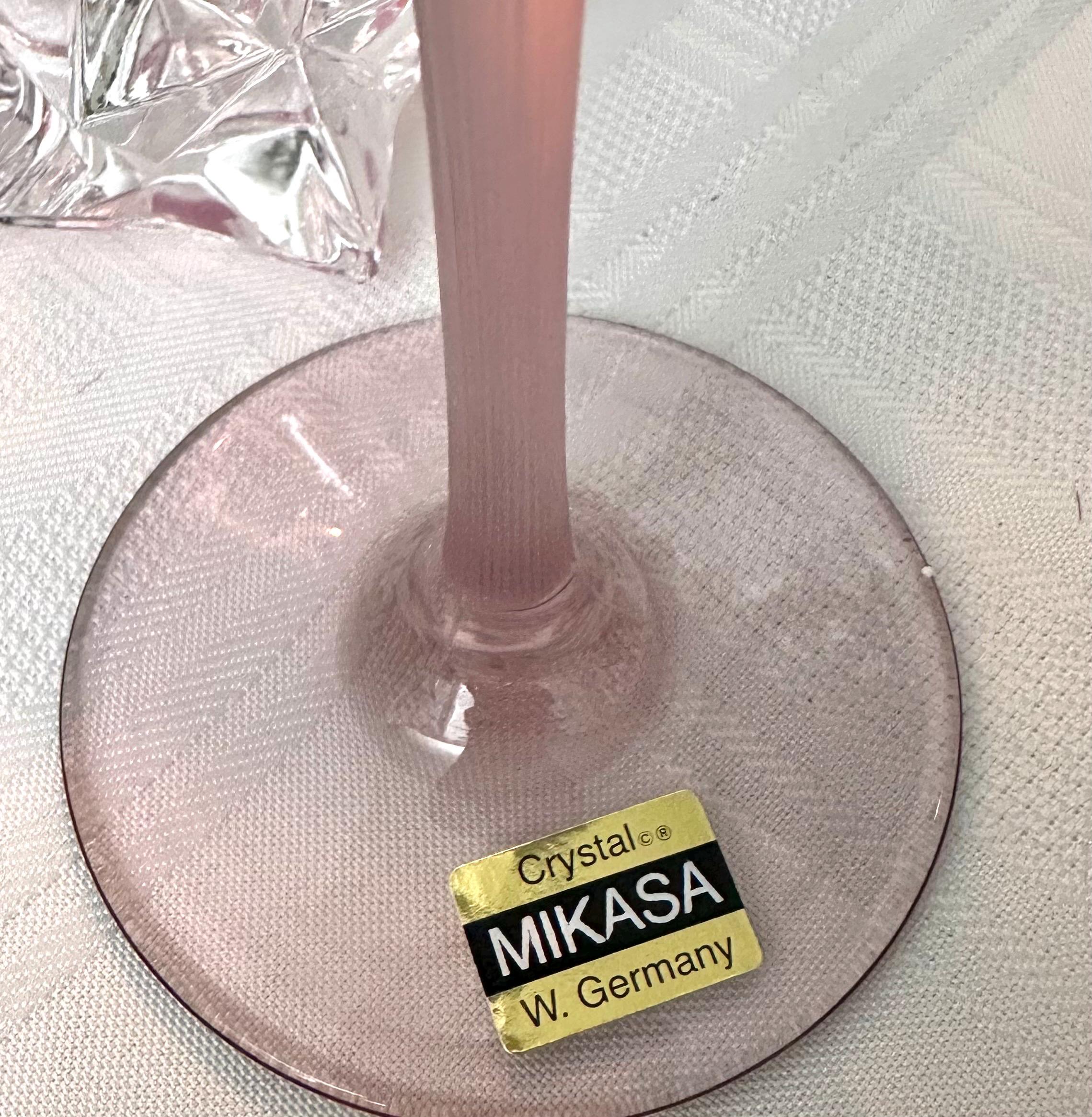 This is for 2 vintage Mikasa Sea Mist frosted stem Wine glasses. The lovely unique frosted Amethyst / pink stem add a stylish addition to any kitchen or dining room. The two-piece set includes elegant round water goblets that are perfect for all occasions and are designed with a ribbed stem for added detail.