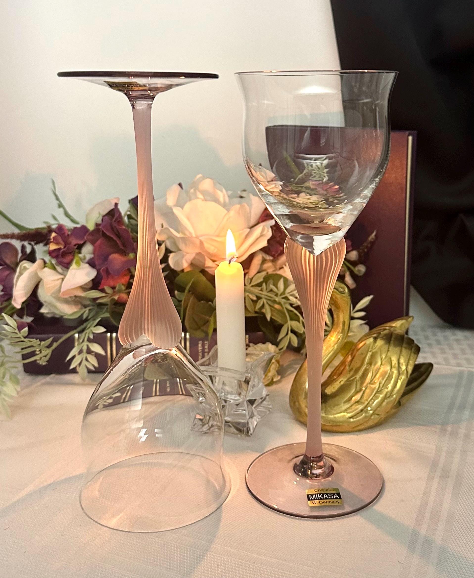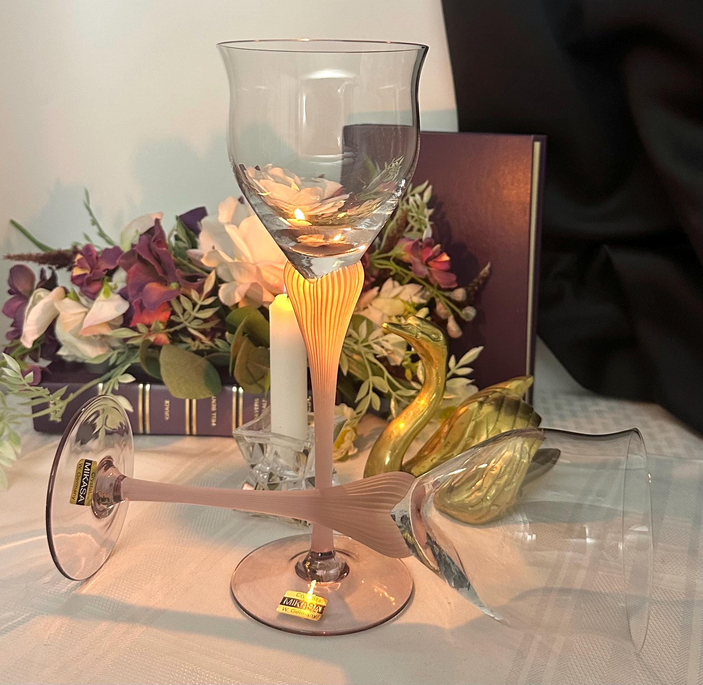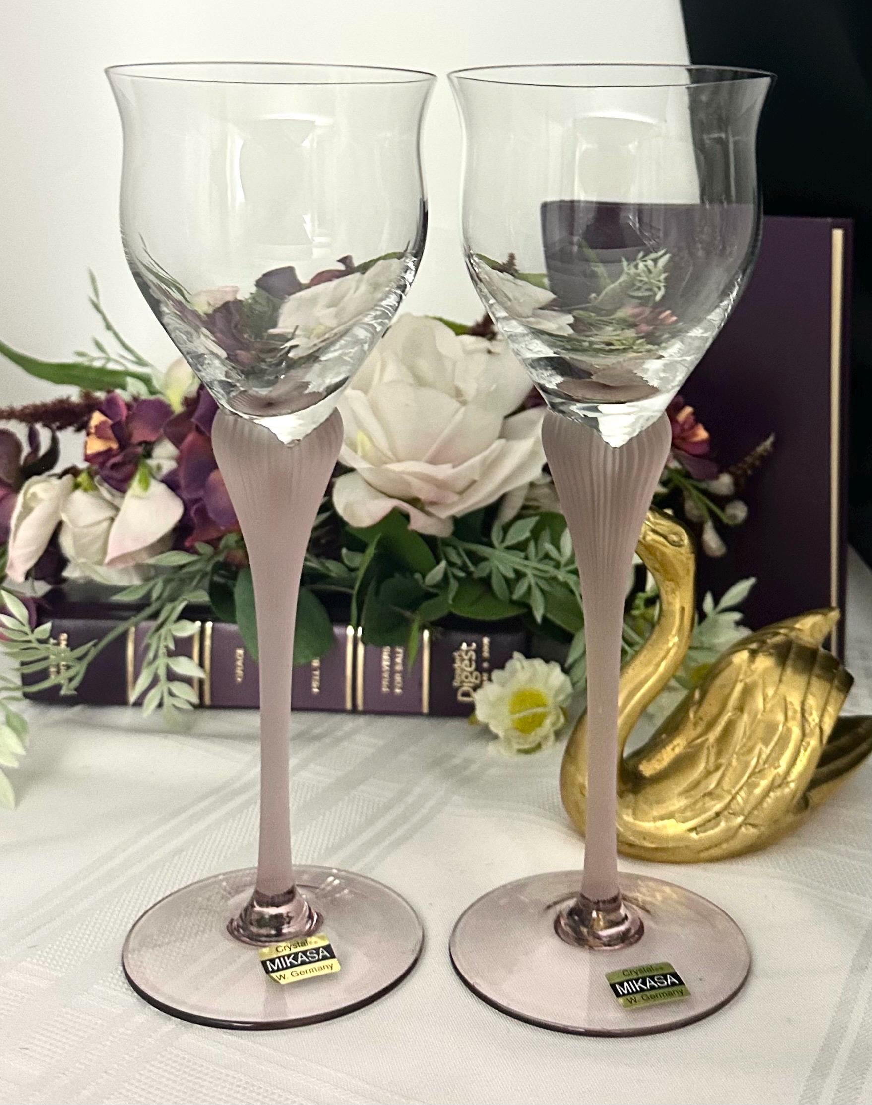 This is for 2 vintage Mikasa Sea Mist frosted stem water glasses. The lovely unique frosted Amethyst pink stem add a stylish addition to any kitchen or dining room. The four-piece set includes elegant round water goblets that are perfect for all occasions and are designed with a ribbed stem for added detail.