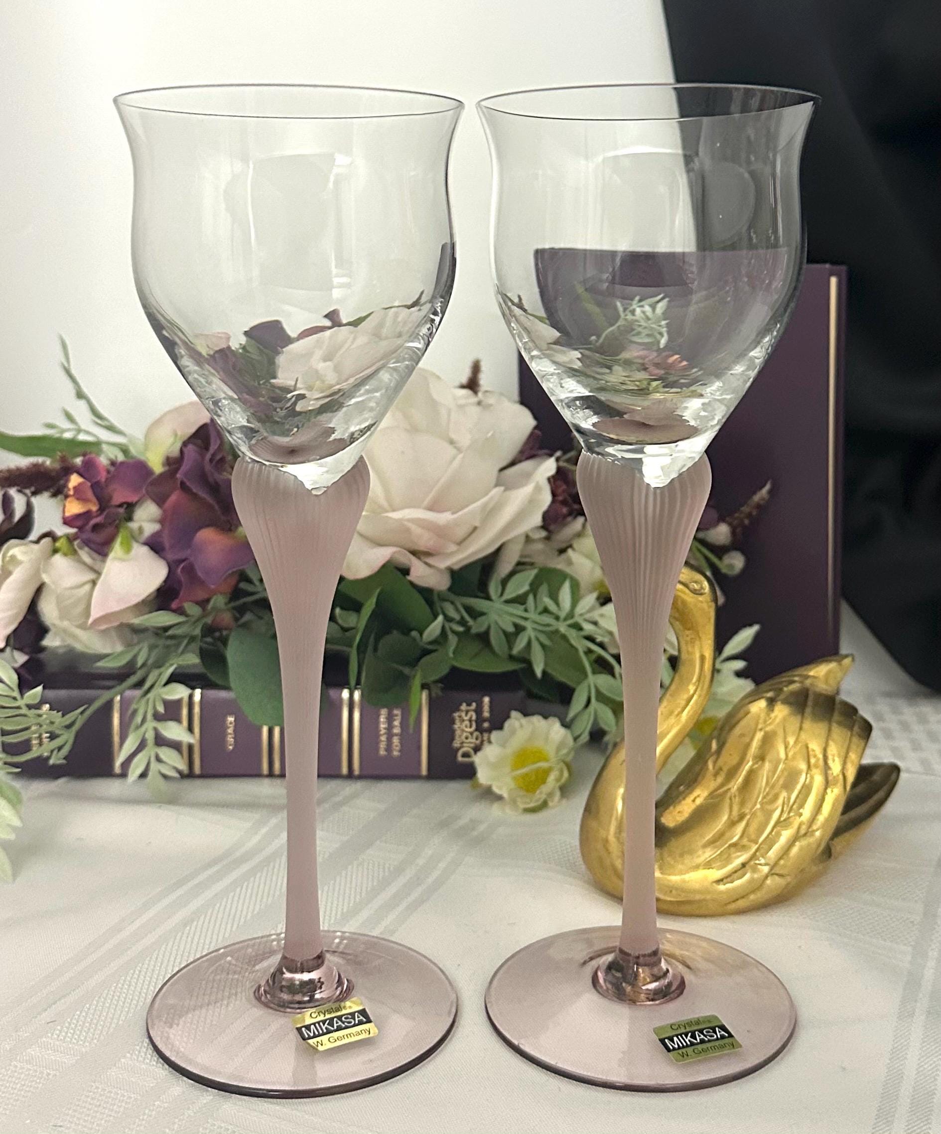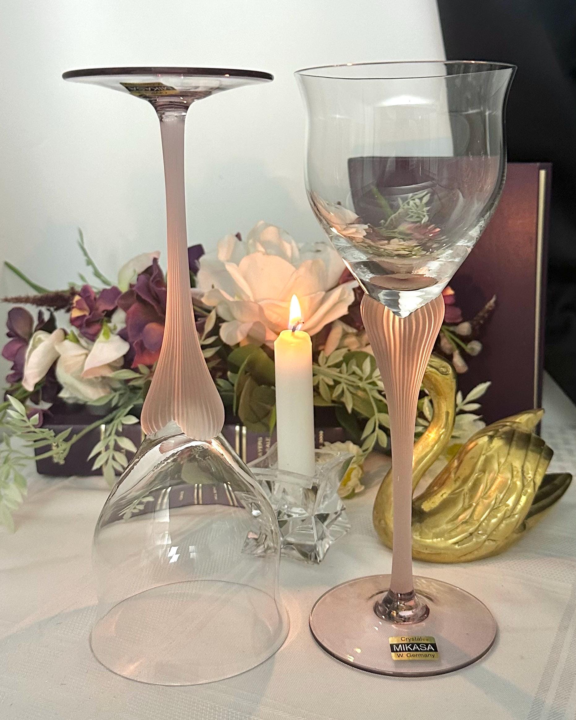 These are NOS as have the original Mikasa sticker on the foot and show no noted wear as have no chips, cracks or water staining. They make for perfect replacement glasses or to start a new set. The beautiful soft pink on the stem would make for wonderful collectible glasses for a baby shower to a birthday party.