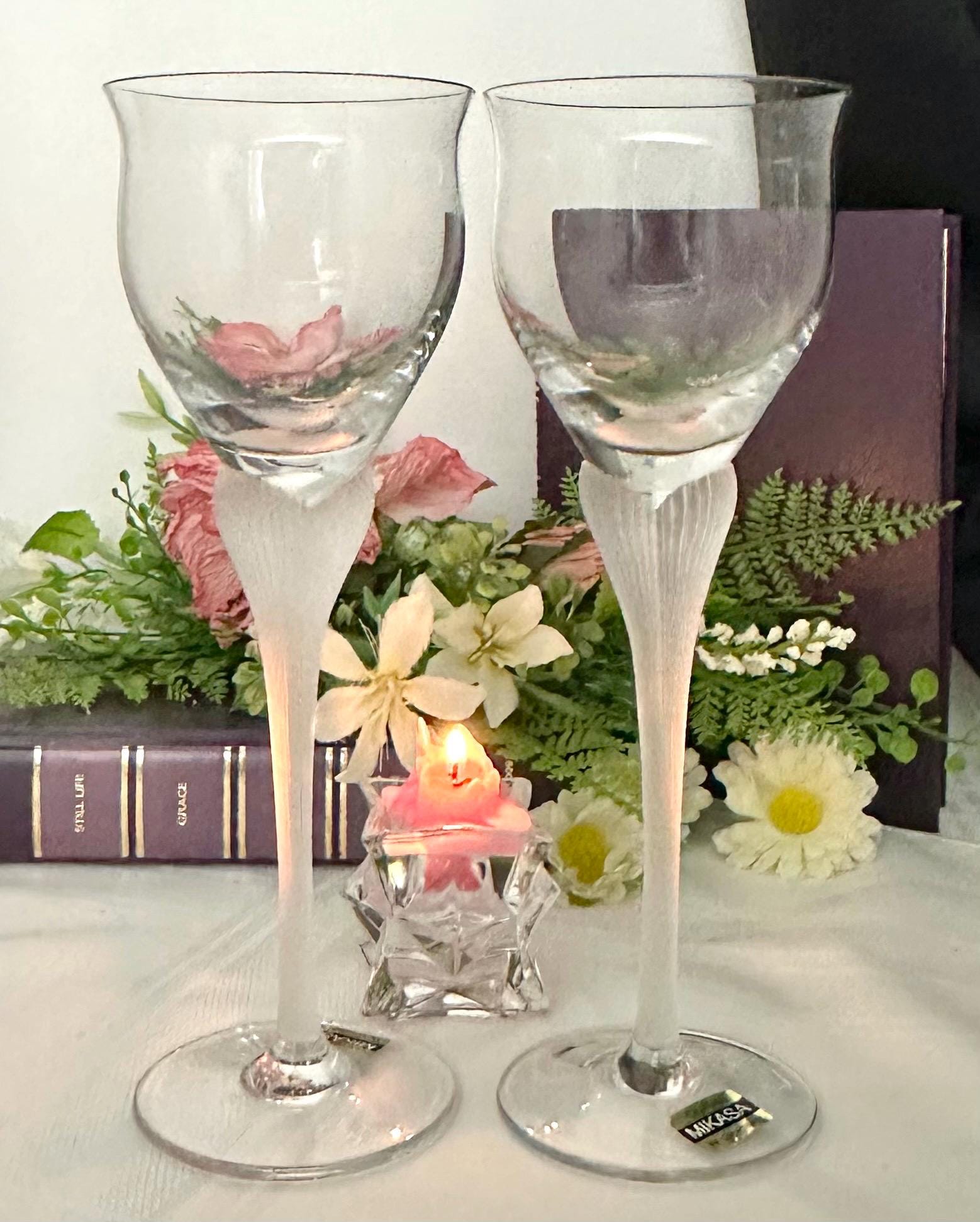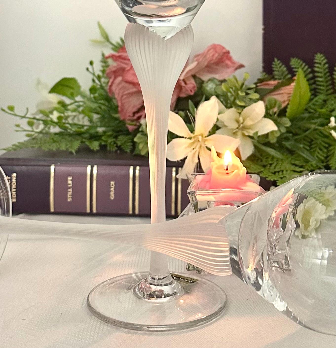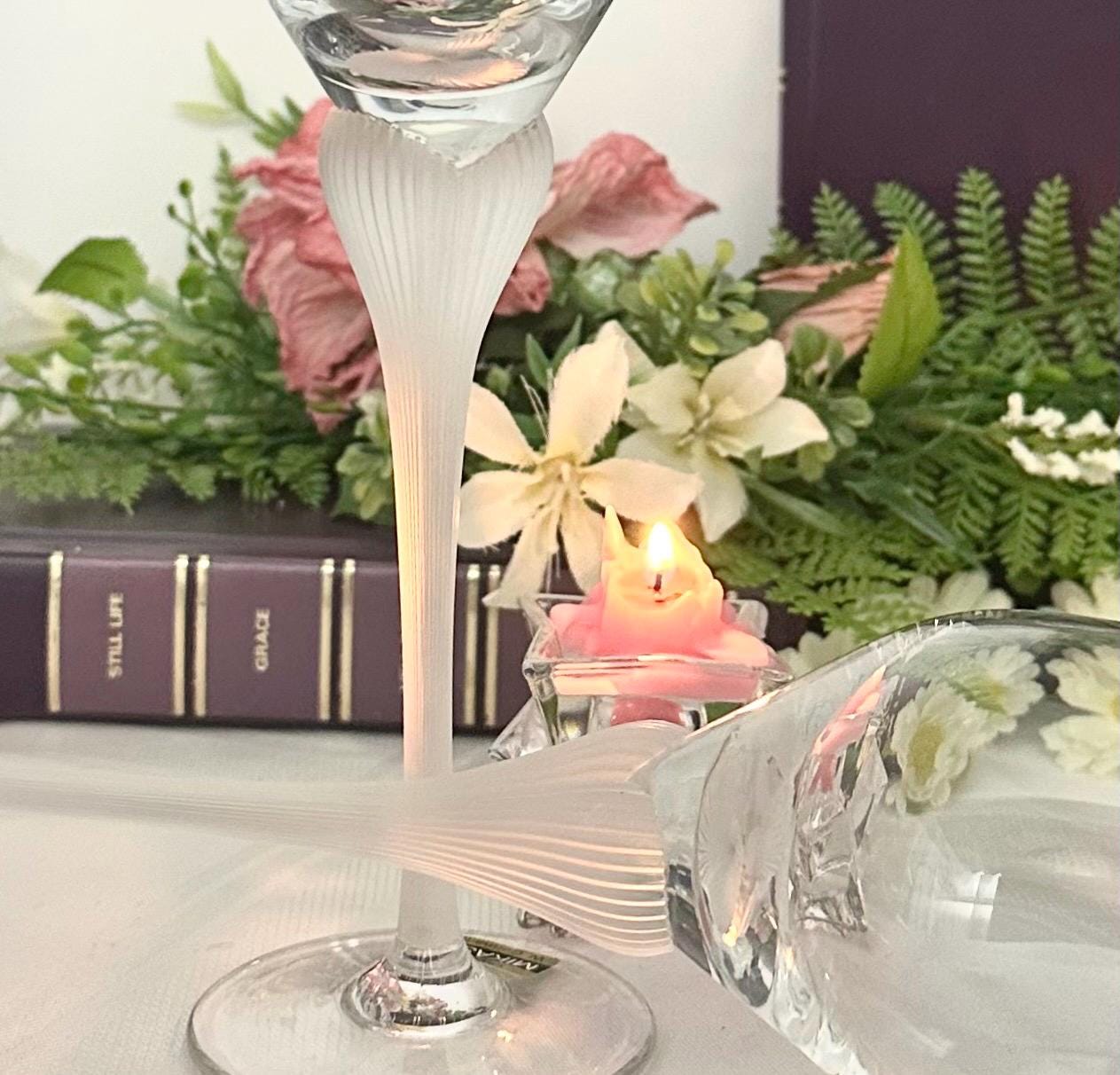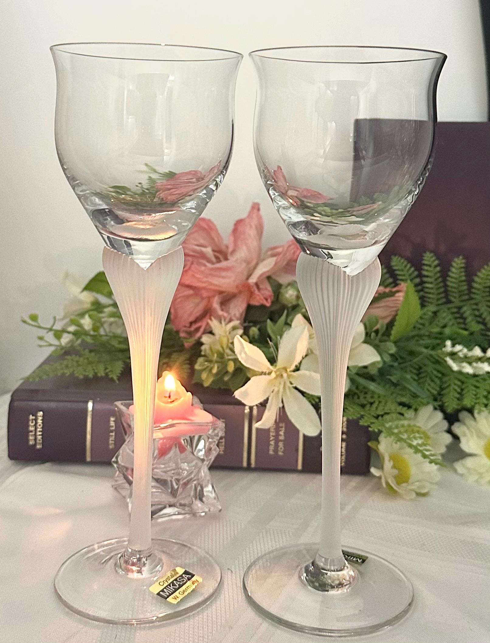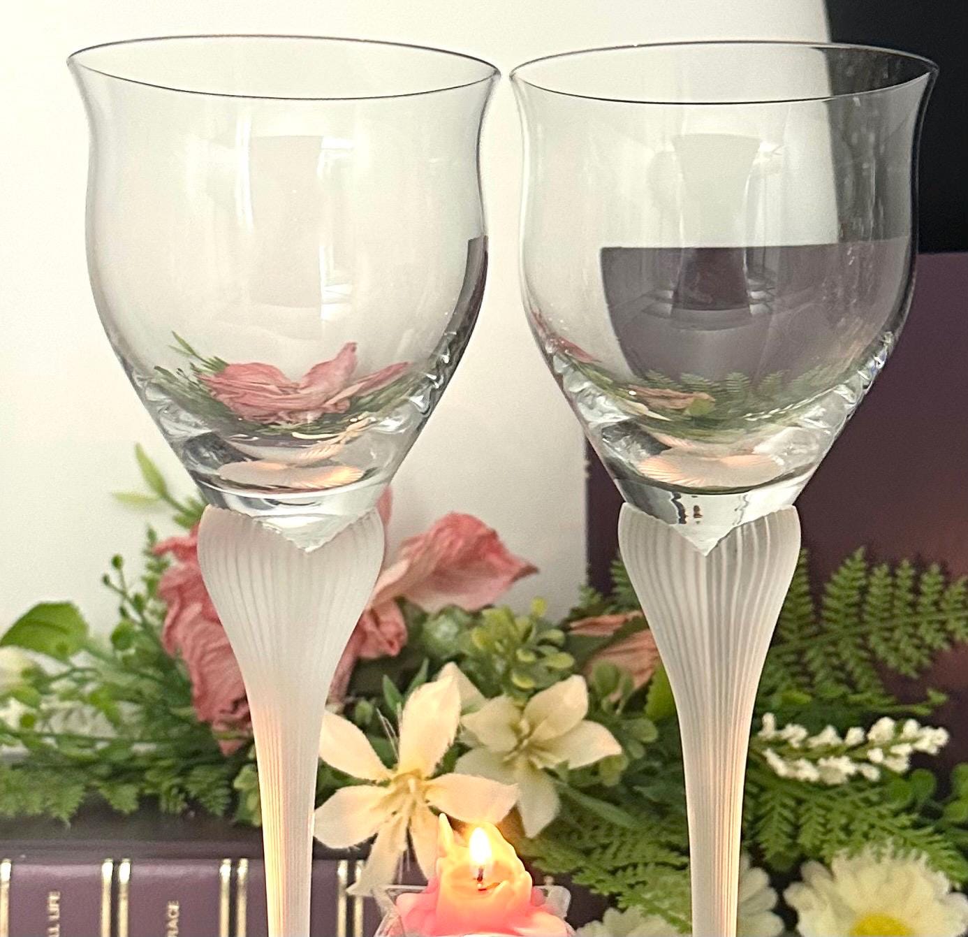 This is for 2 vintage Mikasa Sea Mist frosted stem wine glasses. The lovely unique frosted Clear / White stem add a stylish addition to any kitchen or dining room. The two-piece set includes elegant round wine goblets that are perfect for all occasions and are designed with a ribbed stem for added detail.