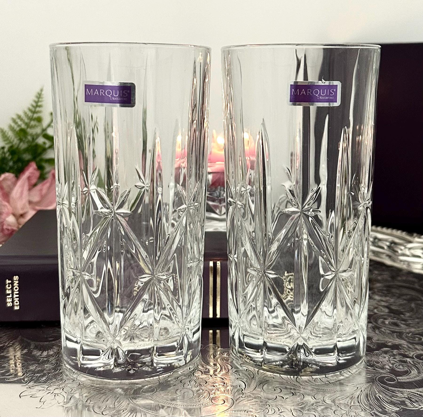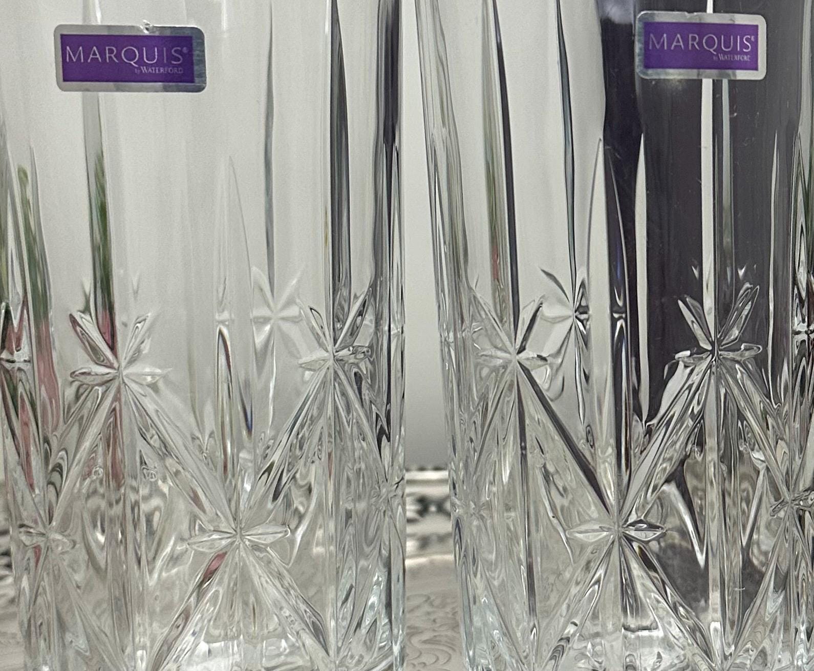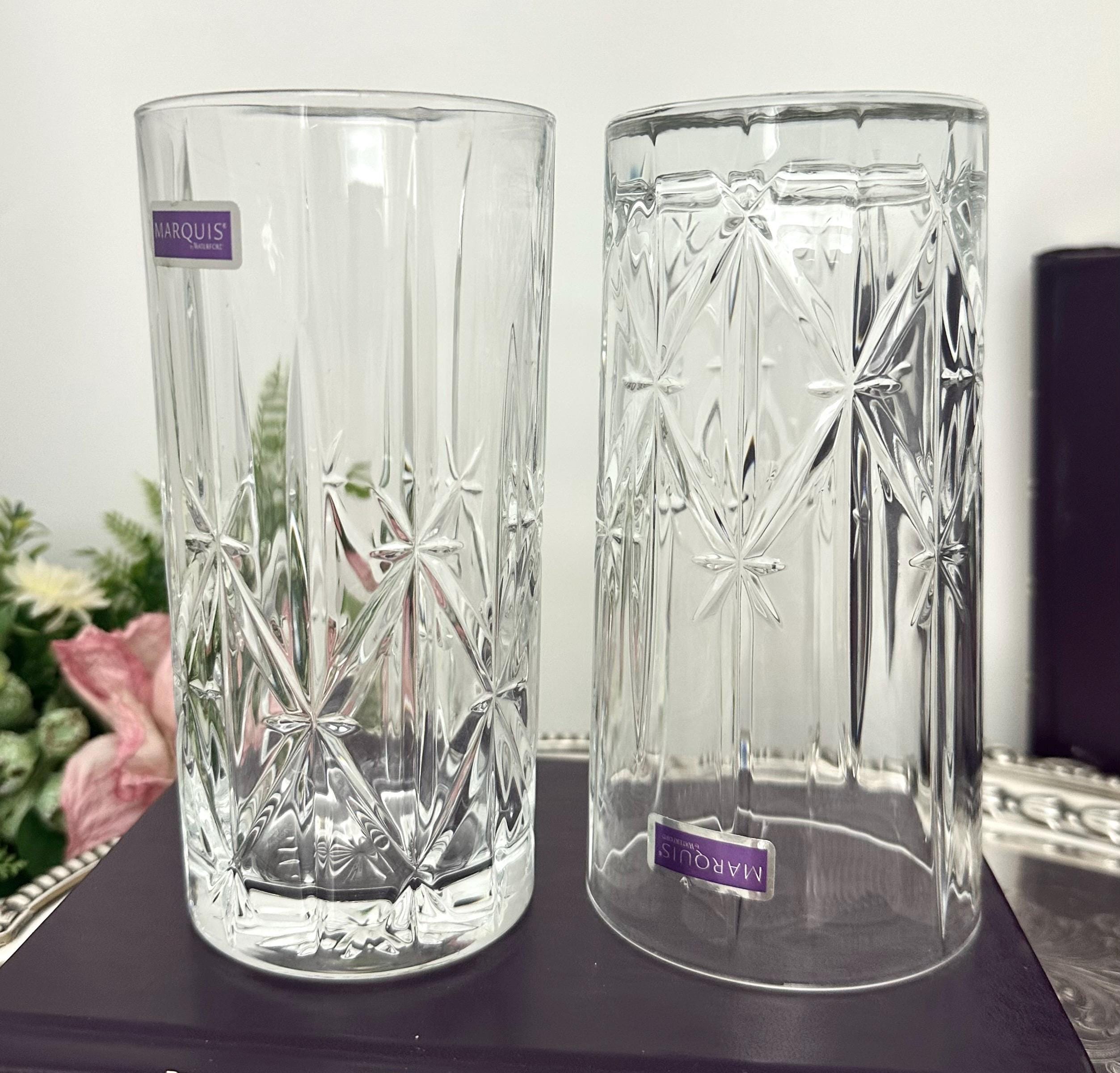 This is for a pair of Waterford Sparkle Highball Glasses. These lovely glasses measure: 6 1/4 inches tall with a diameter of 3 1/8 inches. These are blown glass and were crafted in either of Italy or Portugal. They are very light reflective glasses and a very nice weight to hold.