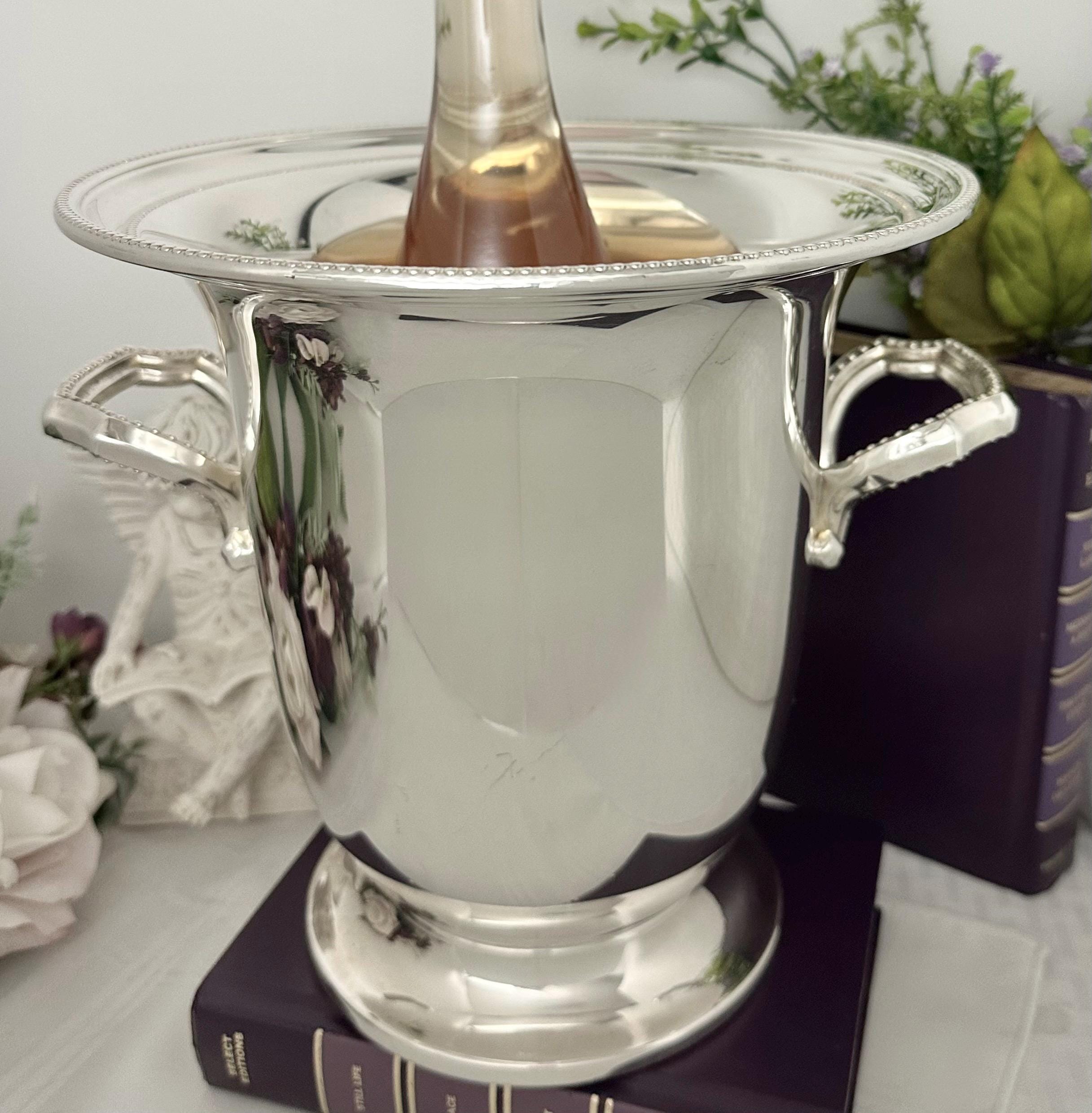 Its round shape and all-over shine pattern make it a versatile piece that can complement various styles of barware. The silver plated metal construction and sturdy handles make it both practical and stylish for serving champagne or keeping drinks cool.