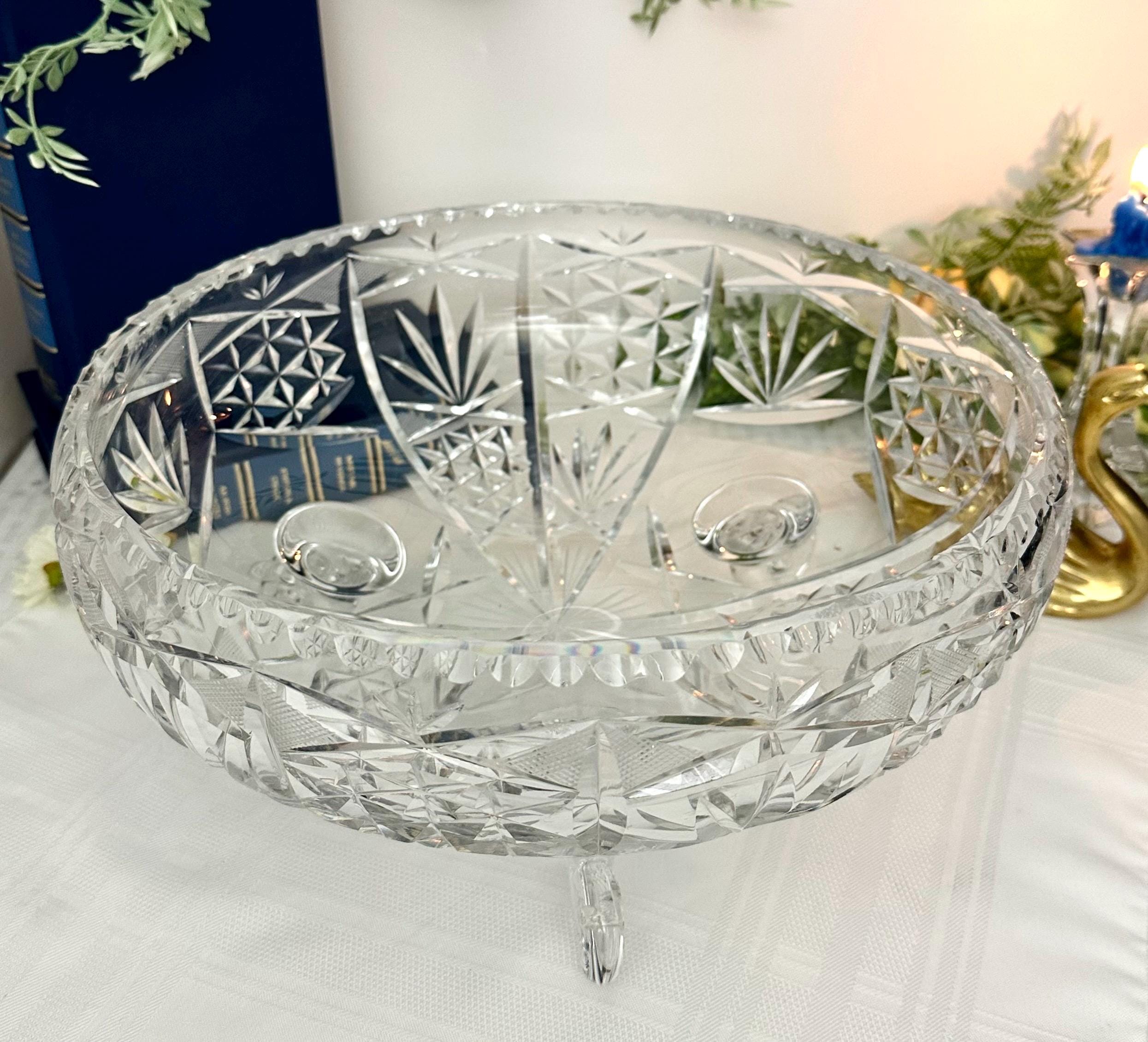 This is for a very large amazing 12" American Brilliant Cut Crystal Bowl with Scroll Feet and Hobstar Cuts. This beautiful Centerpiece Vase is a stunning antique piece of glassware handcrafted in the United States during the late 1800's to early 1900s. This is a perfect piece for holding fruit, fresh flowers to anything like candy where its size can be enjoyed.