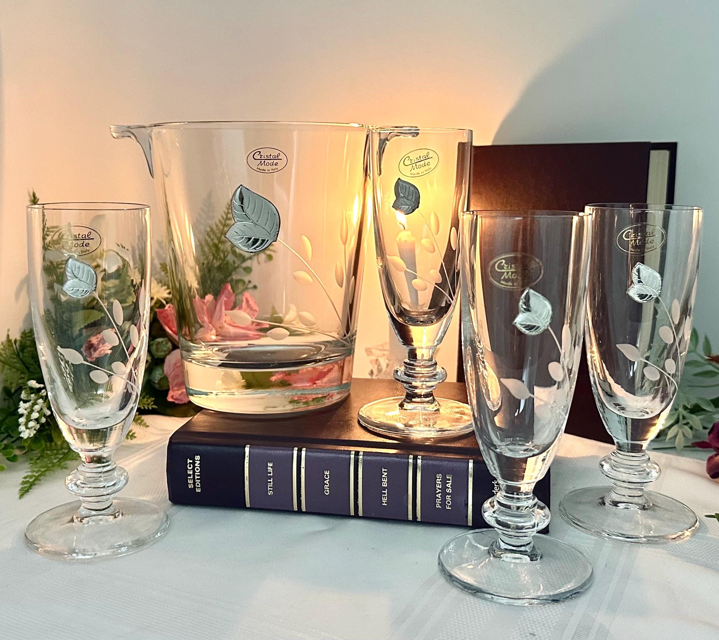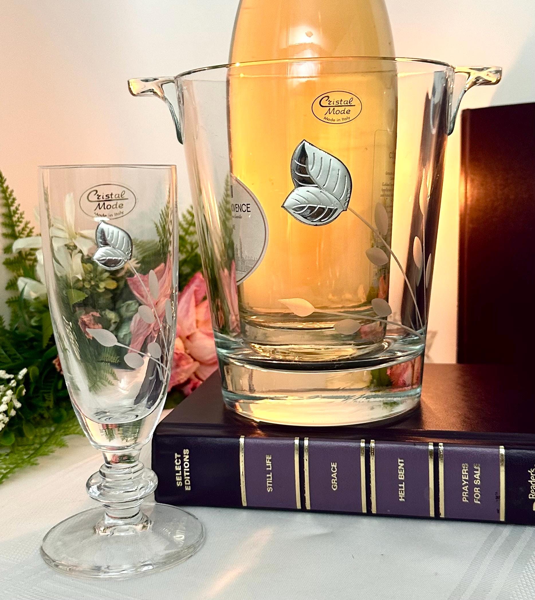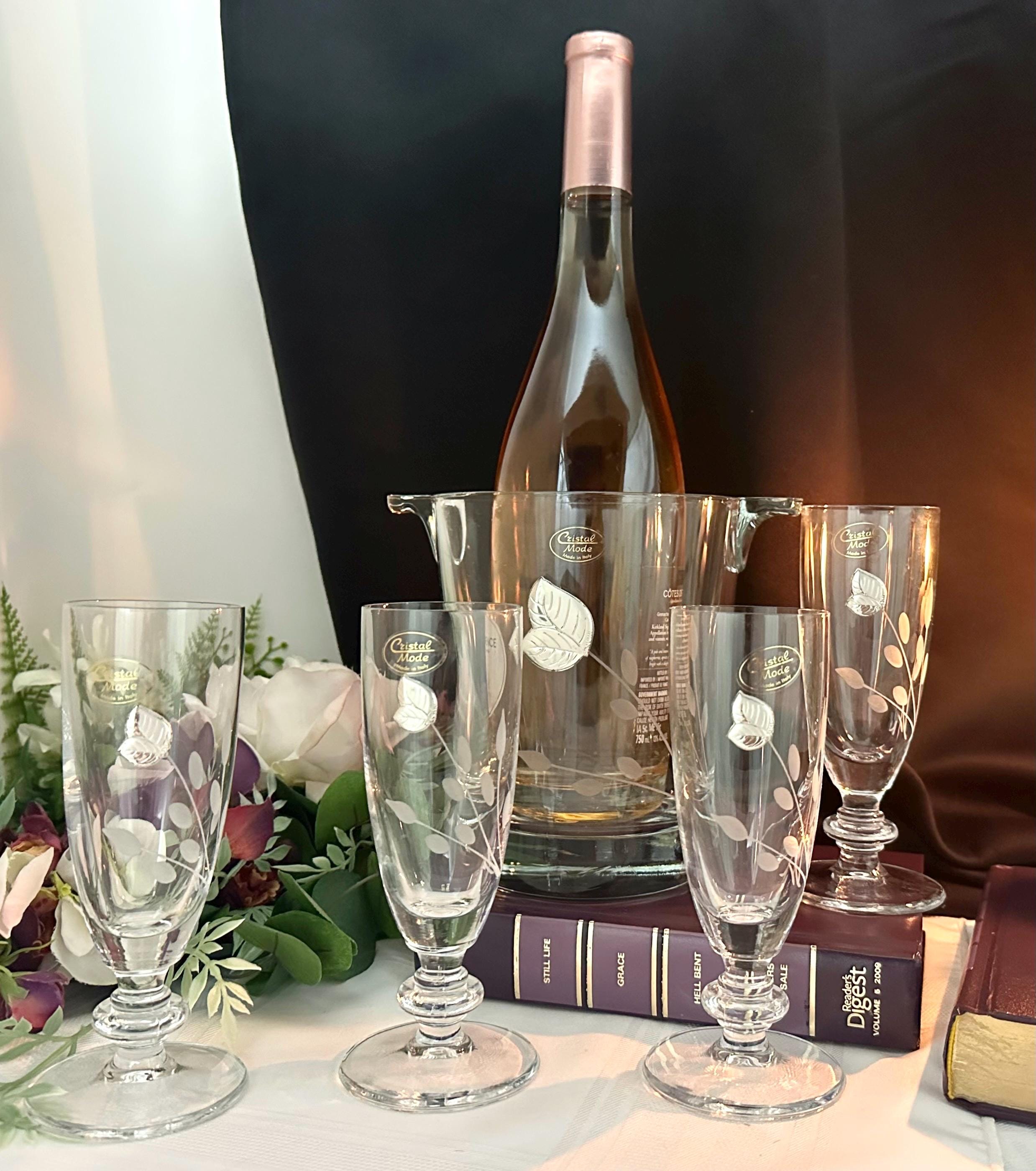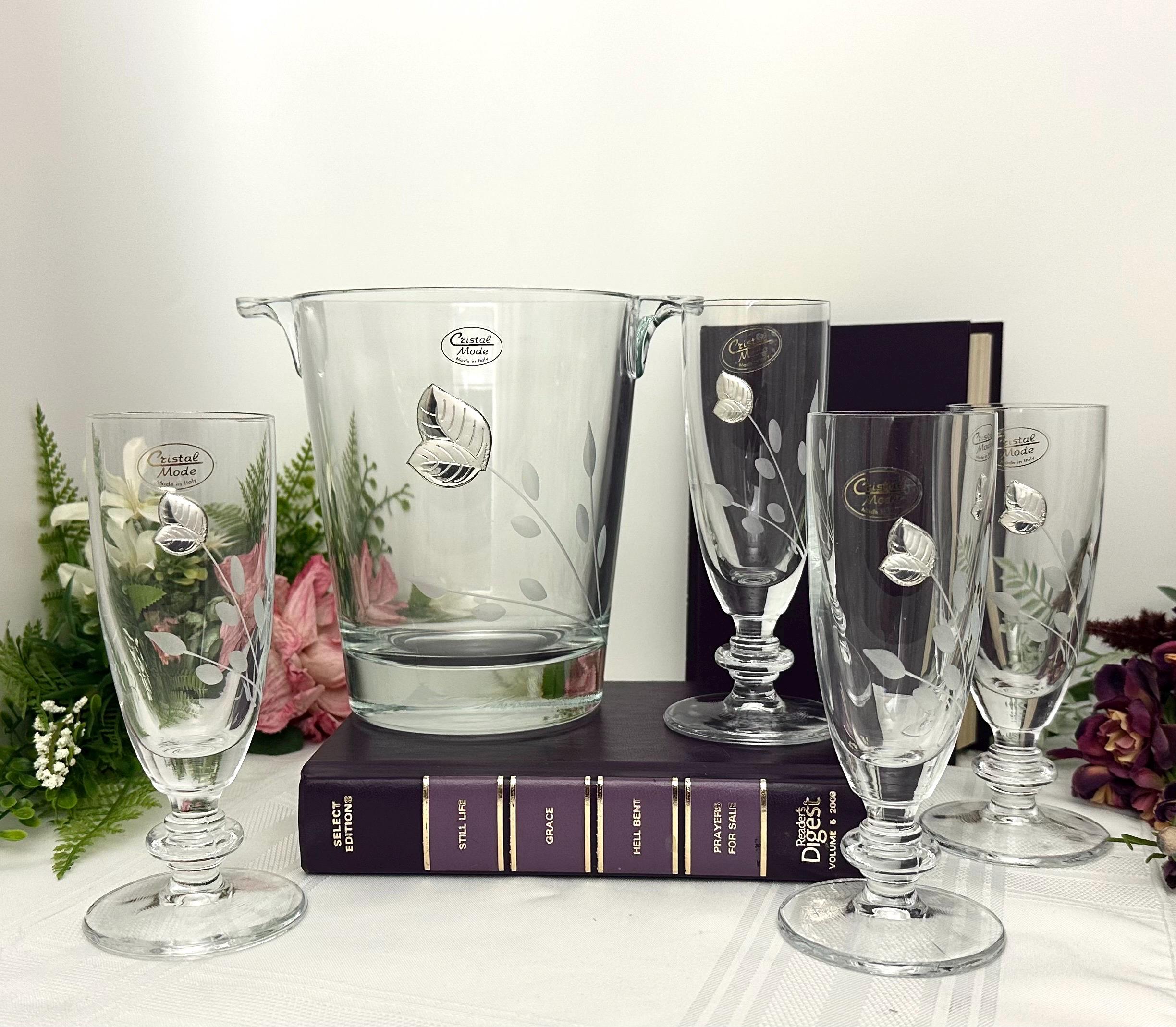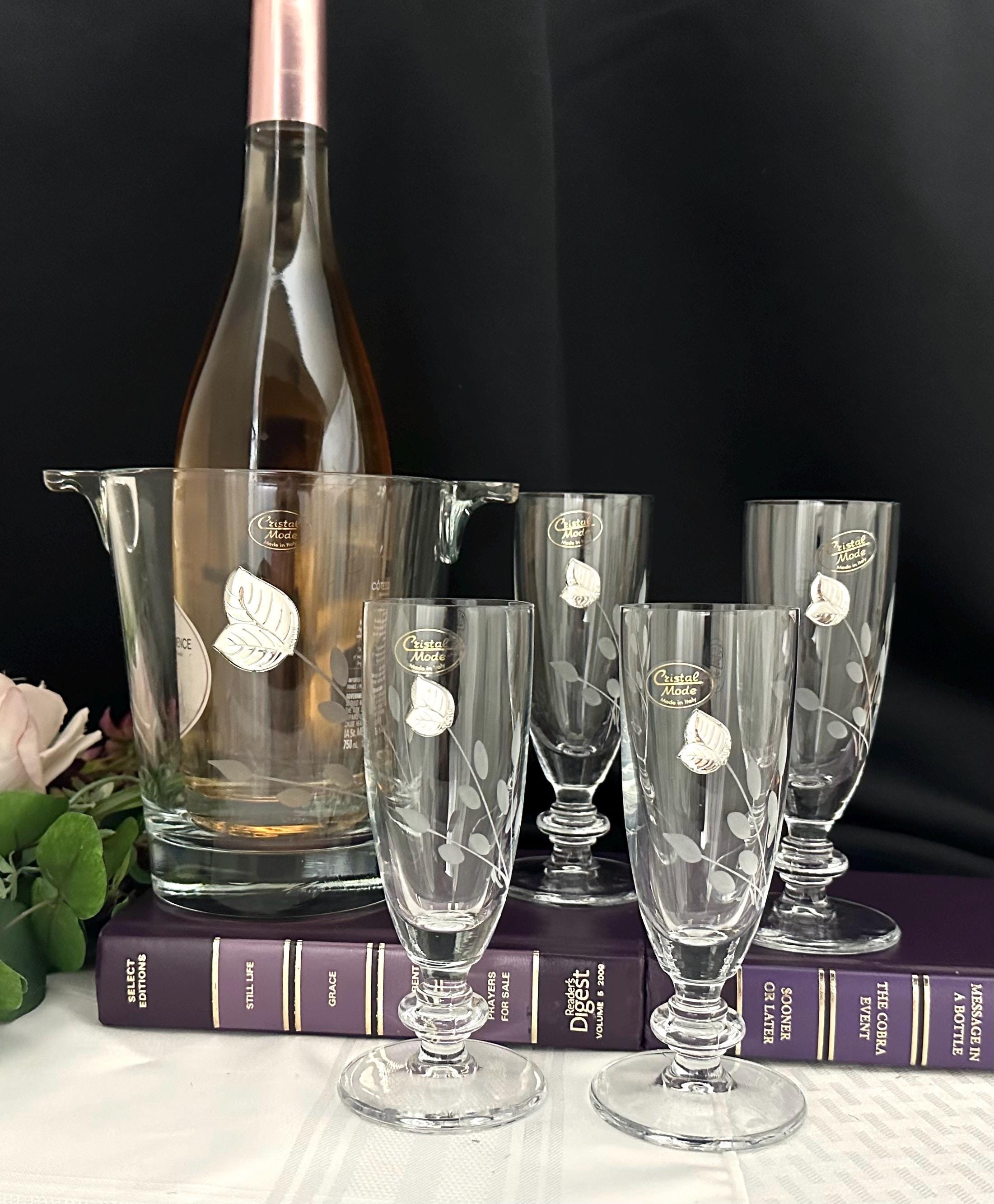 This is for a barware set of 4 Wine Glasses by Cristal Mode - and a matching Italian Ice Bucket with a Pewter Leaf Motif. The Glass Barware Set is a contemporary five-piece barware set perfect for all occasions.
