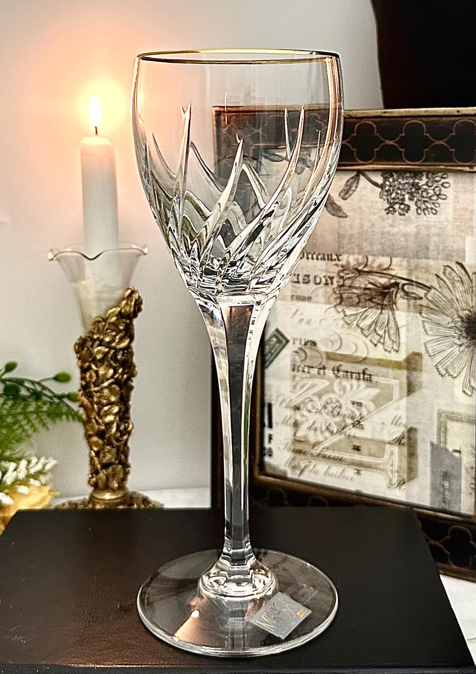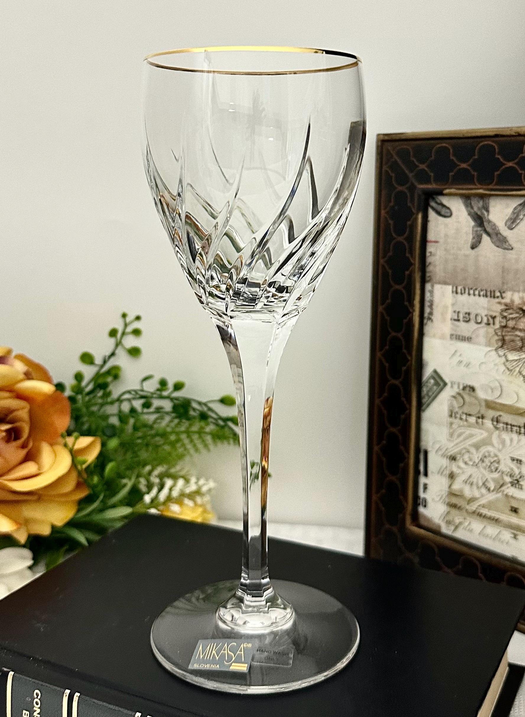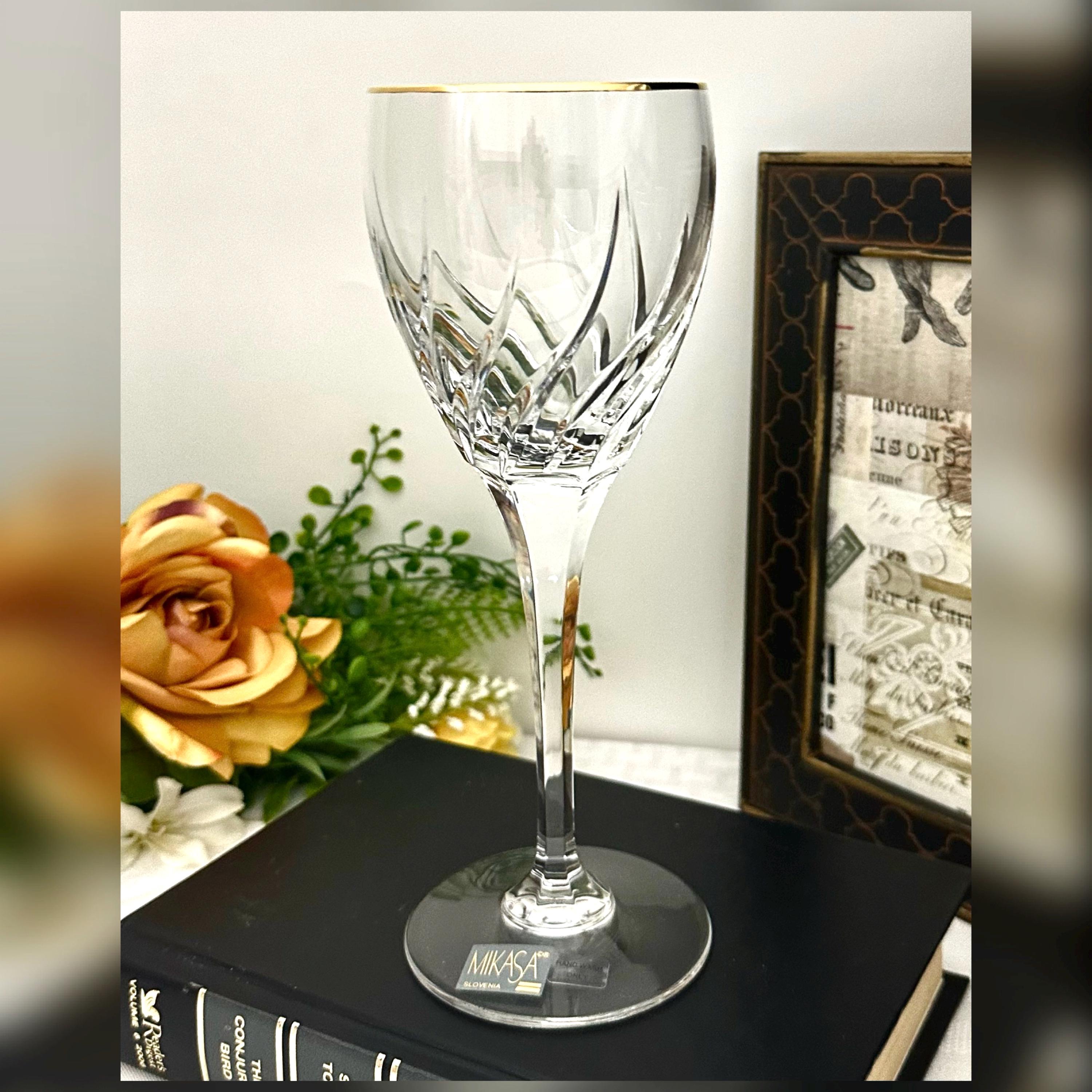 This is for 1 Mikasa Rendezvous Gold Trimmed Wine Glass. This is for a vintage blown glass wine glass with an elegant swirl pattern on the bowl and a gold-trimmed rim.