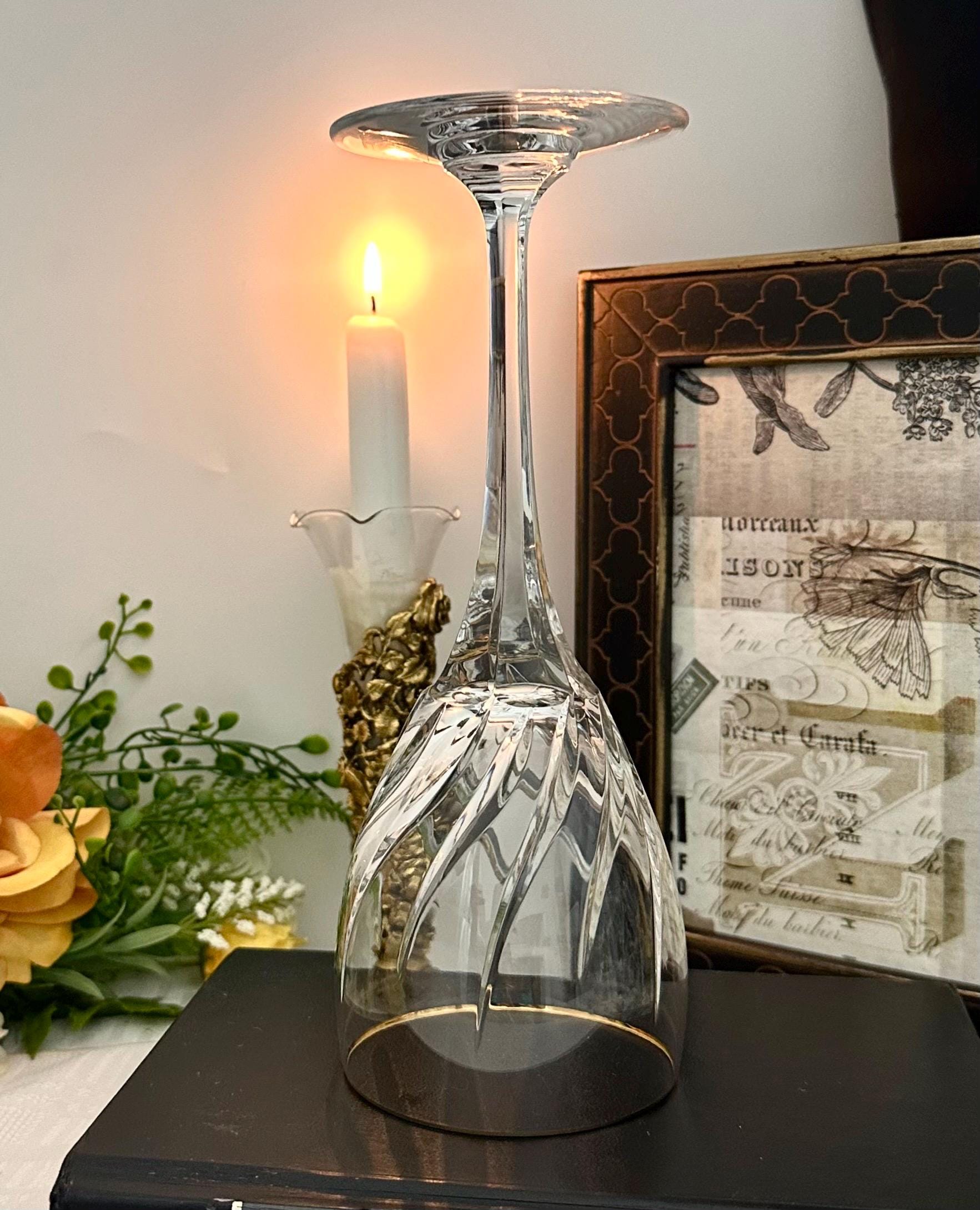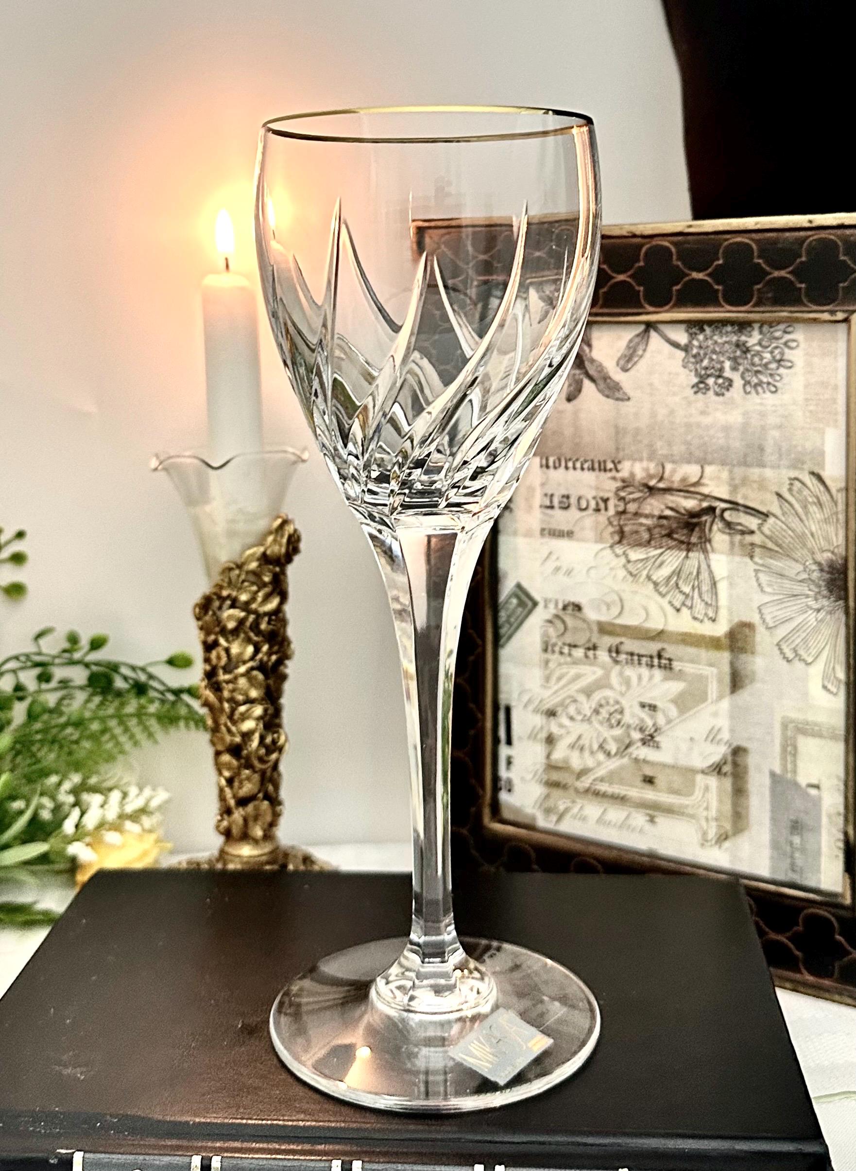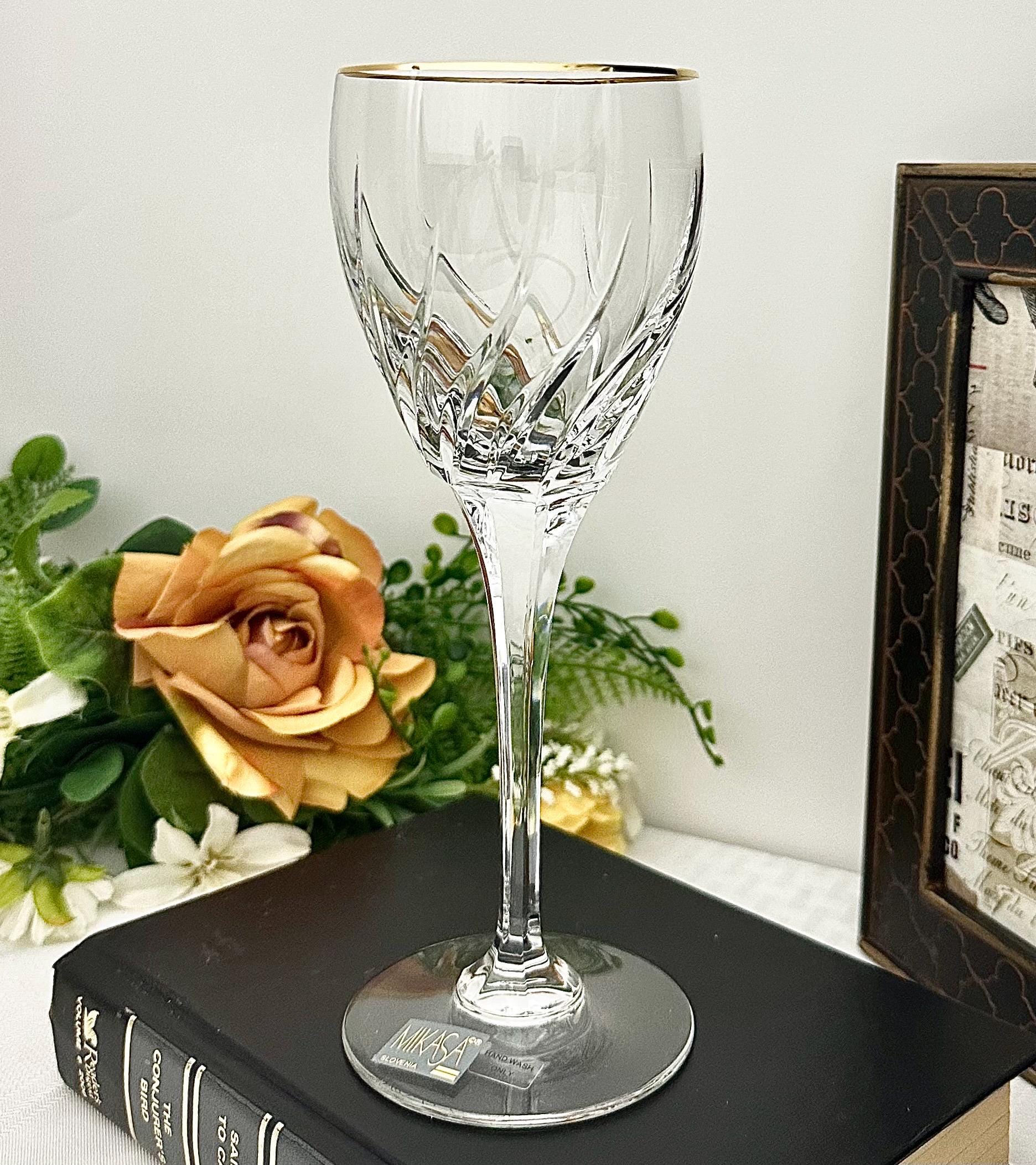 This is for 1 Mikasa Rendezvous Gold Trimmed Wine Glass. This is for a vintage blown glass wine glass with an elegant swirl pattern on the bowl and a gold-trimmed rim.