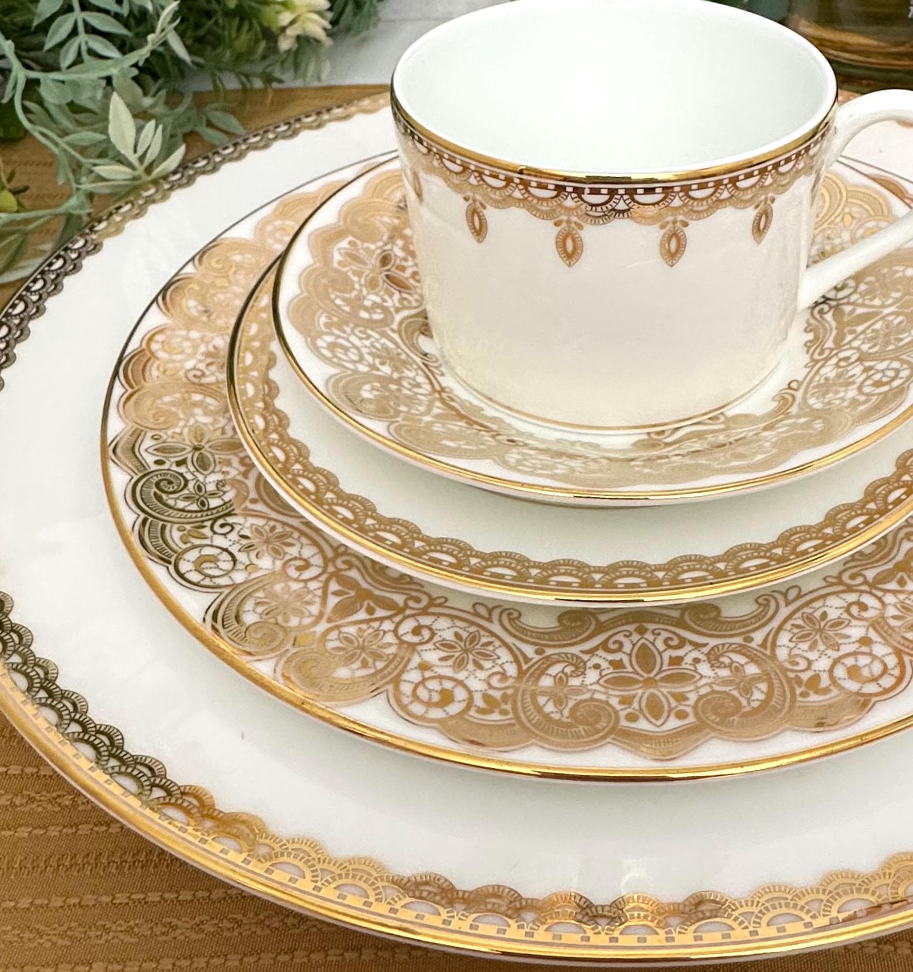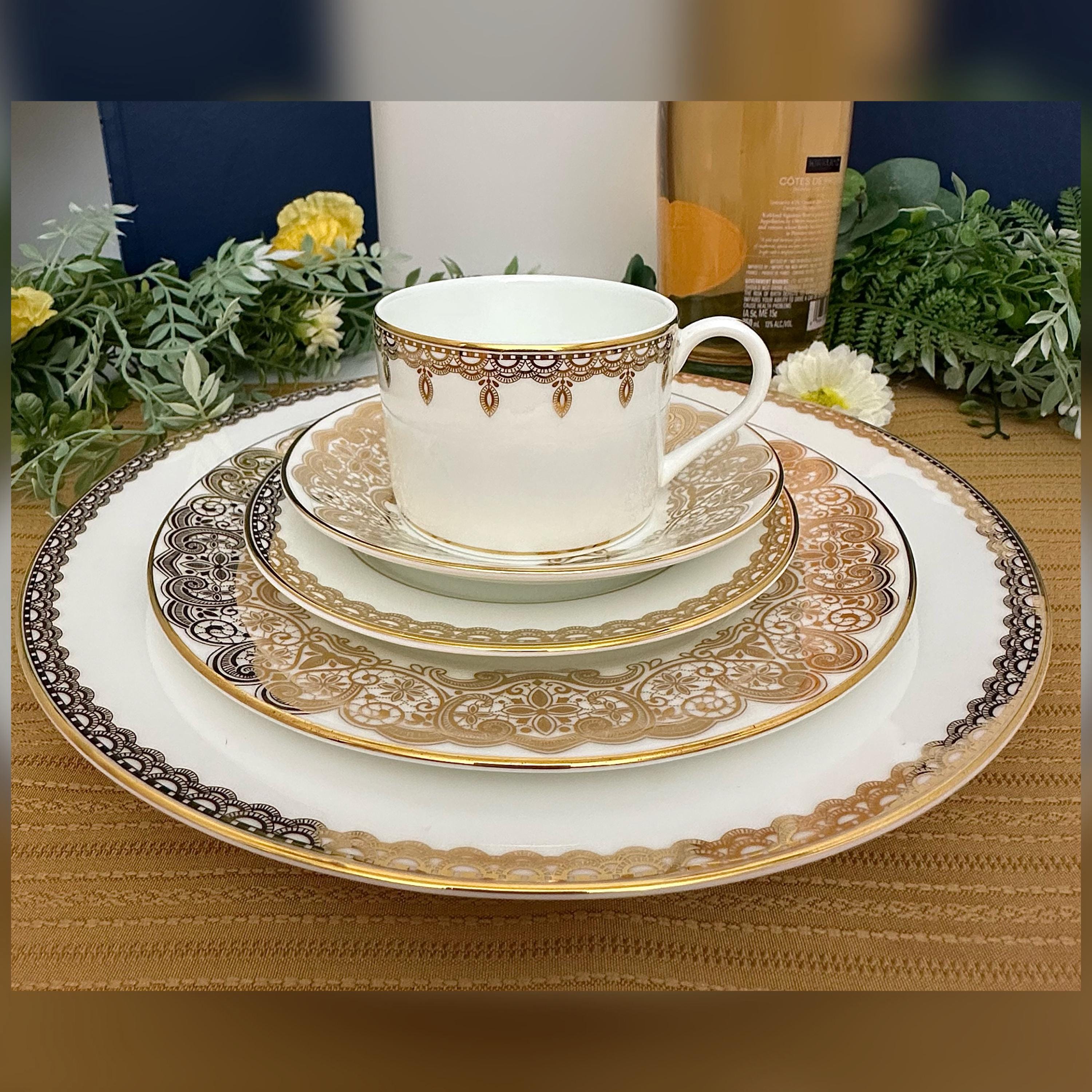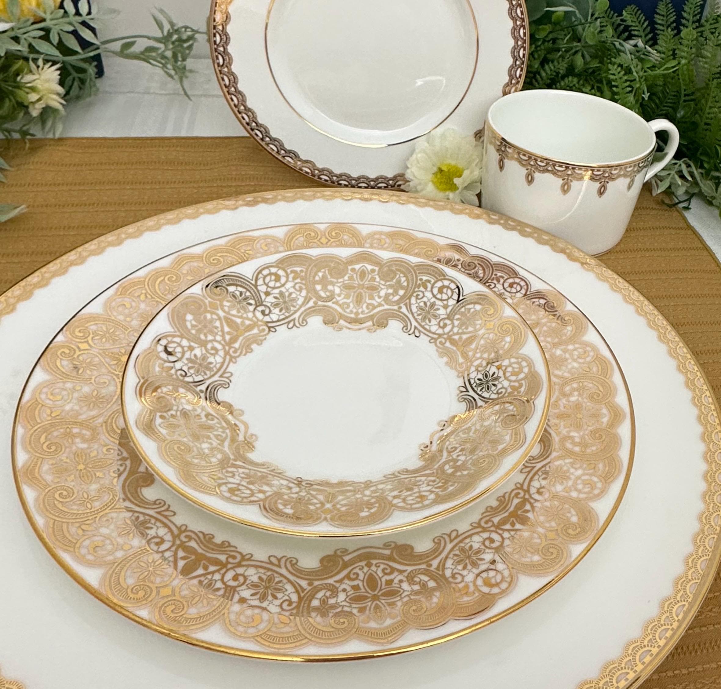 This is for a Vintage Waterford Lismore Lace Gold Dish Set. This is a 5 Pcs China Place Setting. The traditional elegant set of dinnerware exudes sophistication and style. All pieces are marked with the Waterford name and pattern and have gold trim and decorations.