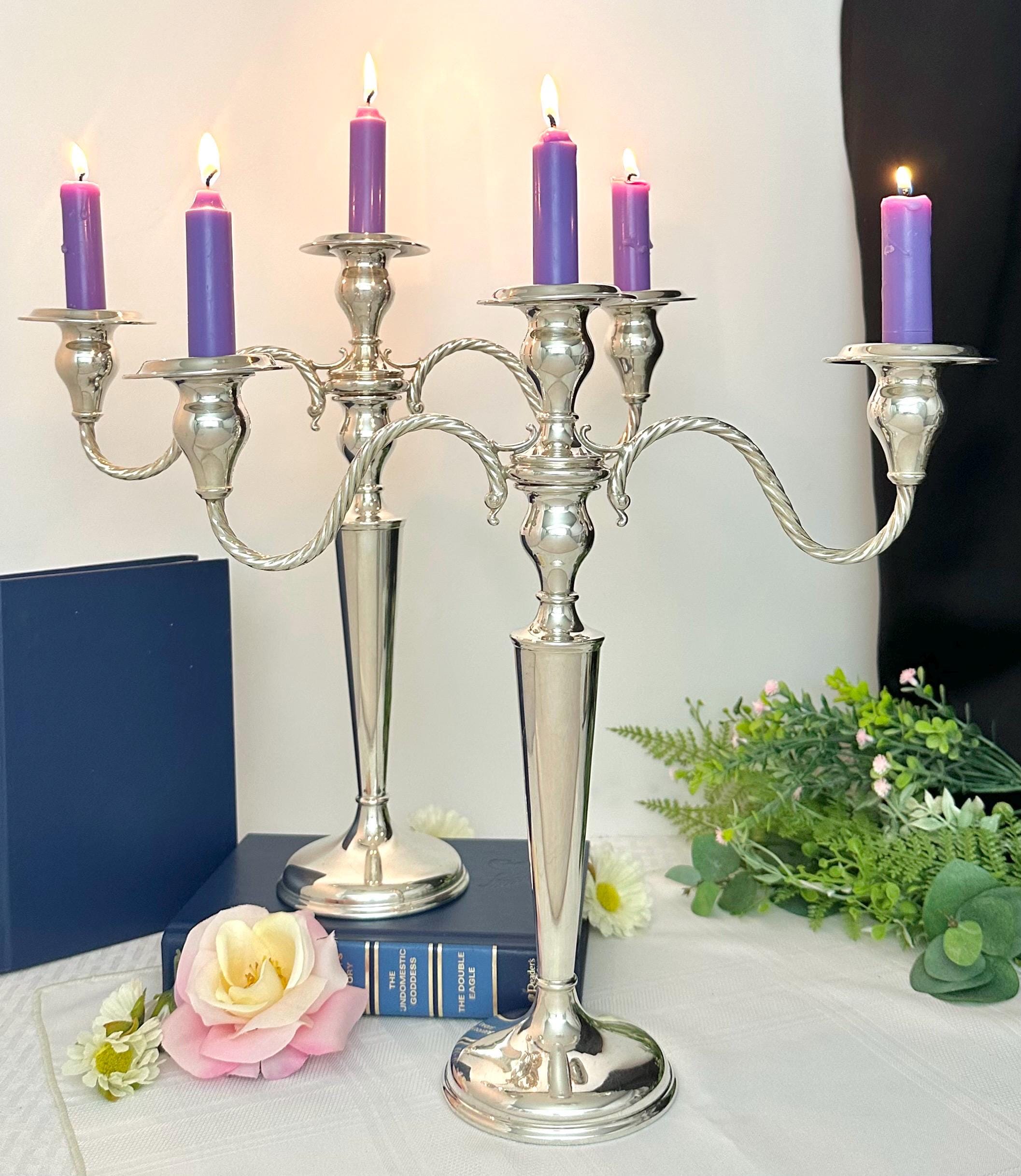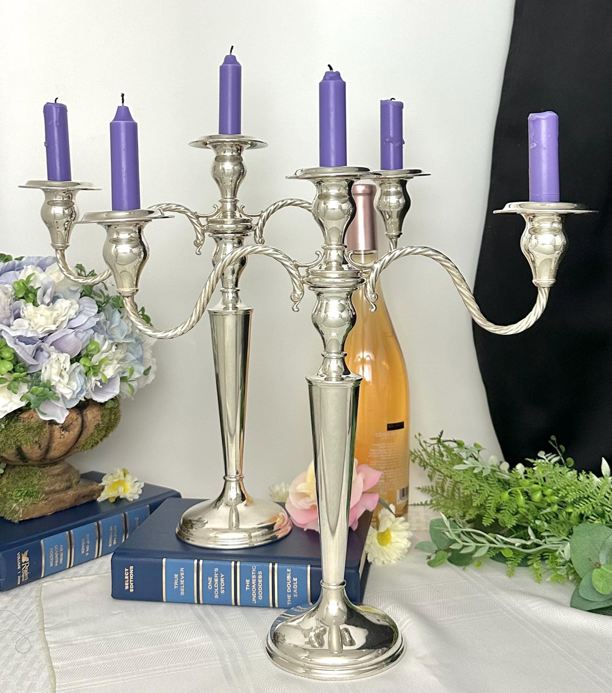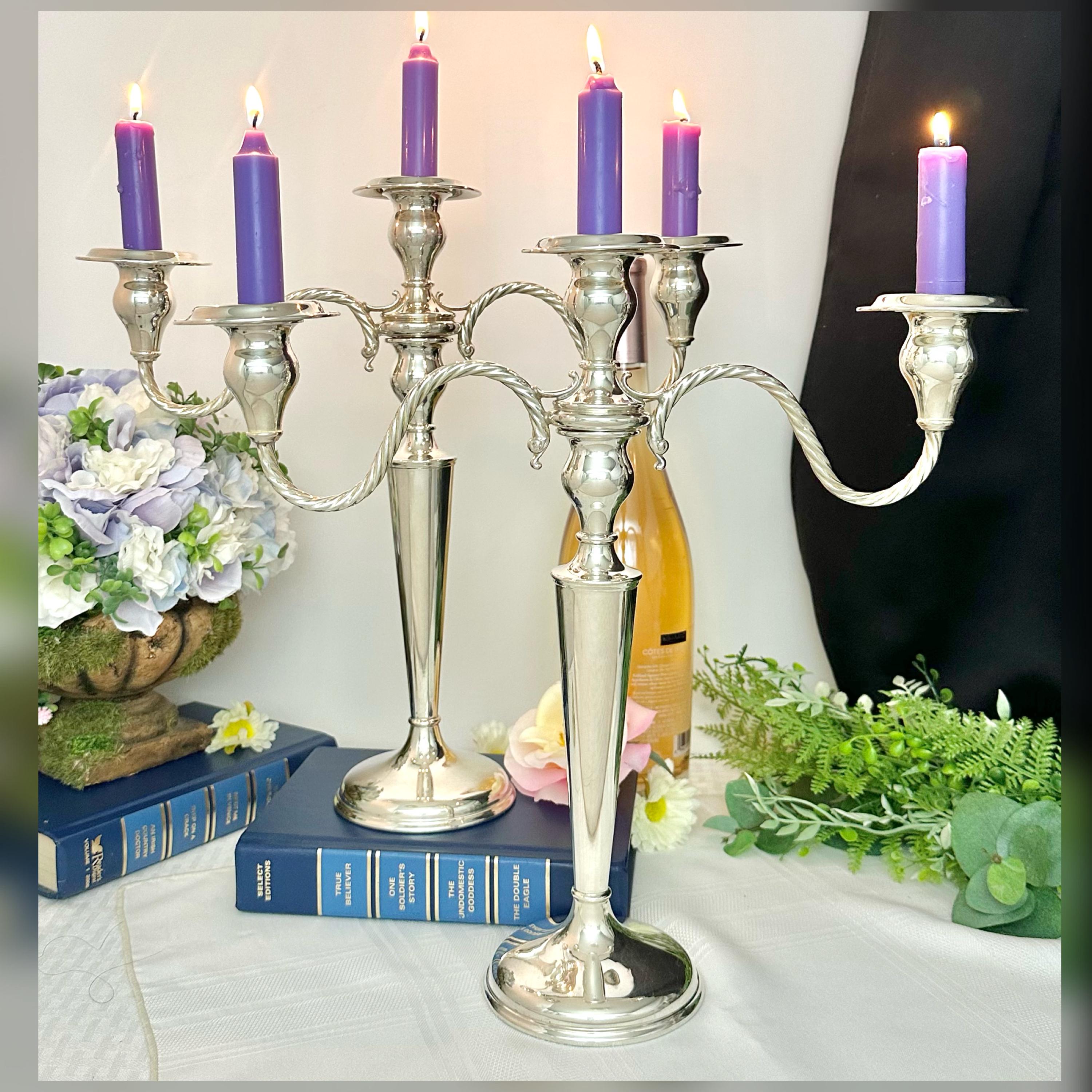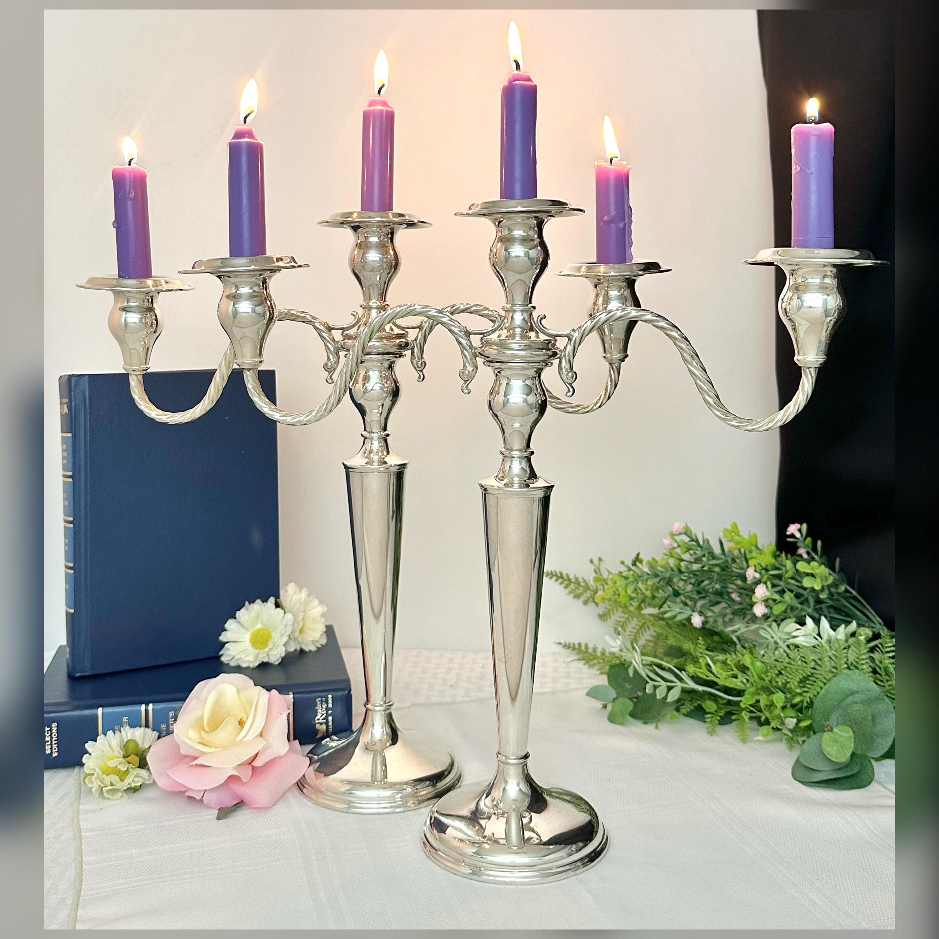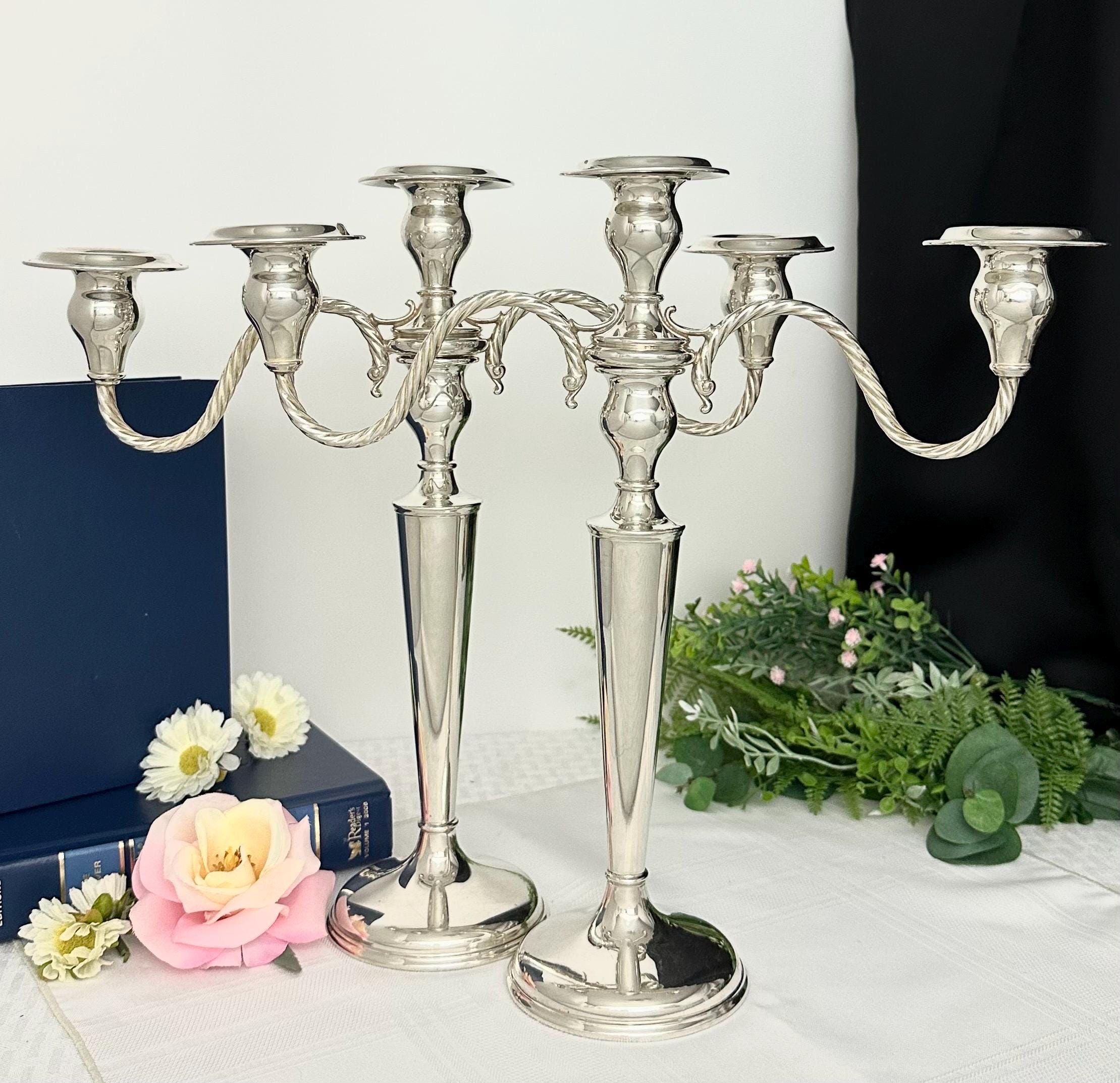 This is for a pair of vintage Stieff Sterling Silver candelabras. These are in wonderful condition. The base can hold a single dinner taper candle and with the arm inserted the candelabras each hold 3 candles. Each piece is marked, the Candle cups with - Sterling, The single tall center holder - STEIFF, STERLING and P along with - Cement Filled, 0157. The arms are each marked STEIFF STERLING.