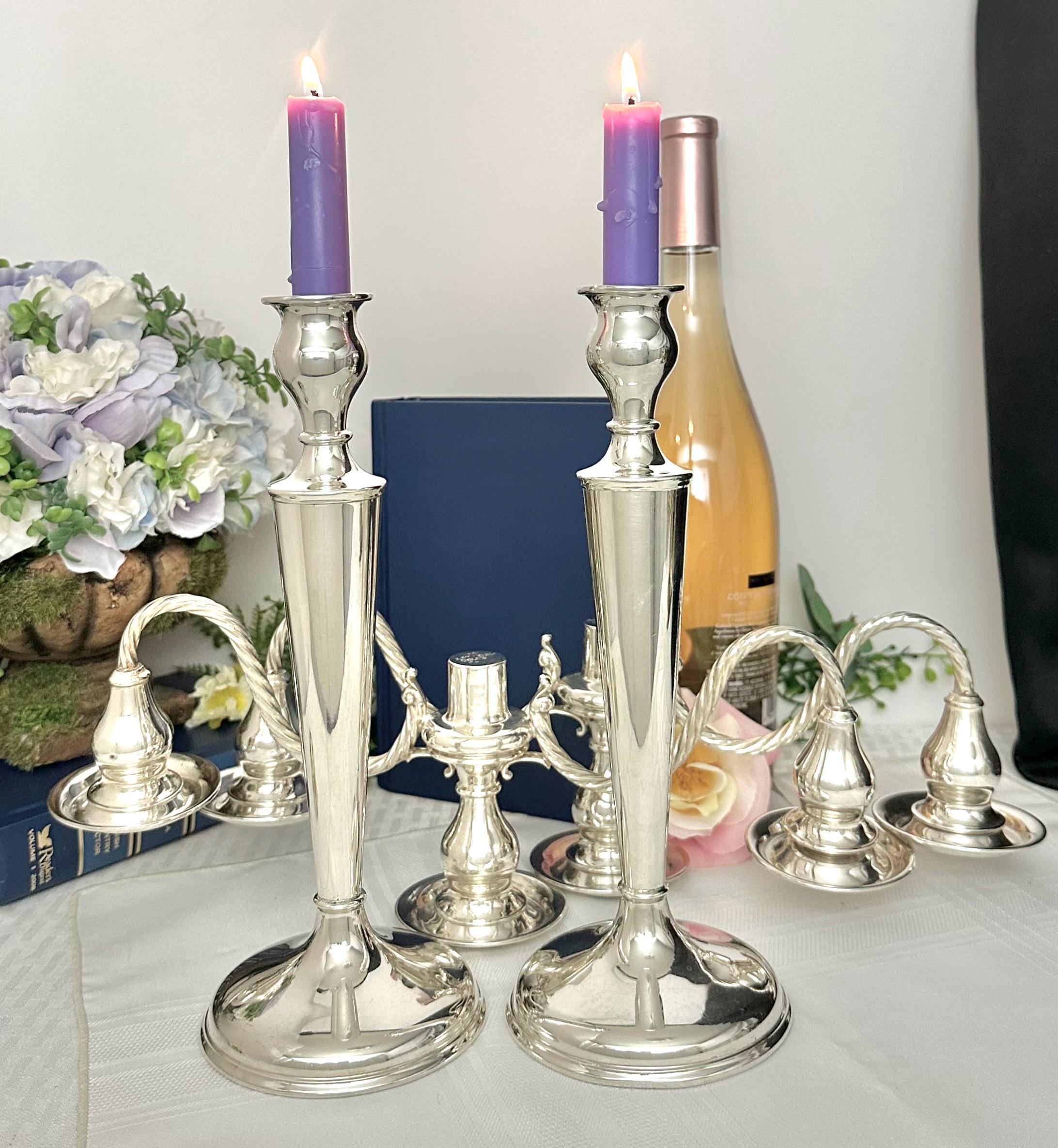 These classic Vintage candle holders arms (2) and candle cups (6) have total weight of 554 grams of solid sterling silver. The 2 single candle bases that are weighted and have a total weight of 772 grams.