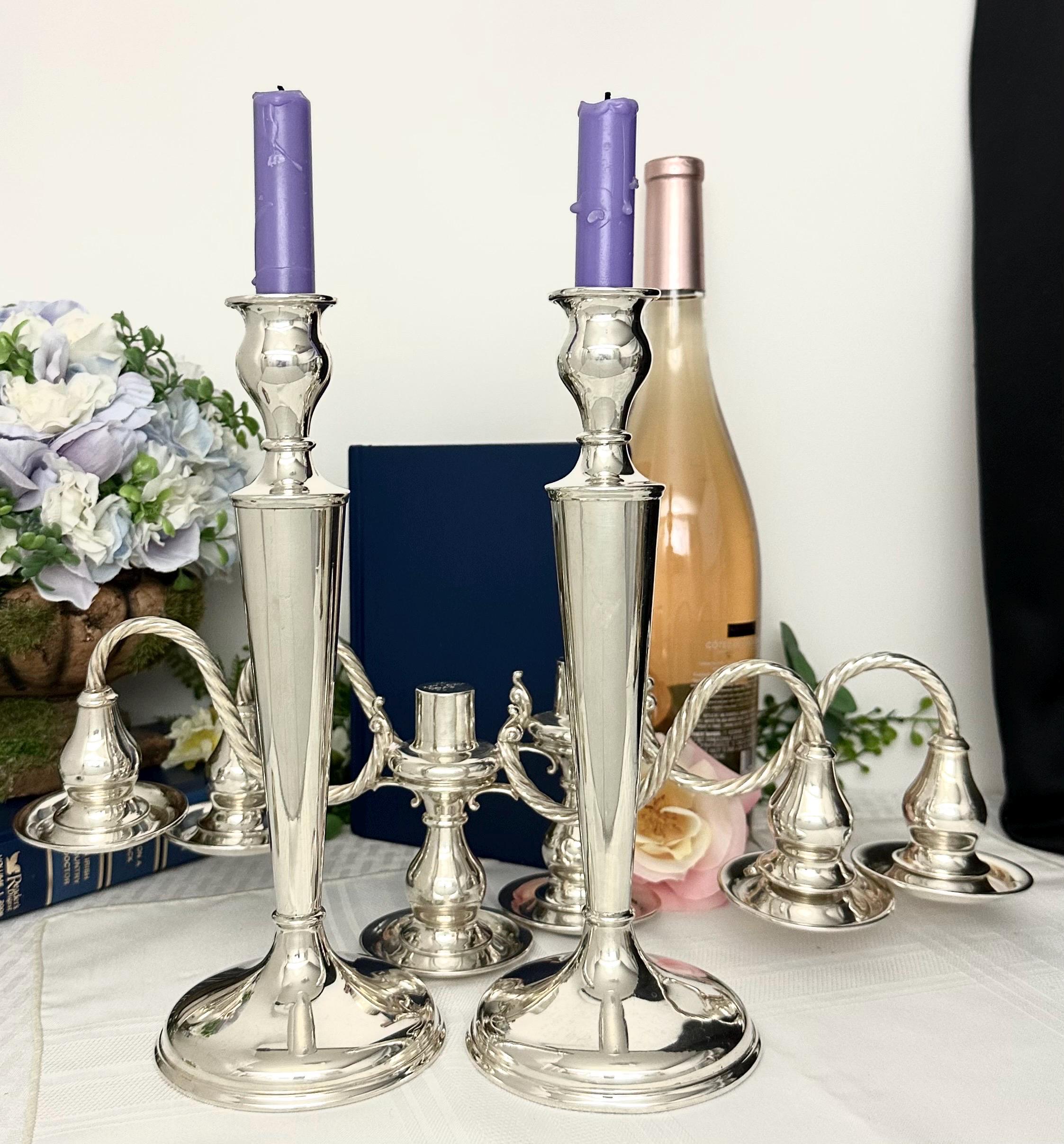 The vintage Stieff candelabras feature a solid sterling silver construction and a weighted base for stability, making them a stylish and elegant addition to any antique or vintage decor.