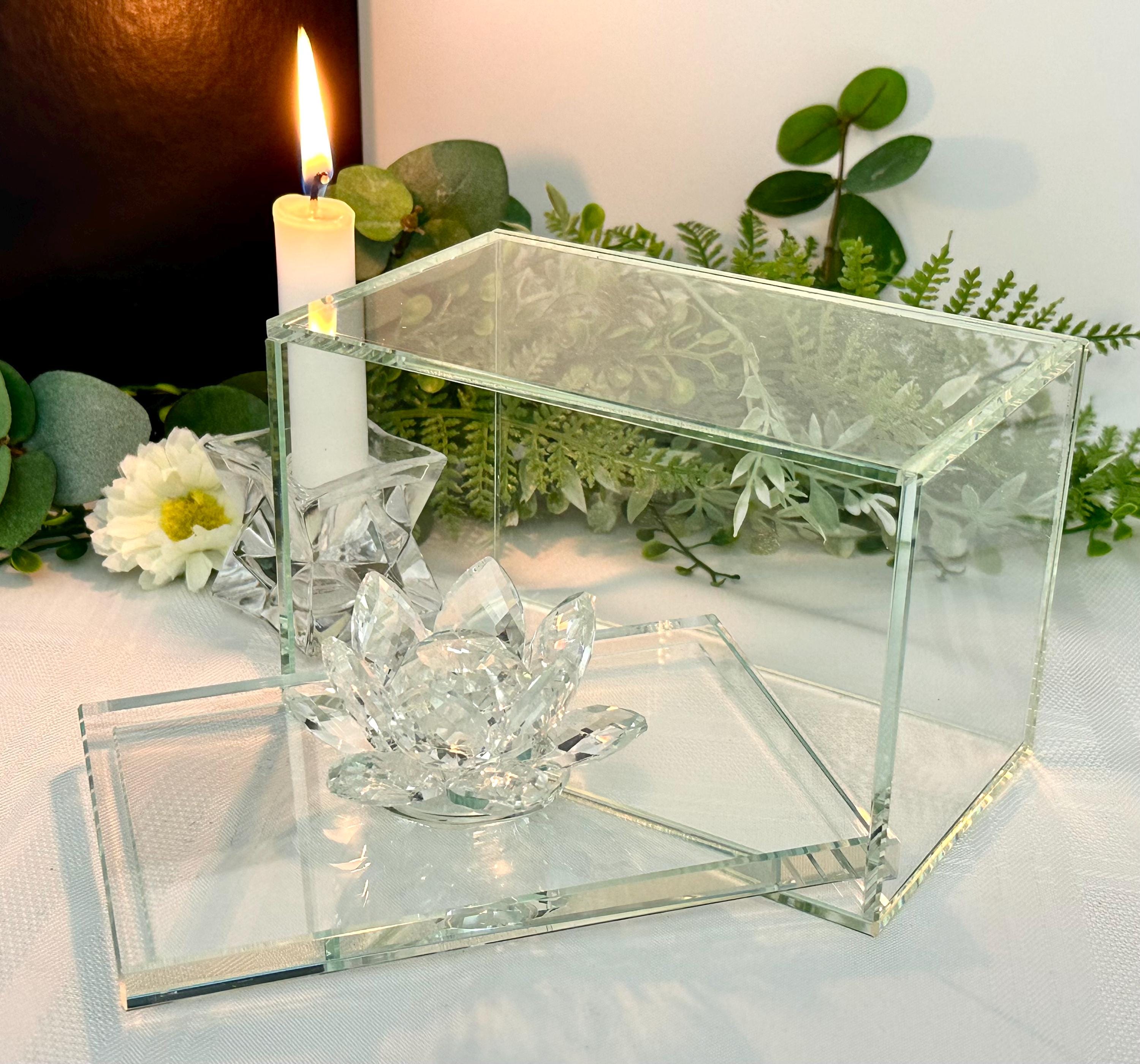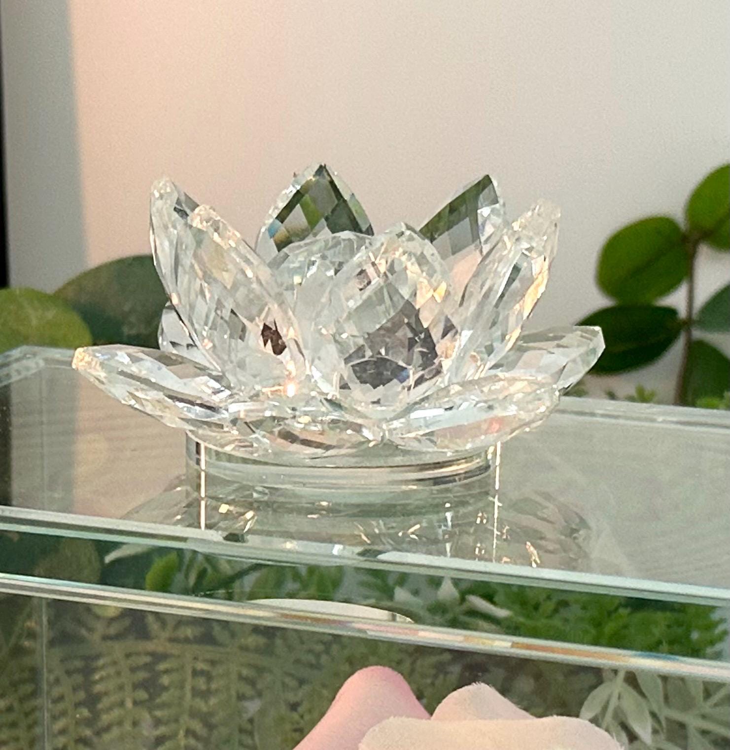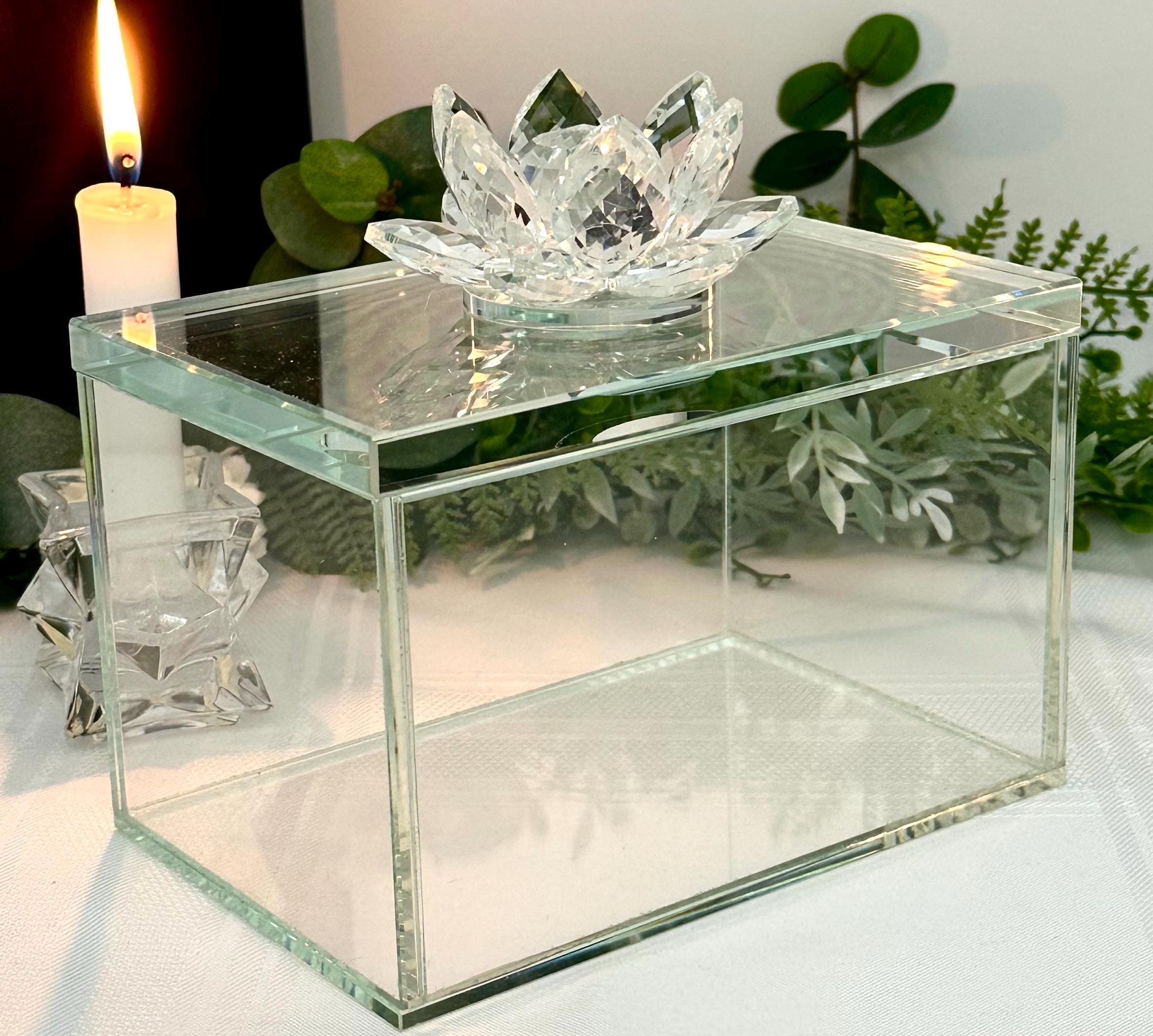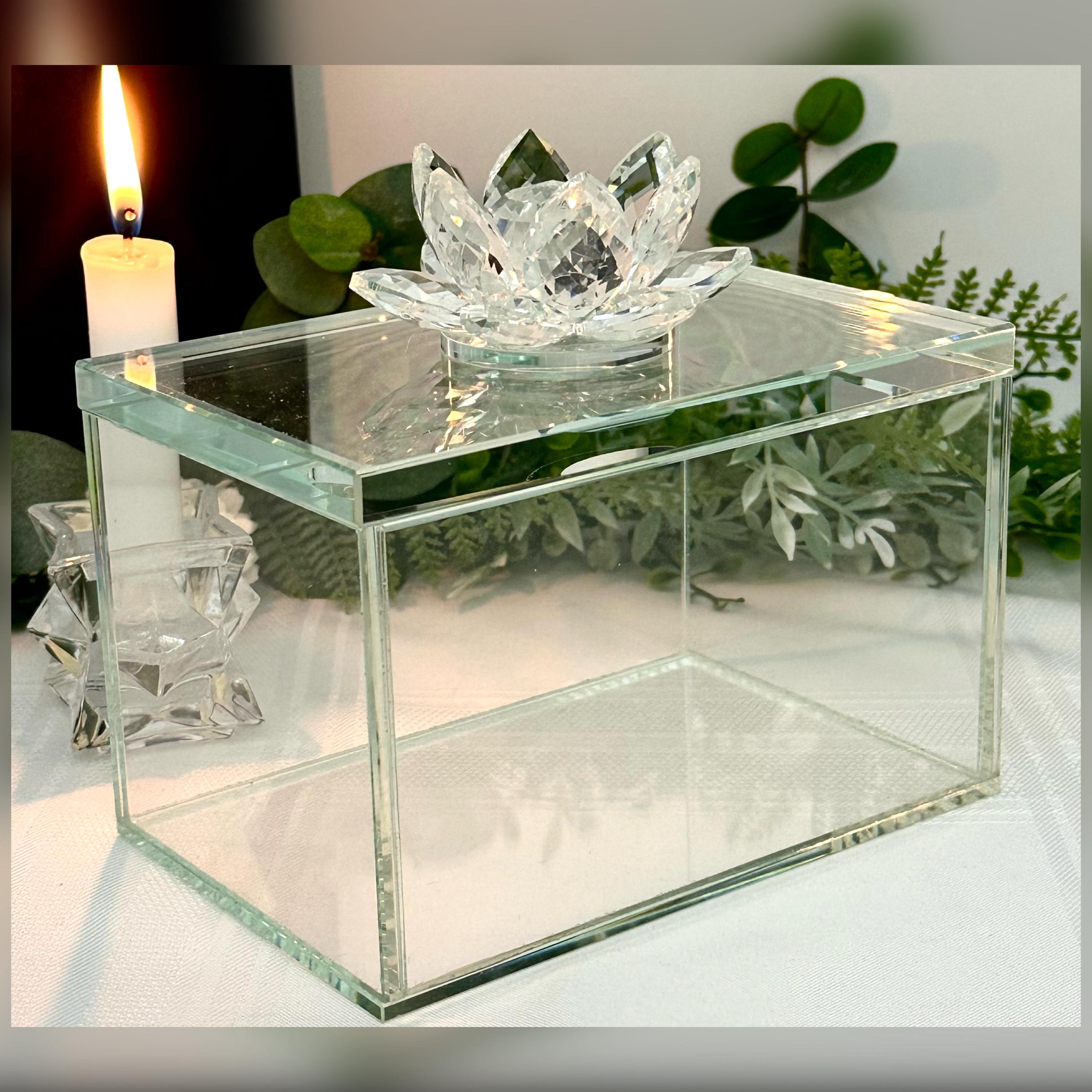 This decorative glass box features a crystal lotus flower design, making it an elegant and modern trinket box suitable for all occasions. Measuring 6 inches in length, 5.5 inches in height, and 4 inches in width, this clear glass box is perfect for storing jewelry or small keepsakes.