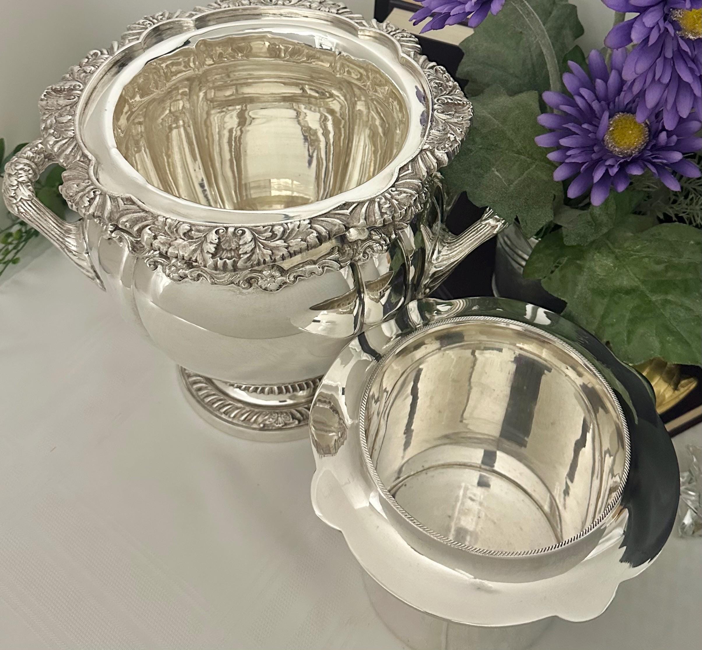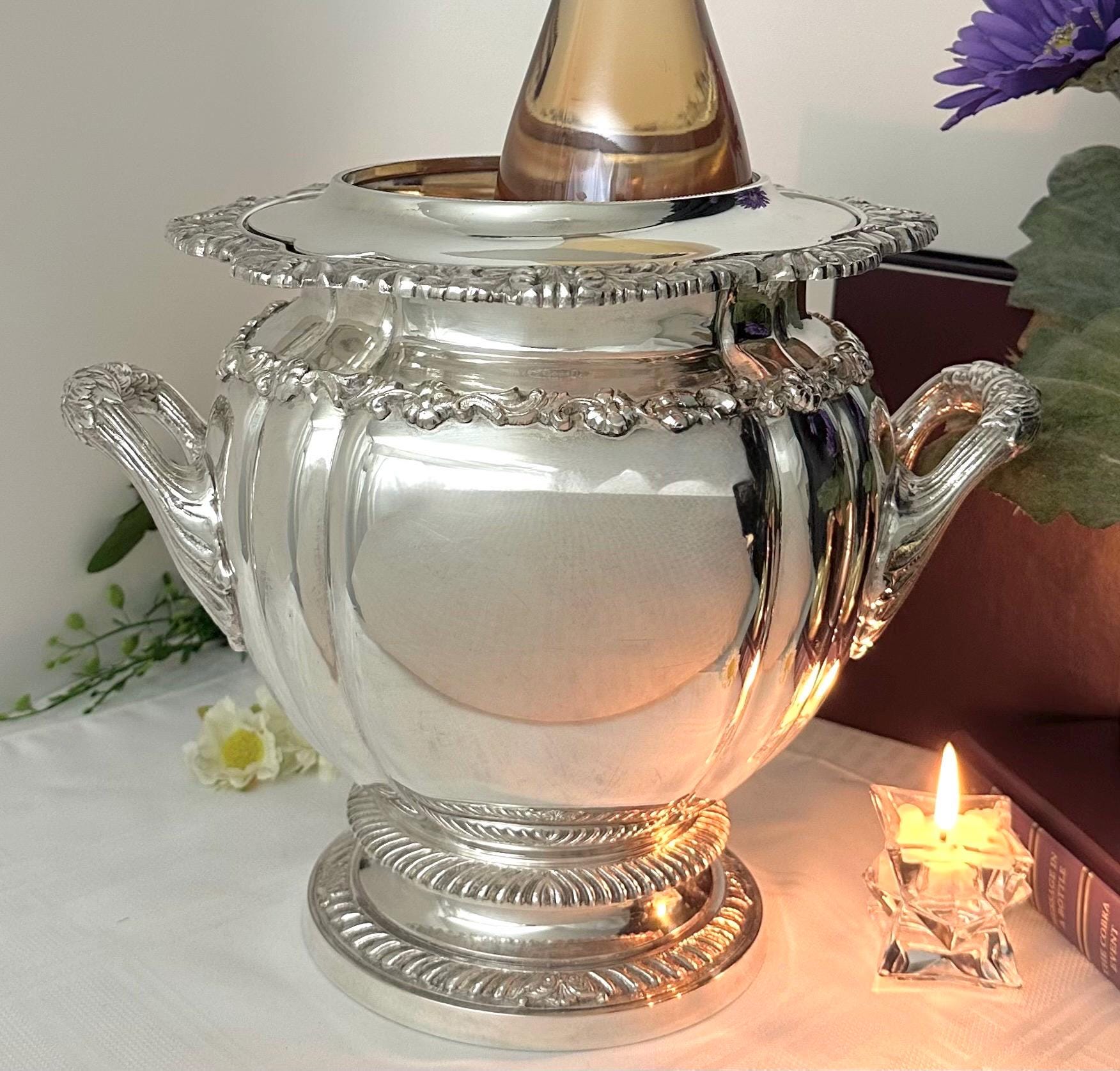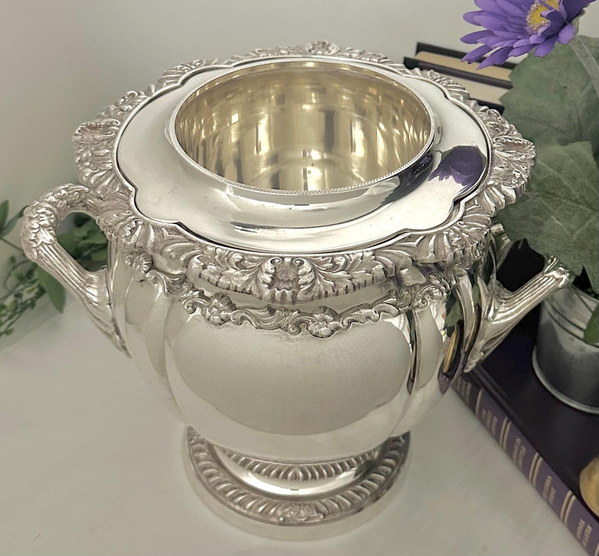 This bucket is a testament to the craftsmanship of the period, designed to keep your champagne and wine at the perfect temperature. The Wine Cooler measures: 10 inches tall x 12 inches wide x 9 inches deep. The bucket feature a durable silver-plated composition, with the interior measuring 9 inches deep and 5 inches in diameter.