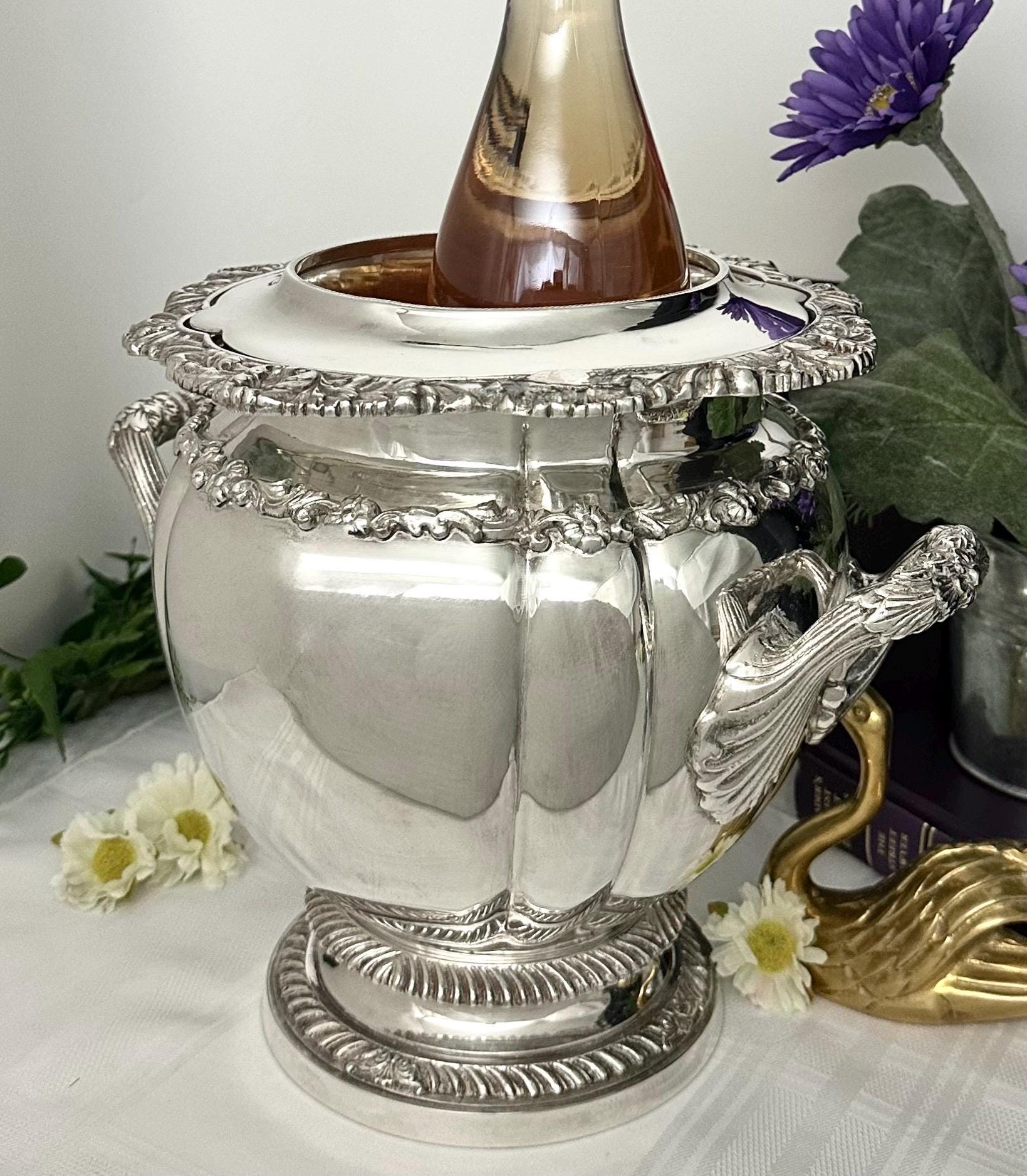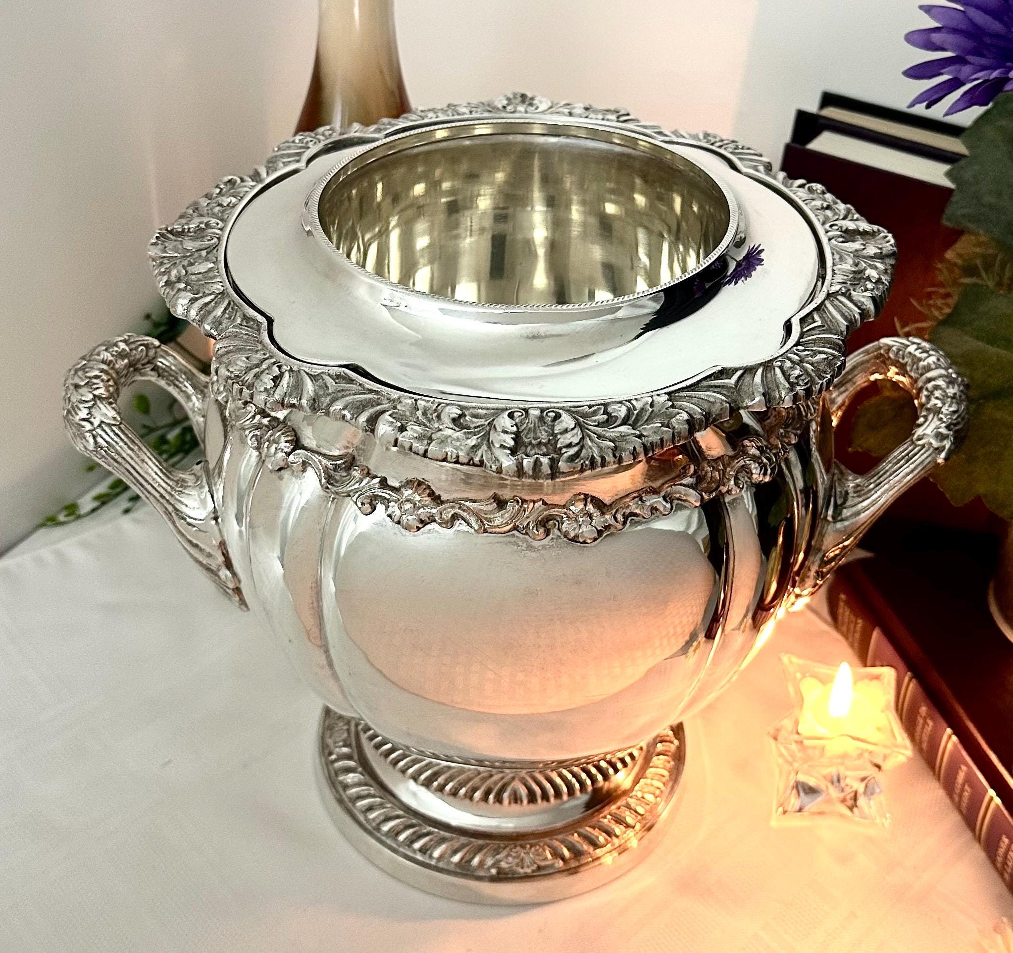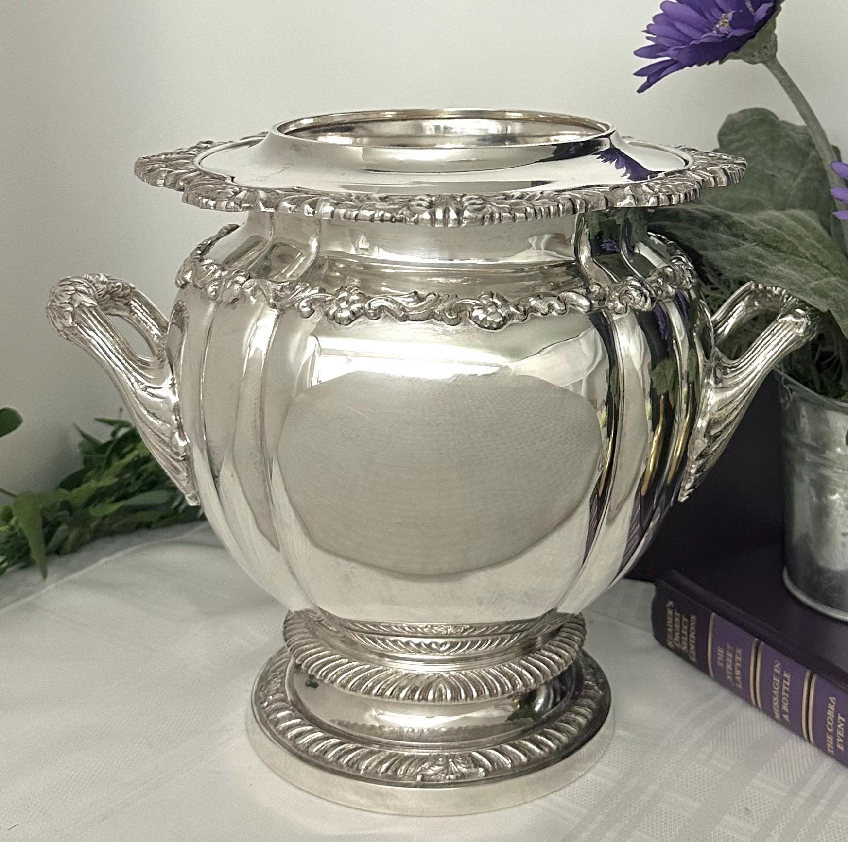 This bucket is a testament to the craftsmanship of the period, designed to keep your champagne and wine at the perfect temperature. The Wine Cooler measures: 10 inches tall x 12 inches wide x 9 inches deep. The bucket feature a durable silver-plated composition, with the interior measuring 9 inches deep and 5 inches in diameter.