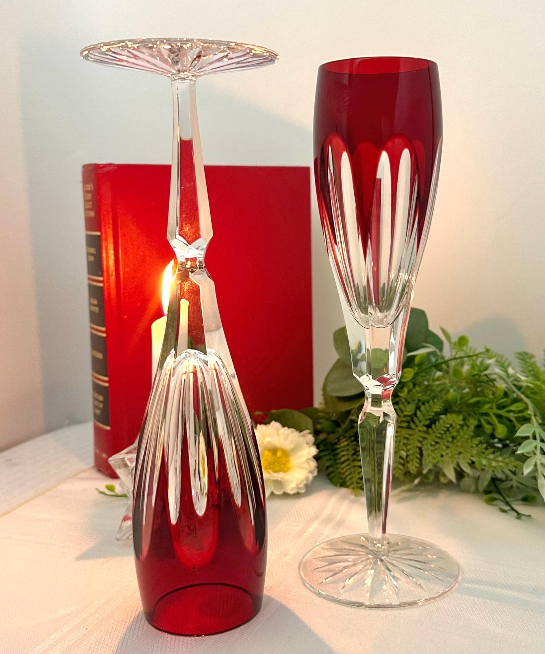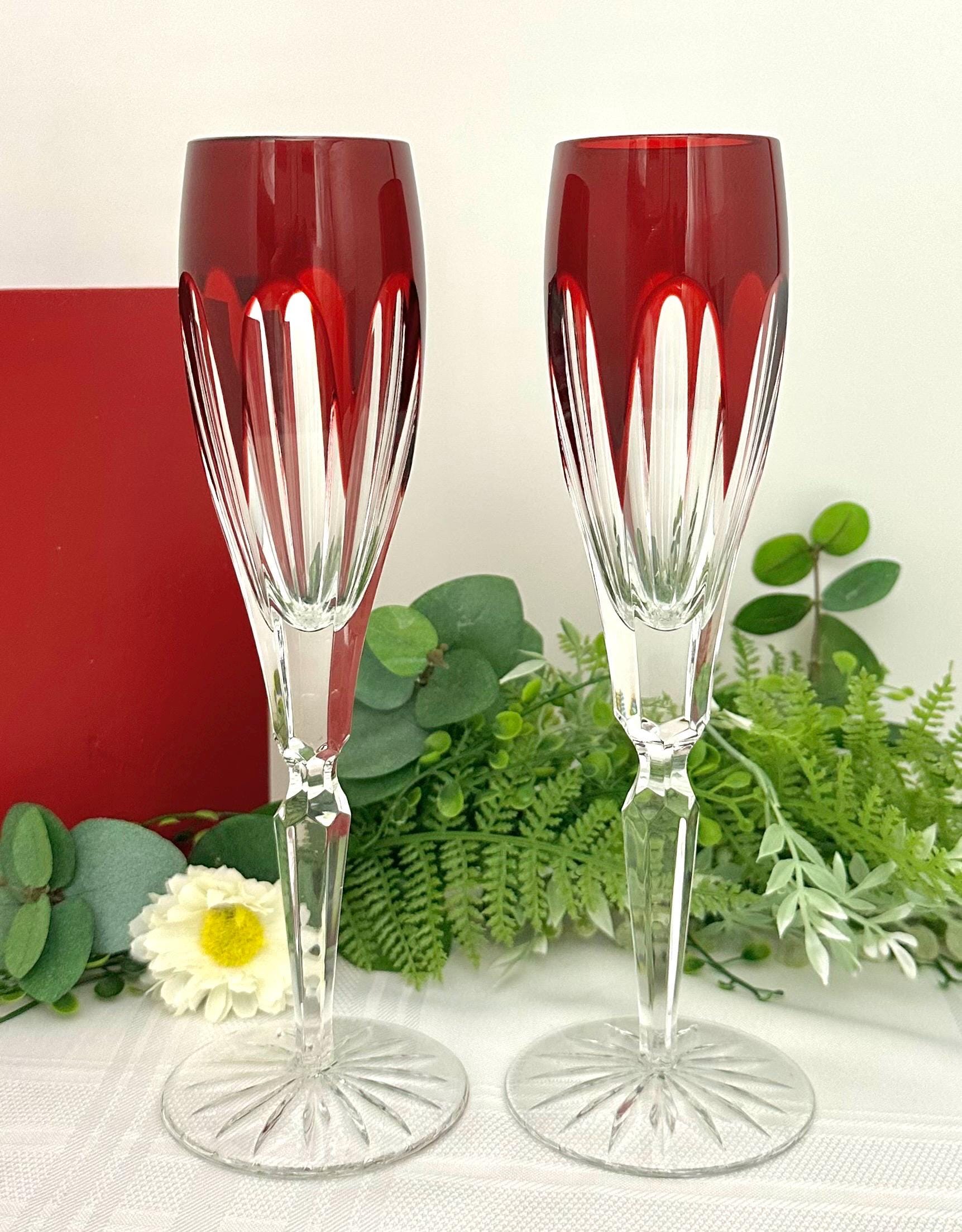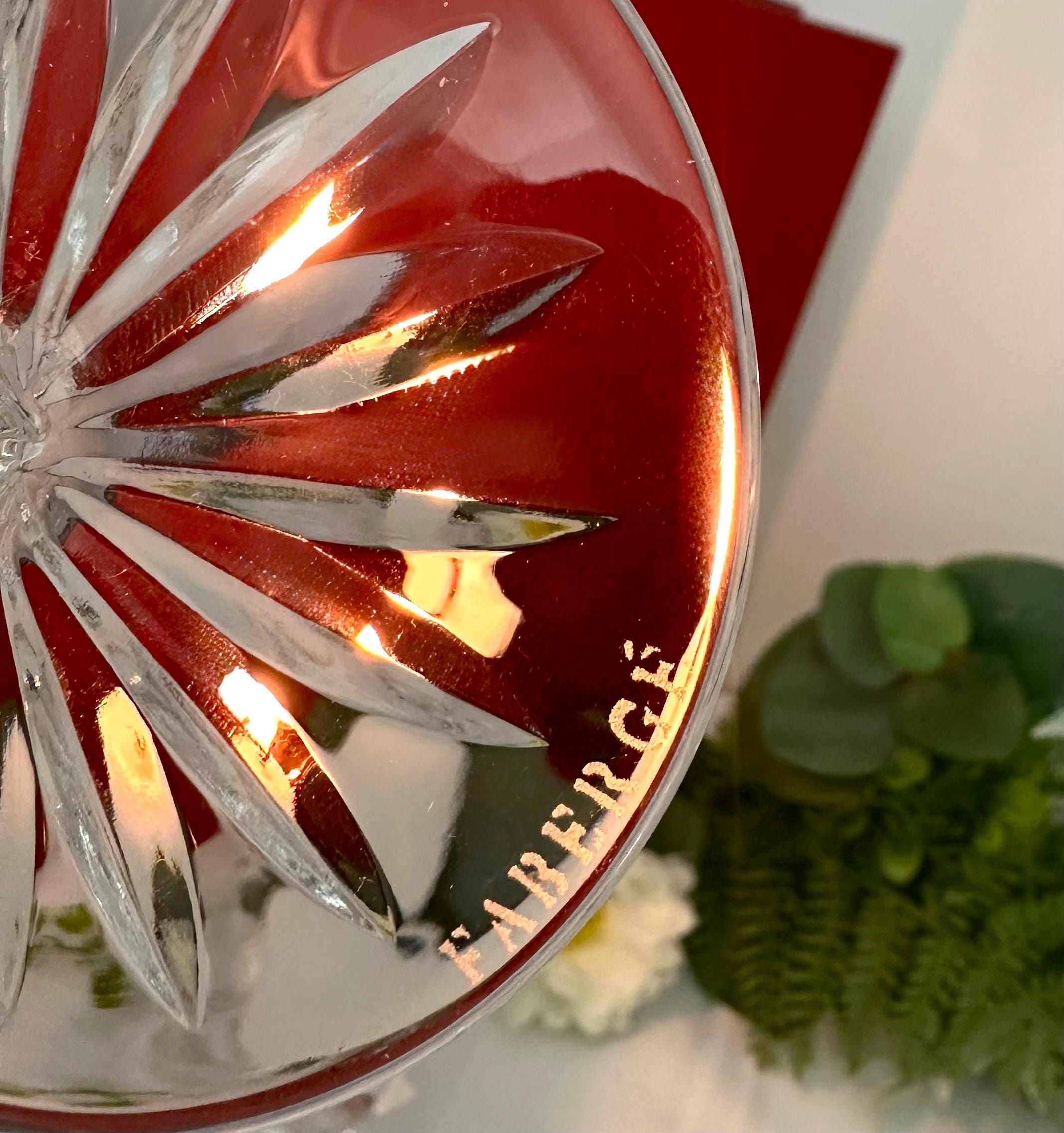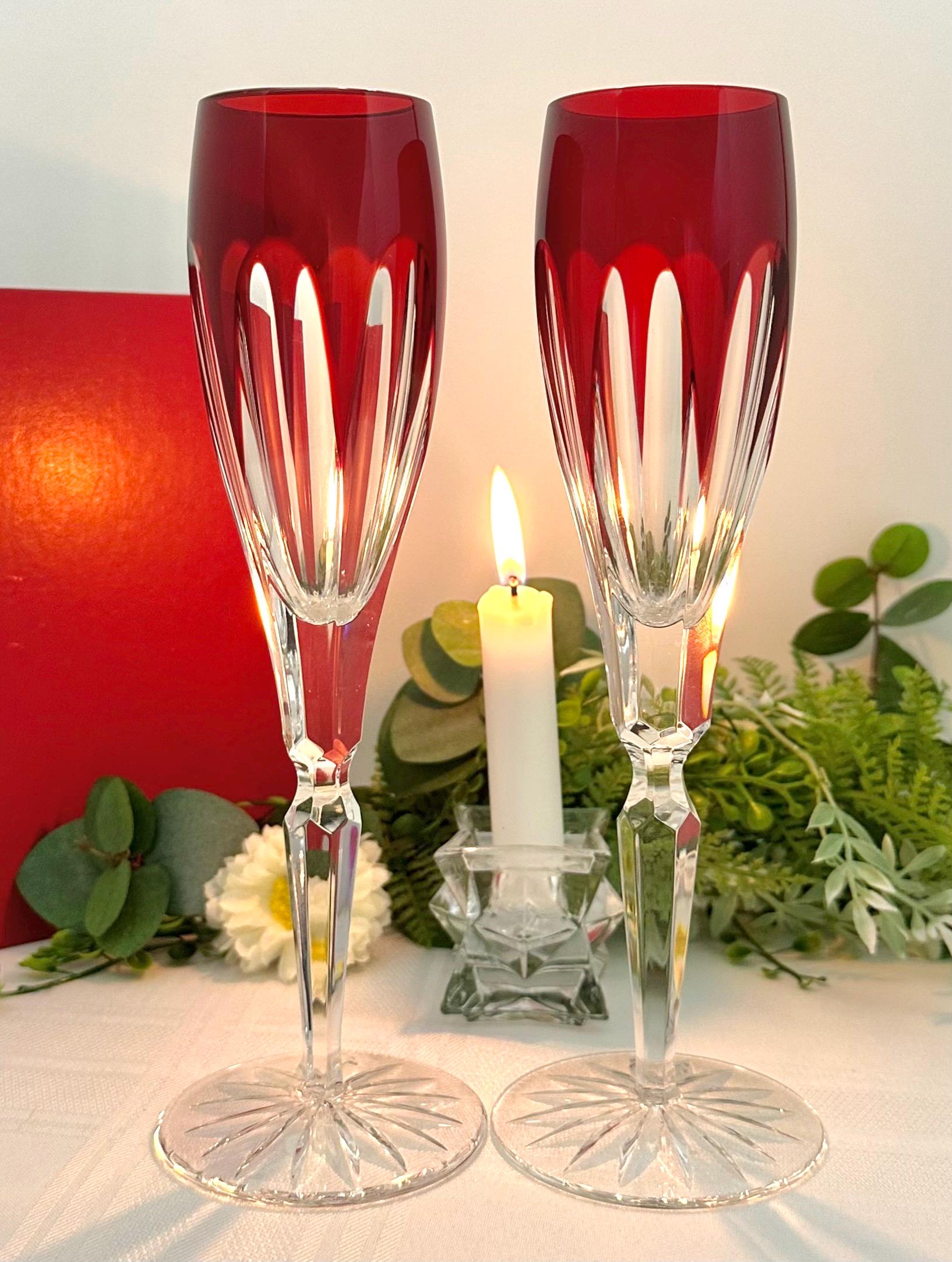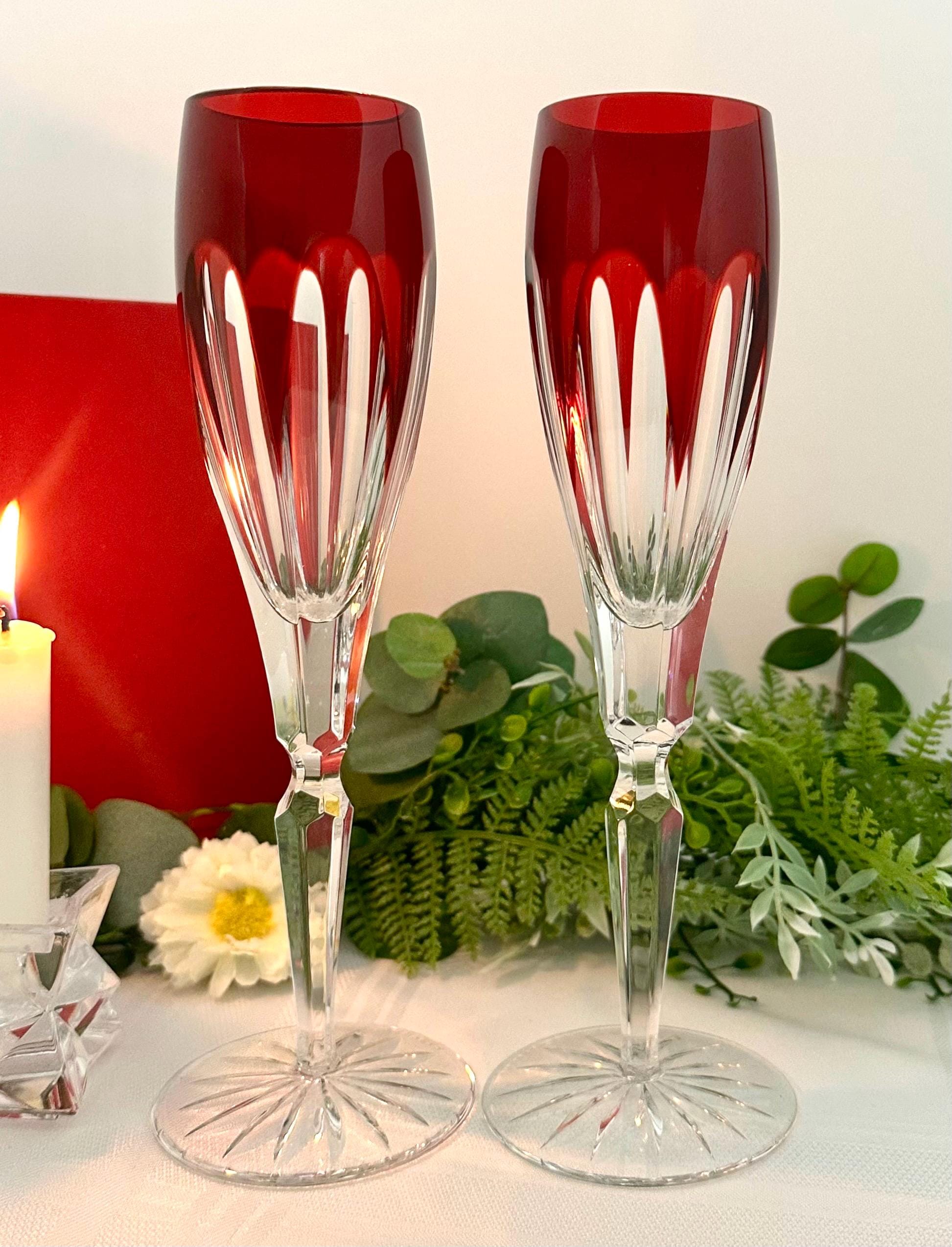 This is for 2 Red Lausanne Faberge Champagne Flutes. These vintageToasting Faberge Champagne Glasses are a stunning two-piece set perfect for all celebratory occasions. They have a clear stem and a beautiful ruby red cut to clear bowl. As these are hand crafted there are slight differences in the cut on the stems.