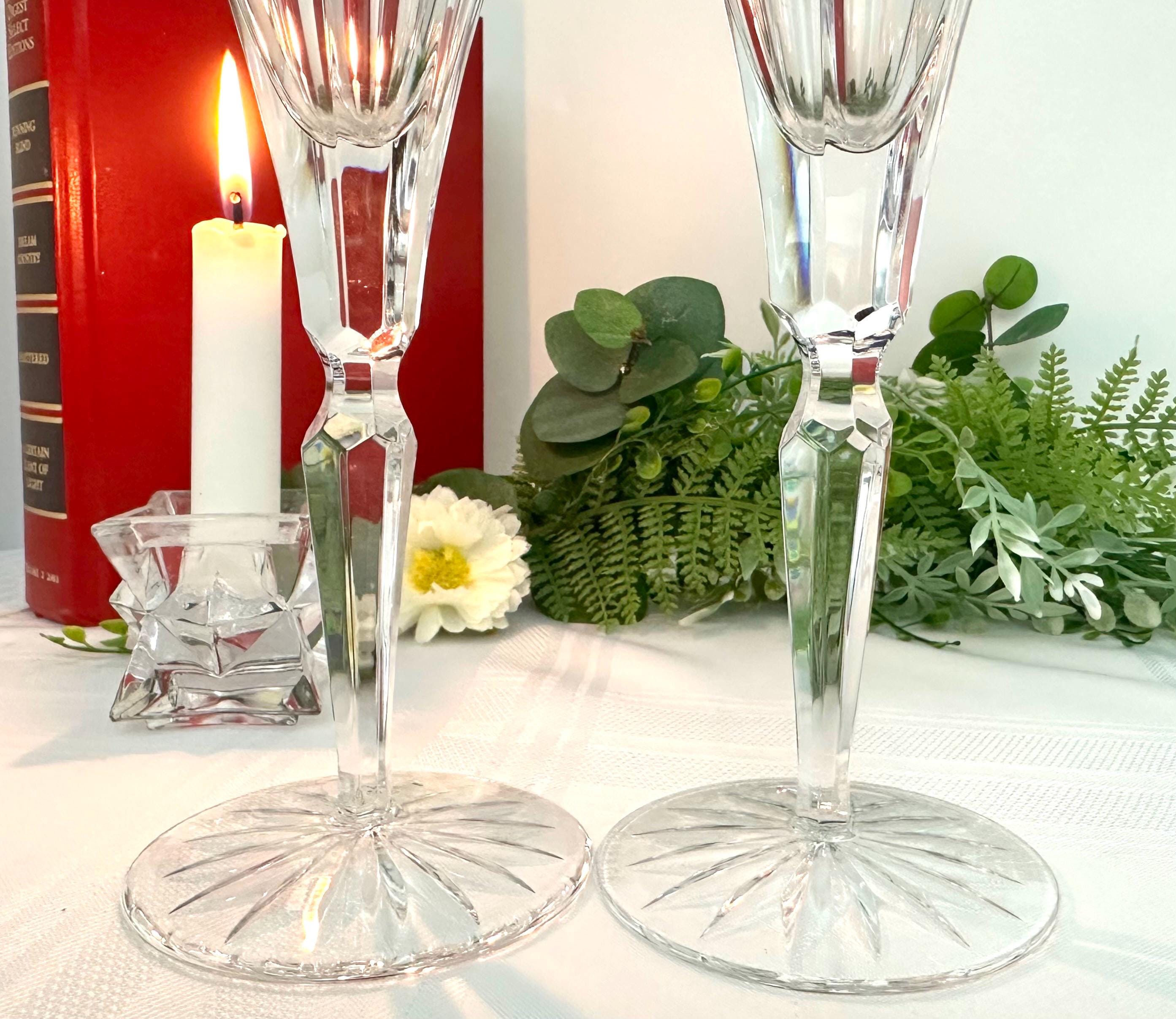 With a modern, contemporary design featuring panel cuts, these elegant champagne flutes stand at 9 inches tall with a diameter of 2 inches. Handmade and branded by Faberge, these toasting glasses are perfect for celebrating special moments like weddings.