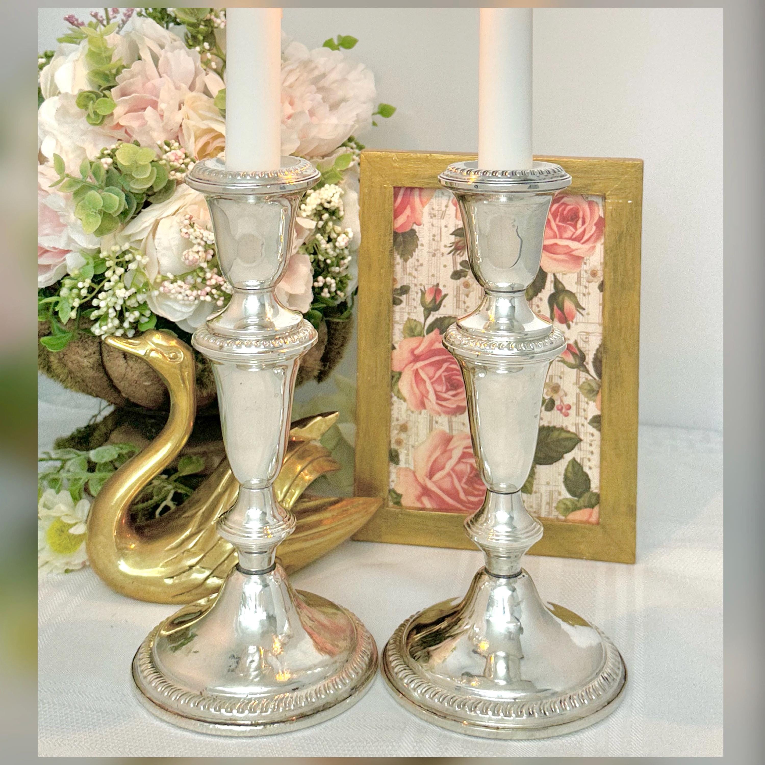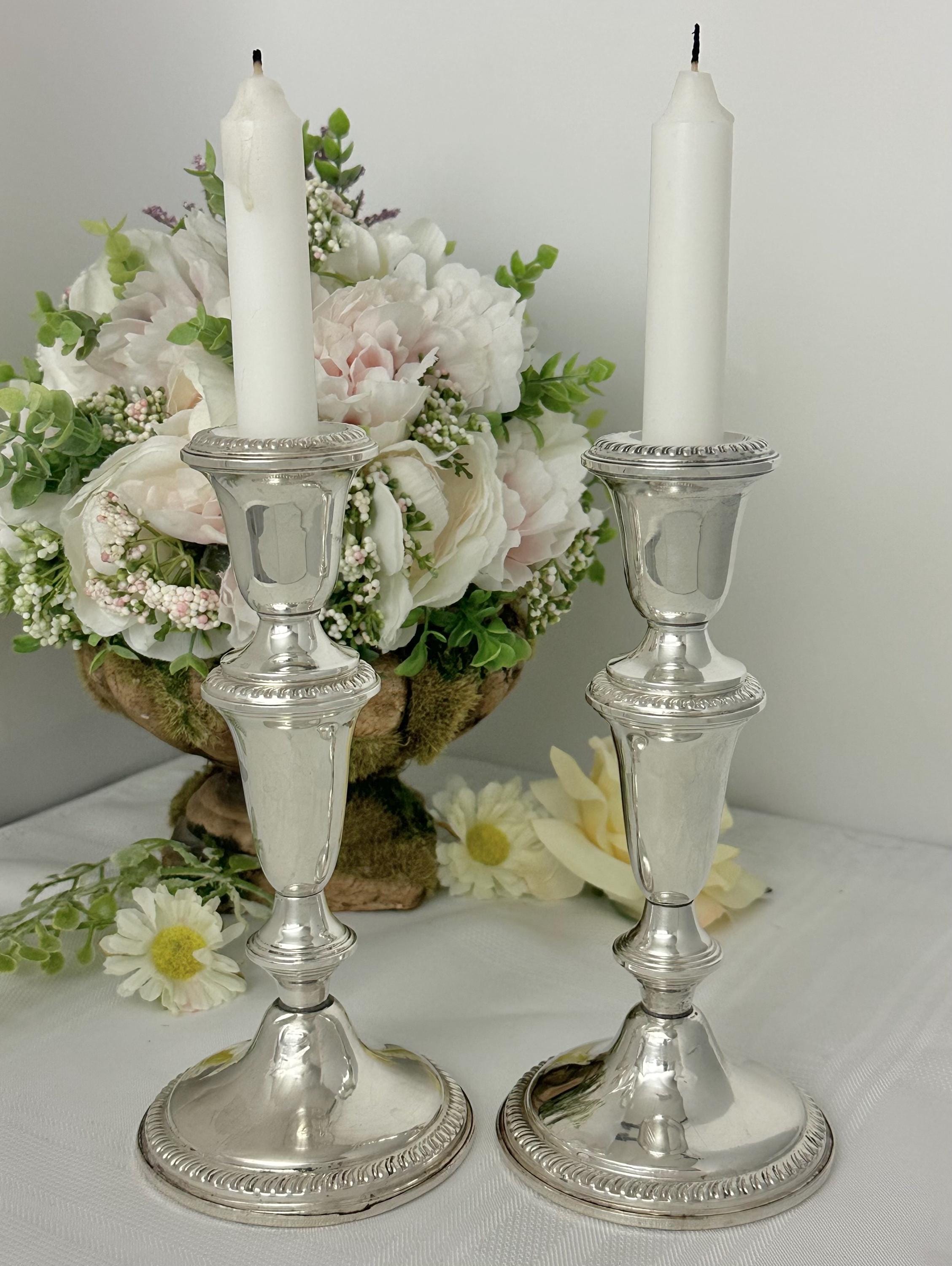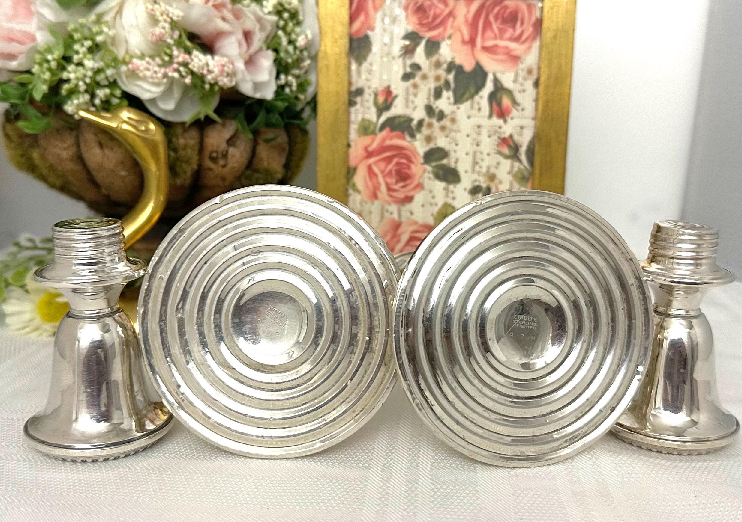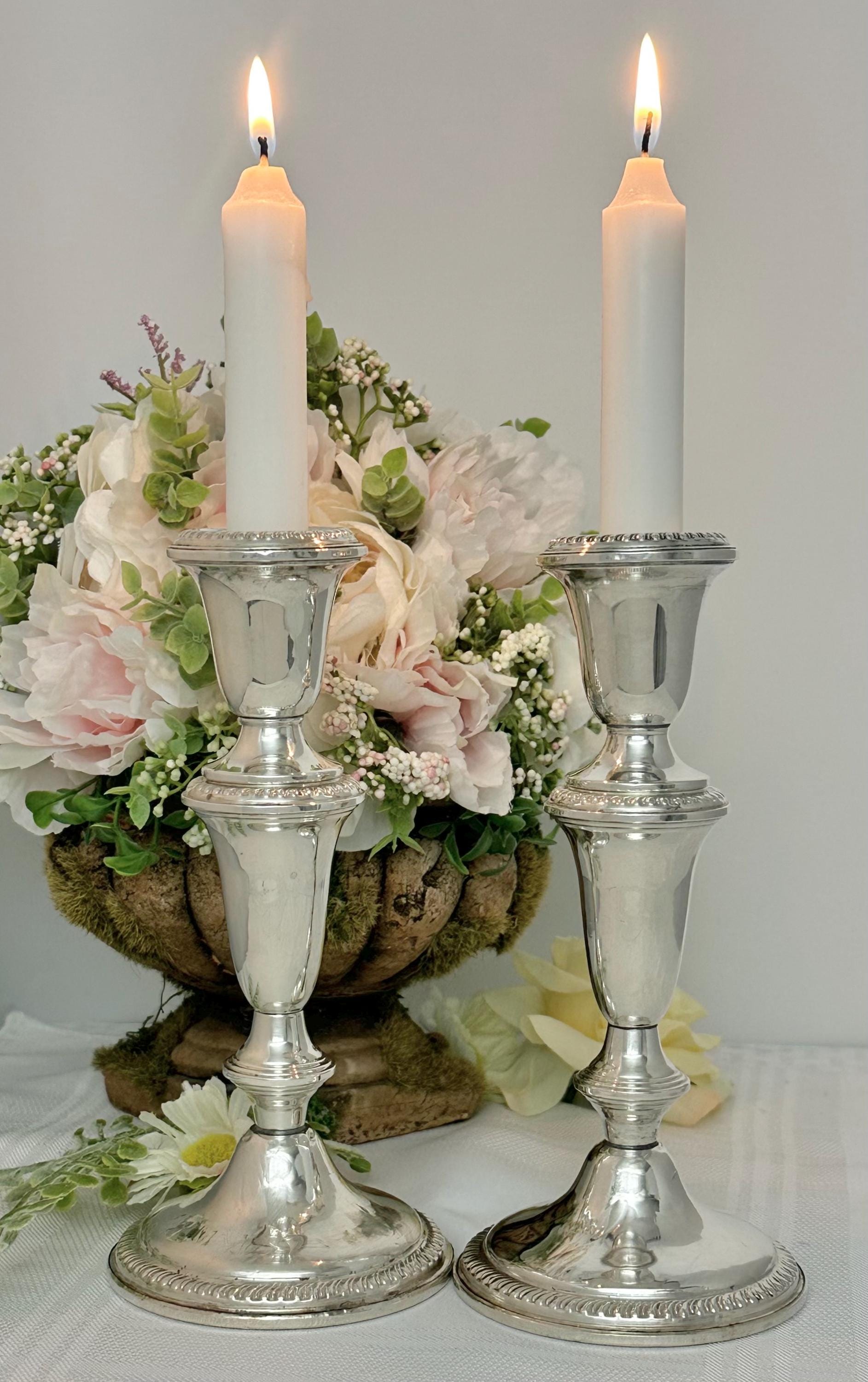 This is for a pair of vintage Empire Sterling Silver Candlesticks. These exude traditional elegance with their classic design. Made from high-quality sterling silver (.925), these candle holders stand at 7.25 inches tall with a diameter of 3.5 inches.