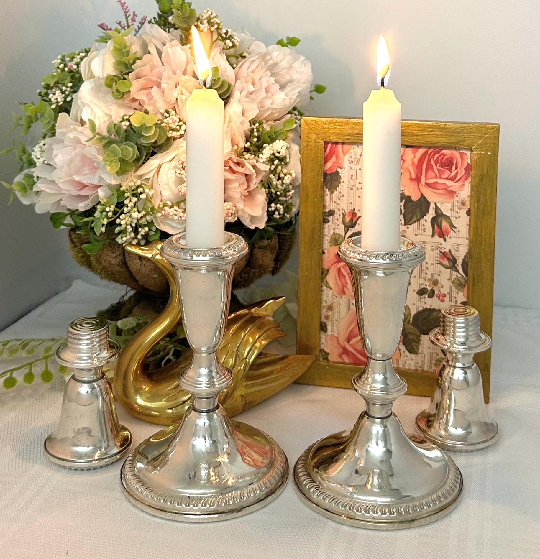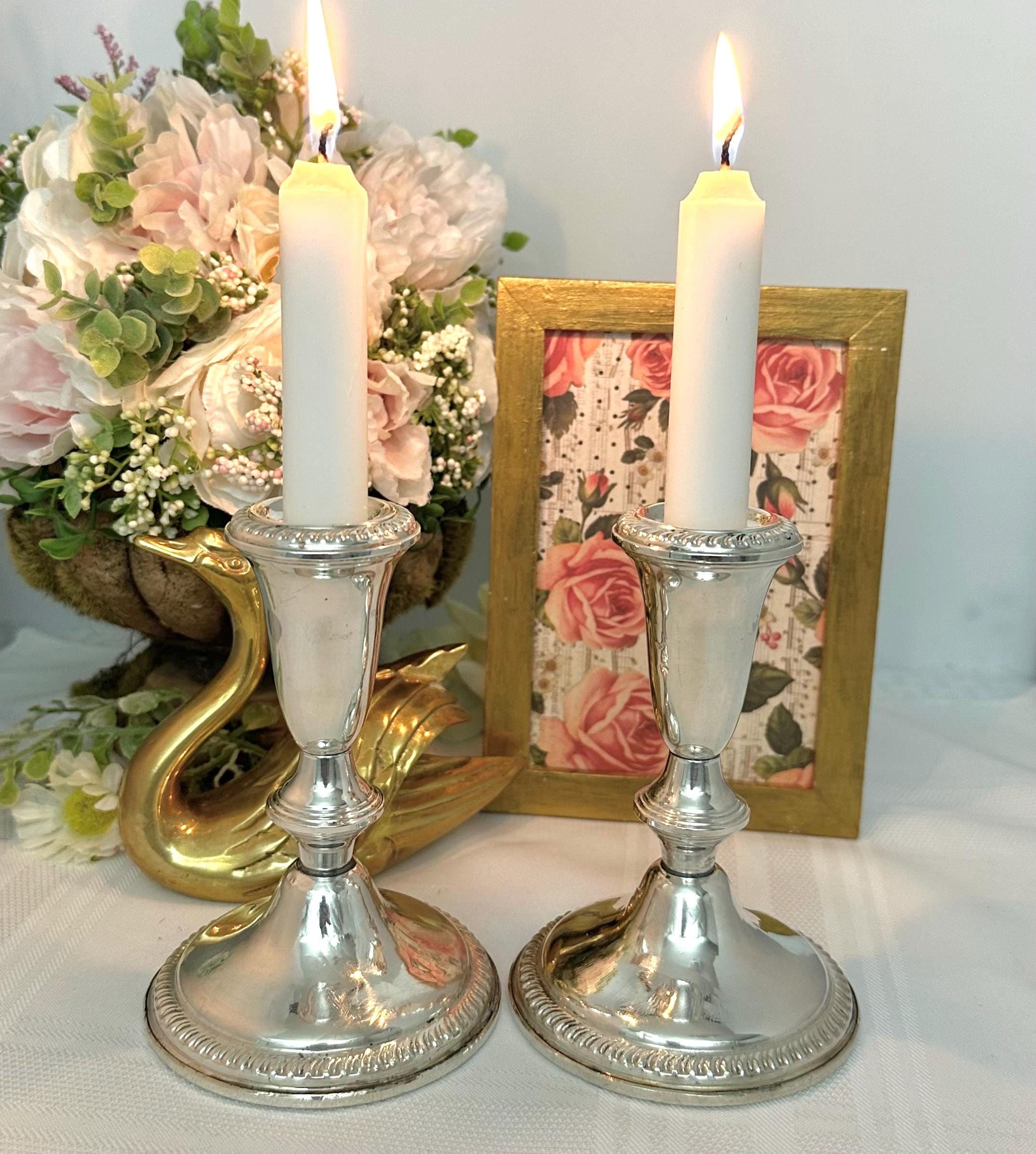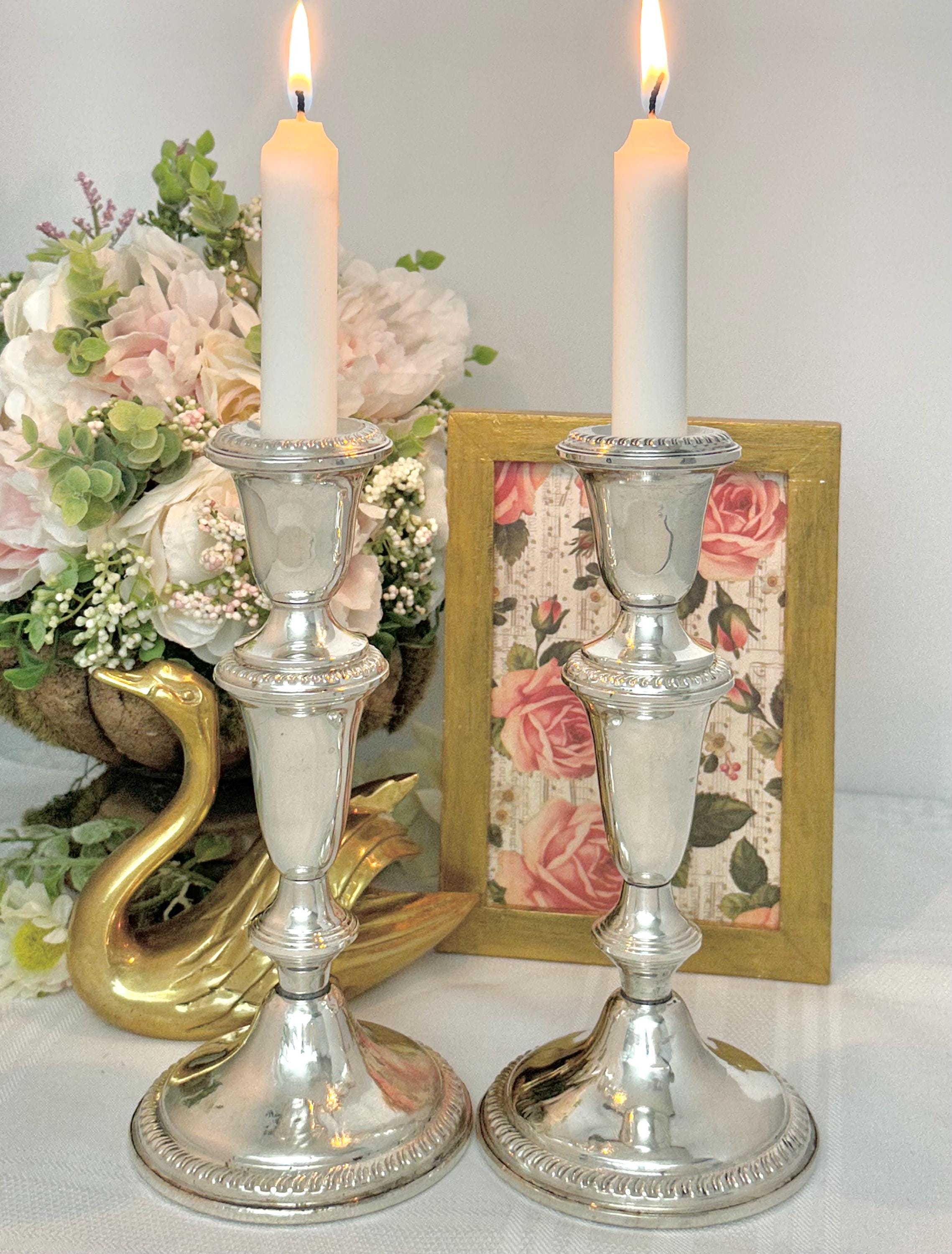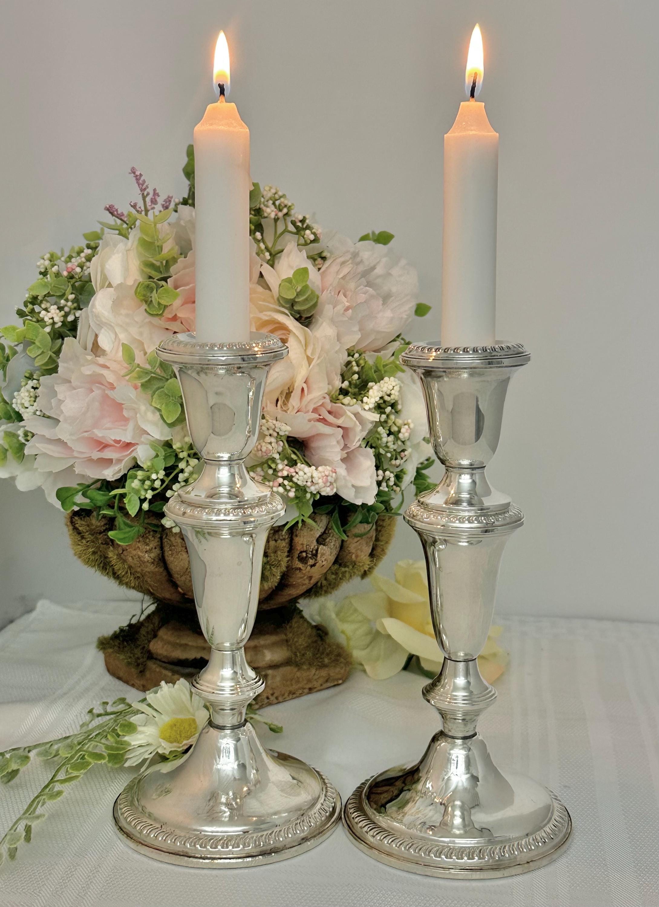 This is for a pair of vintage Empire Sterling Silver Candlesticks. These exude traditional elegance with their classic design. Made from high-quality sterling silver (.925), these candle holders stand at 7.25 inches tall with a diameter of 3.5 inches.