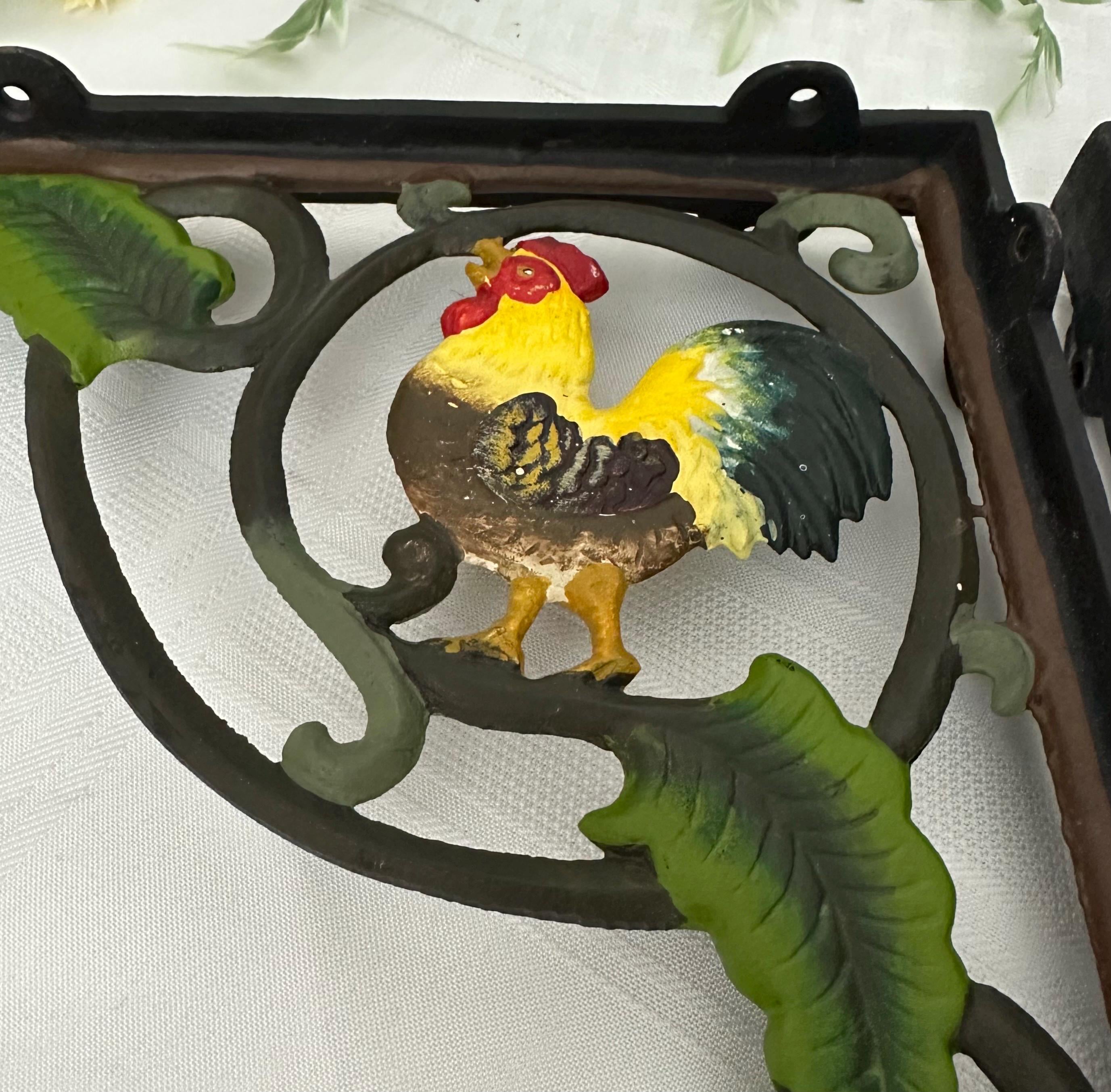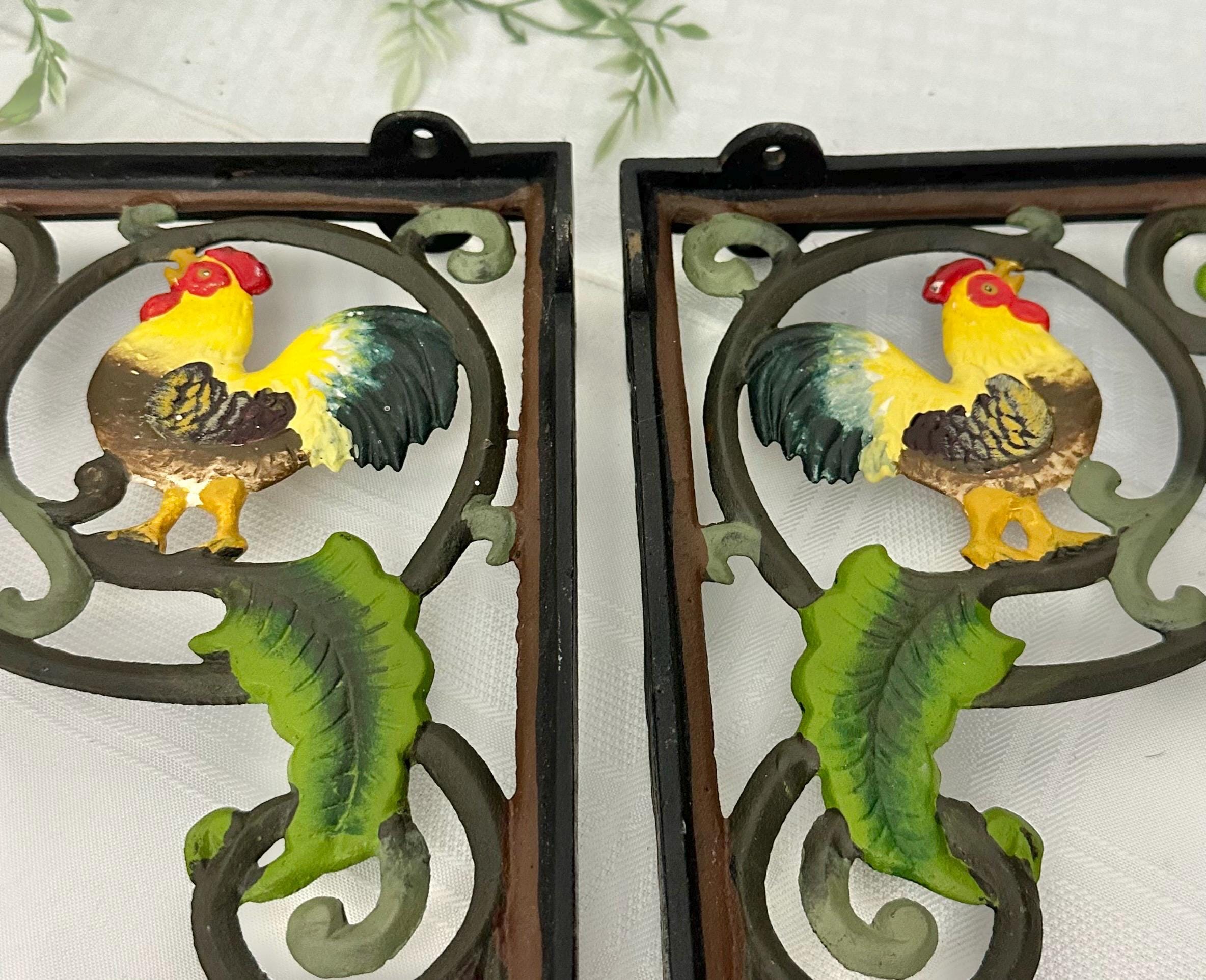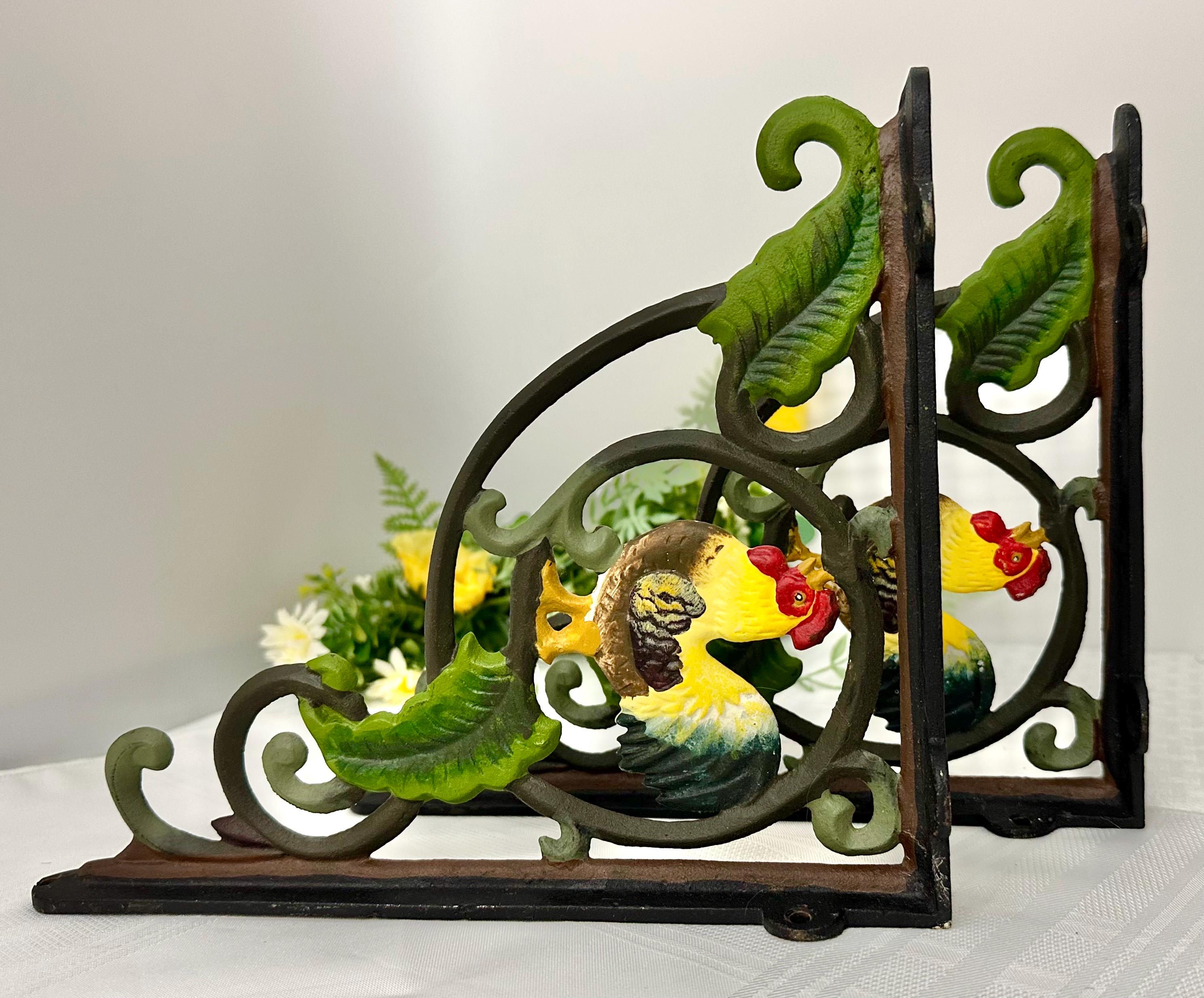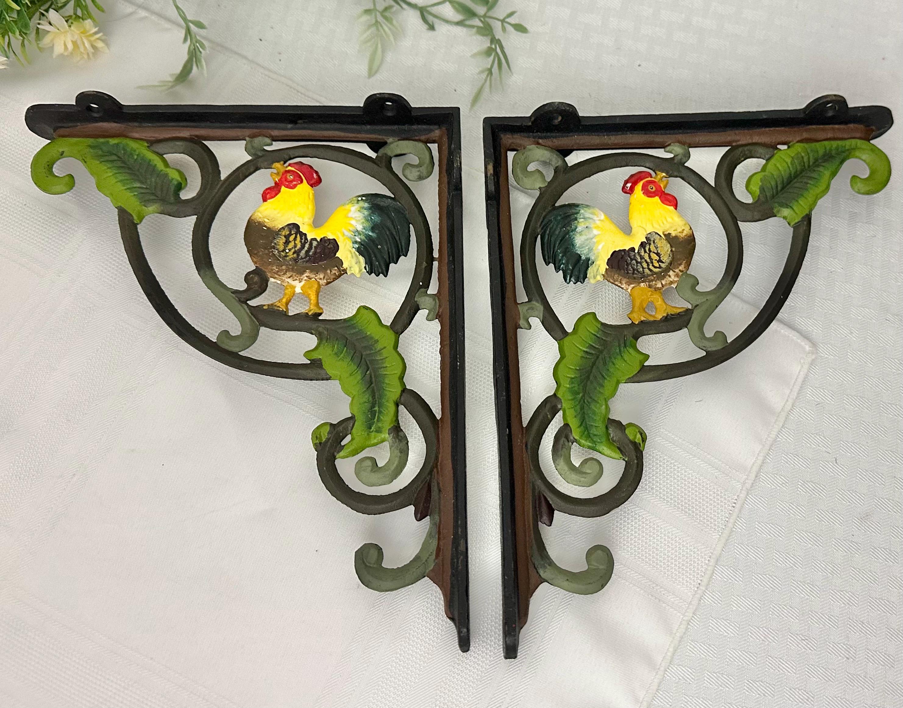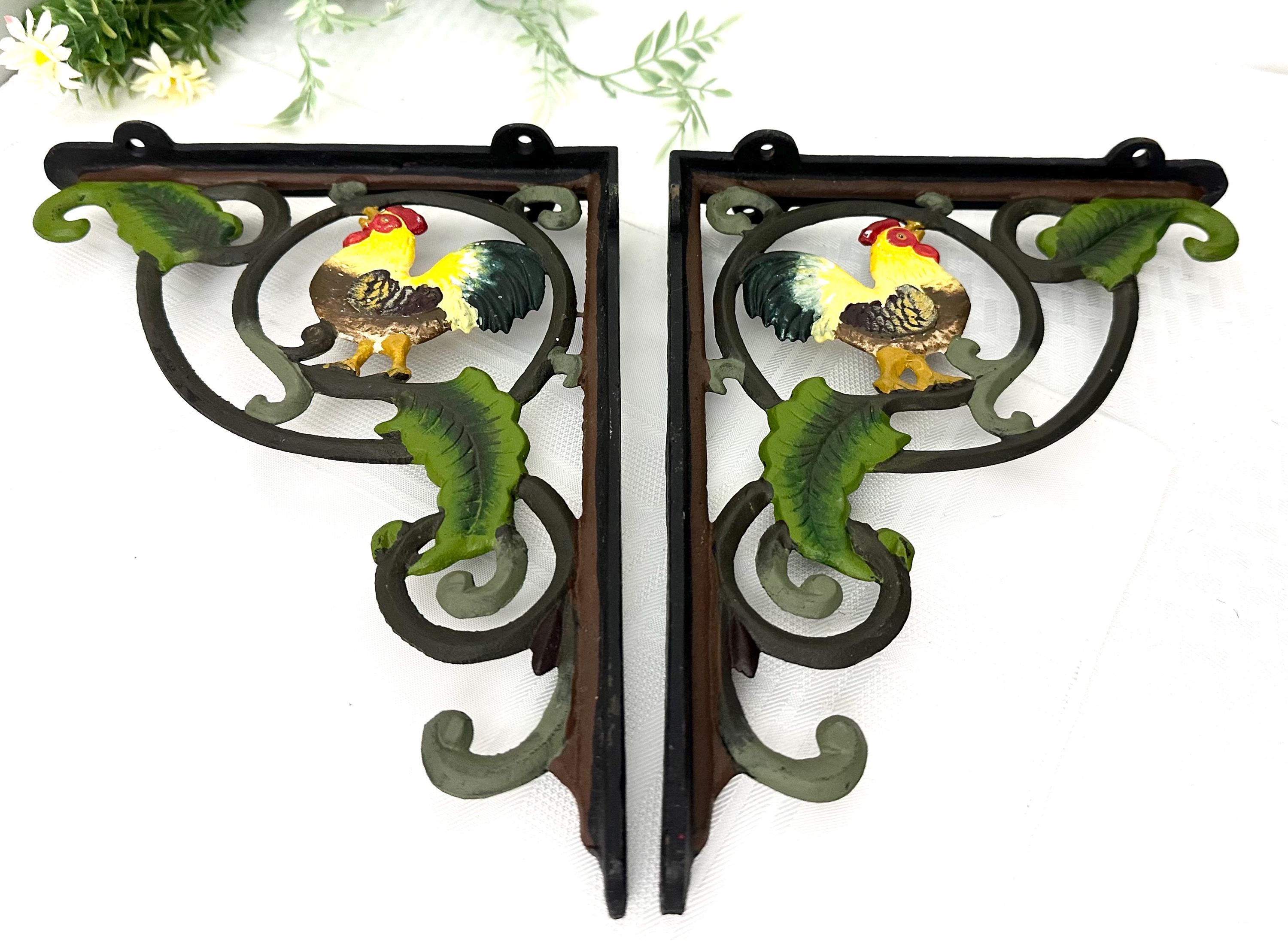 This product is a Pair of vintage hand-painted cast iron Rooster shelf brackets, designed for wall mounting. With a farmhouse style and animal shape, these medium-sized brackets are perfect for adding a touch of charm to your kitchen.