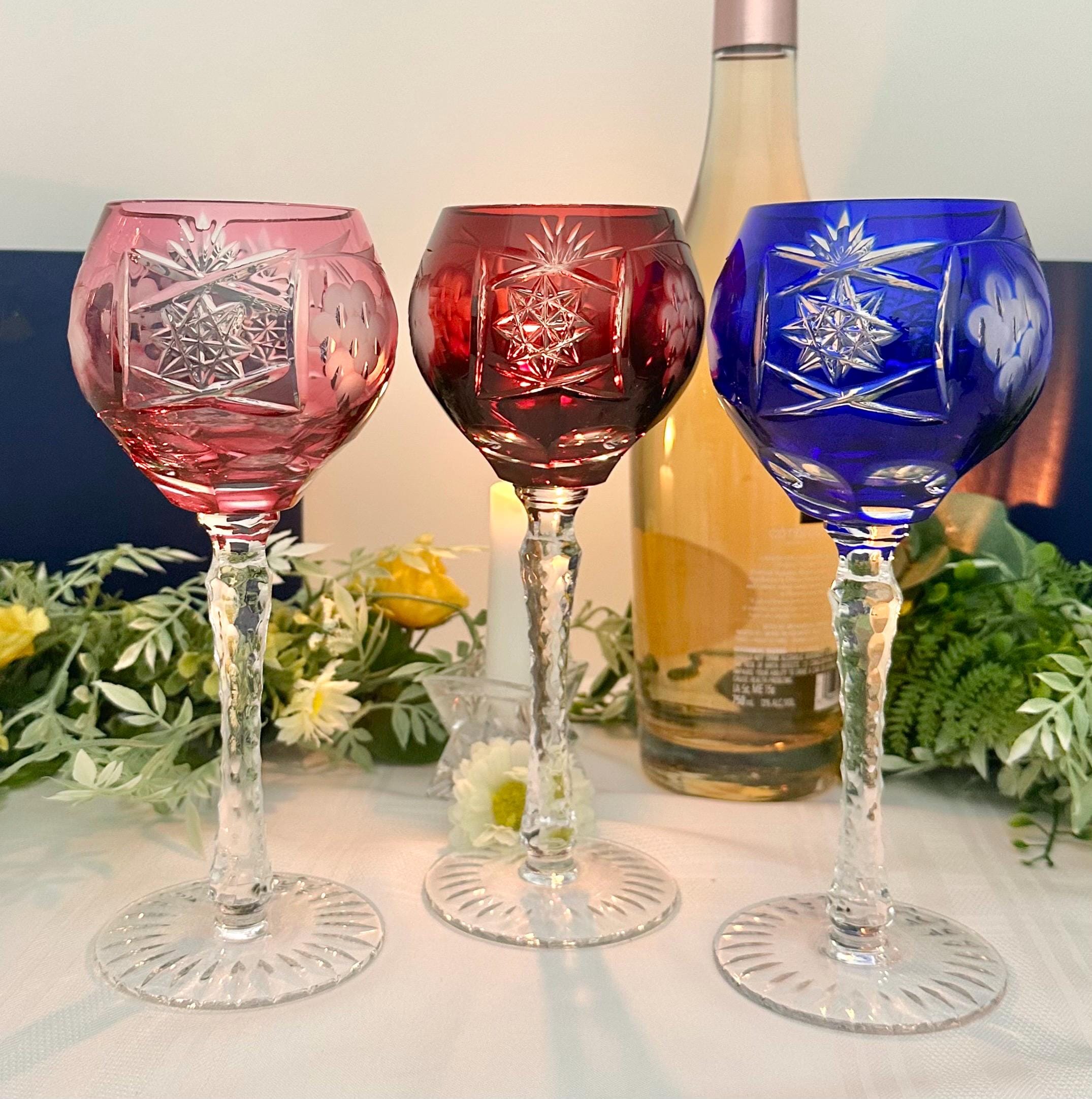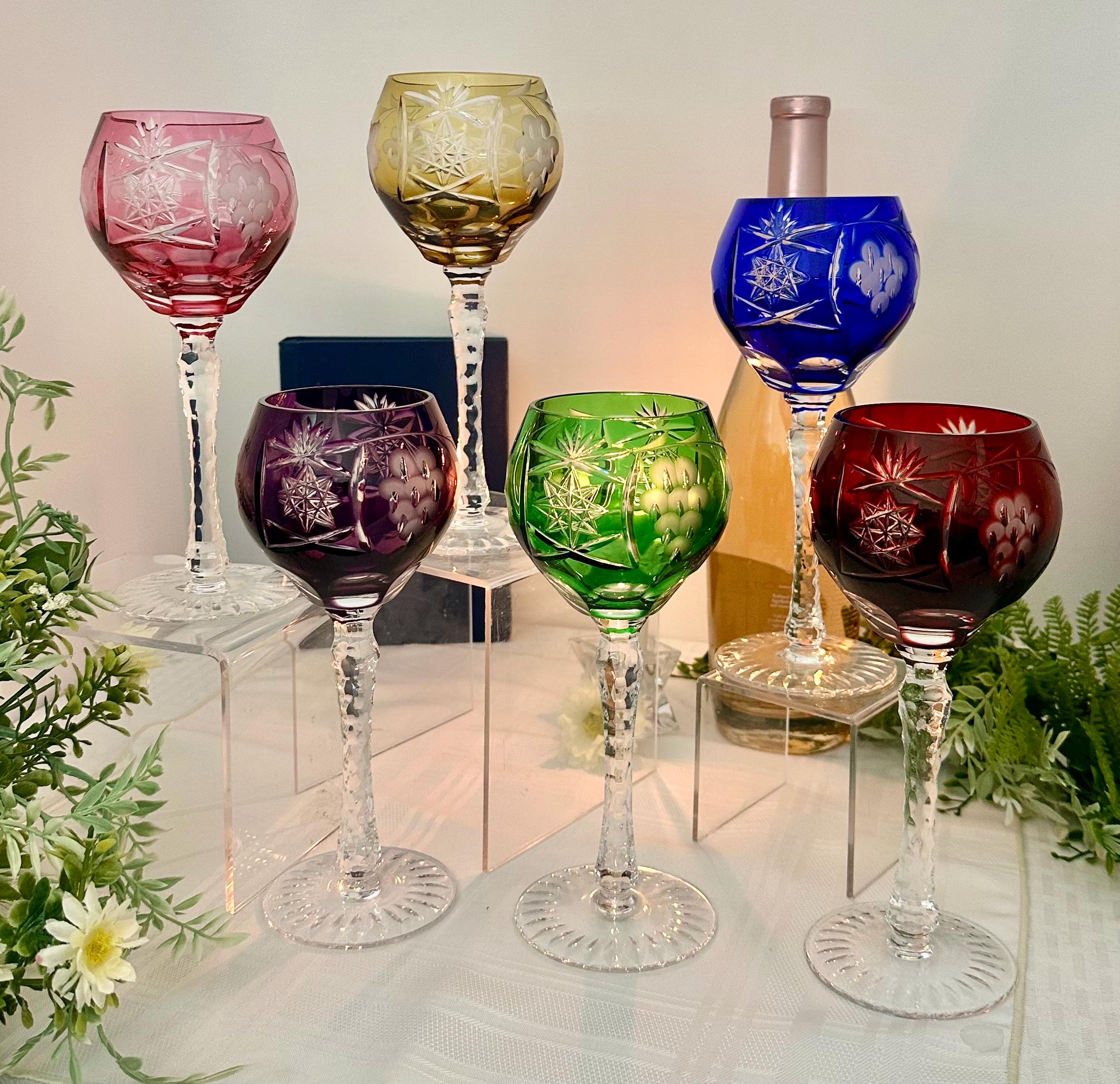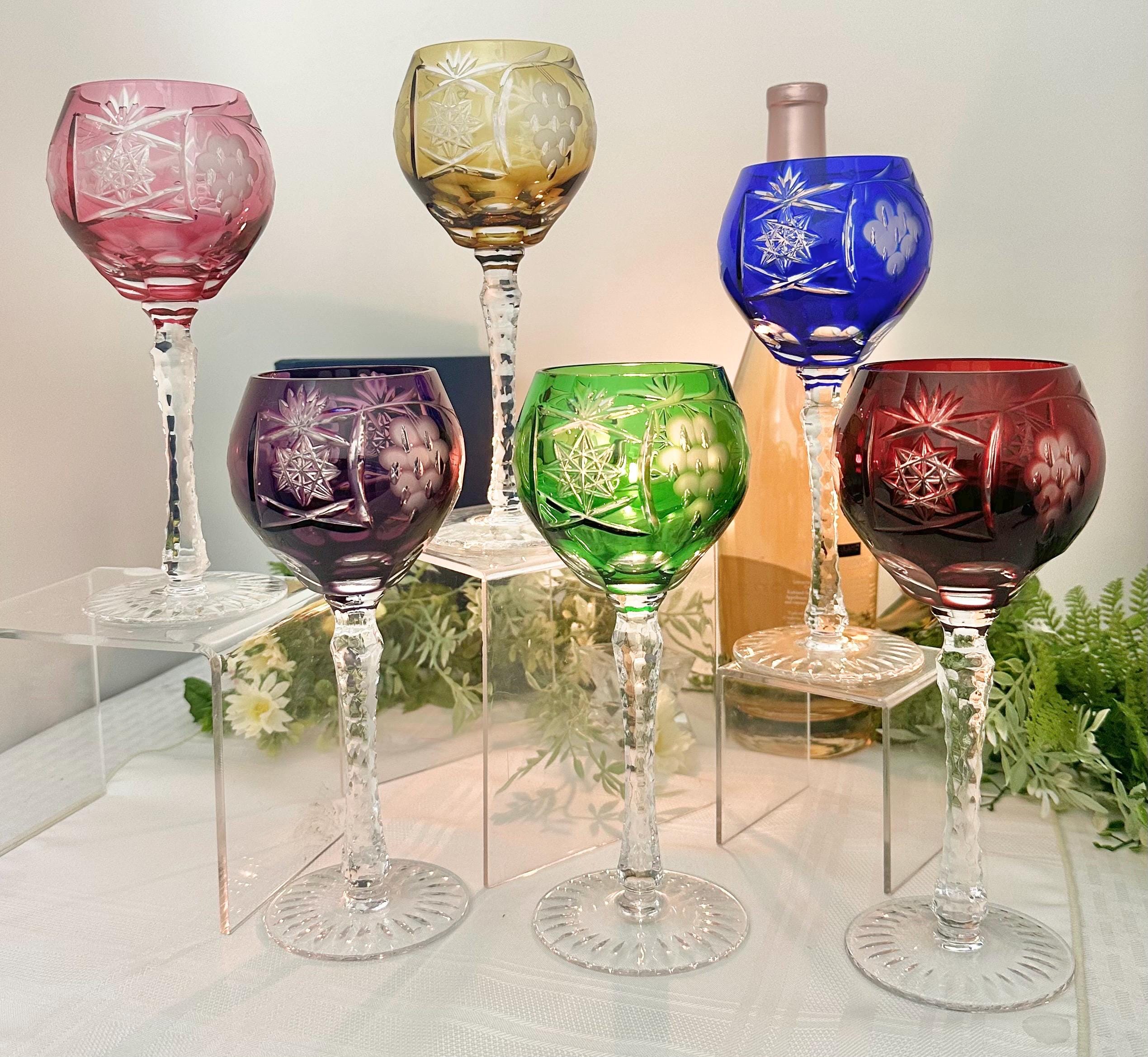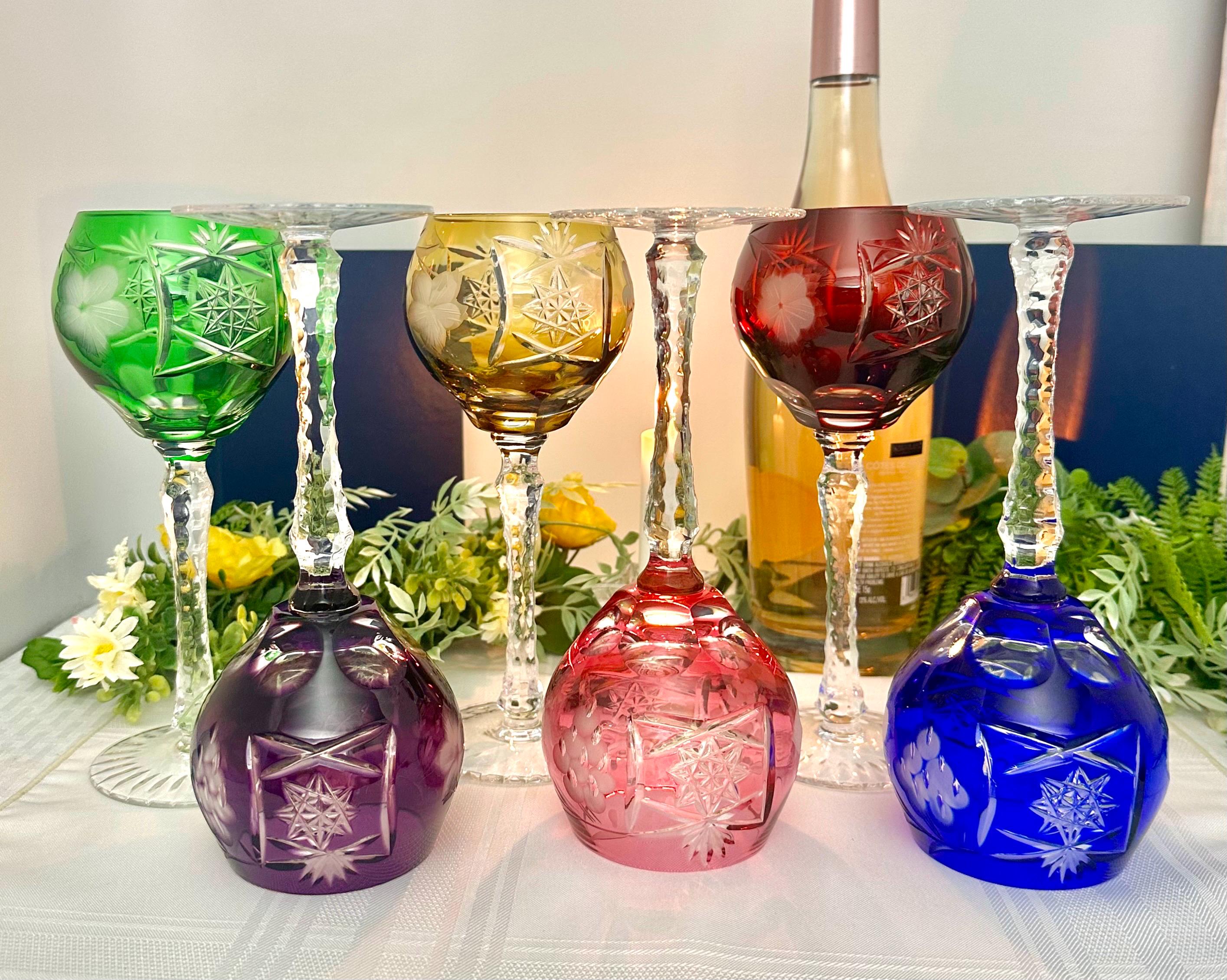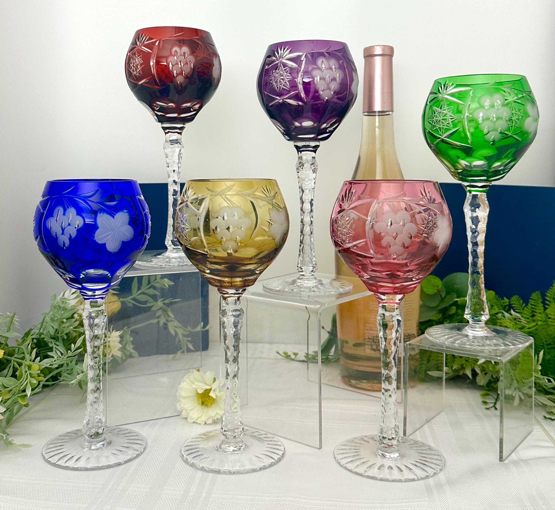 This product is a set of 6 vintage Bohemian colored wine glasses that are cut to clear in 6 different colors. These multicolored goblets are round in shape, stemmed, and have a capacity of 8 oz. The stem has cuts and the foot is cut with a star pattern.