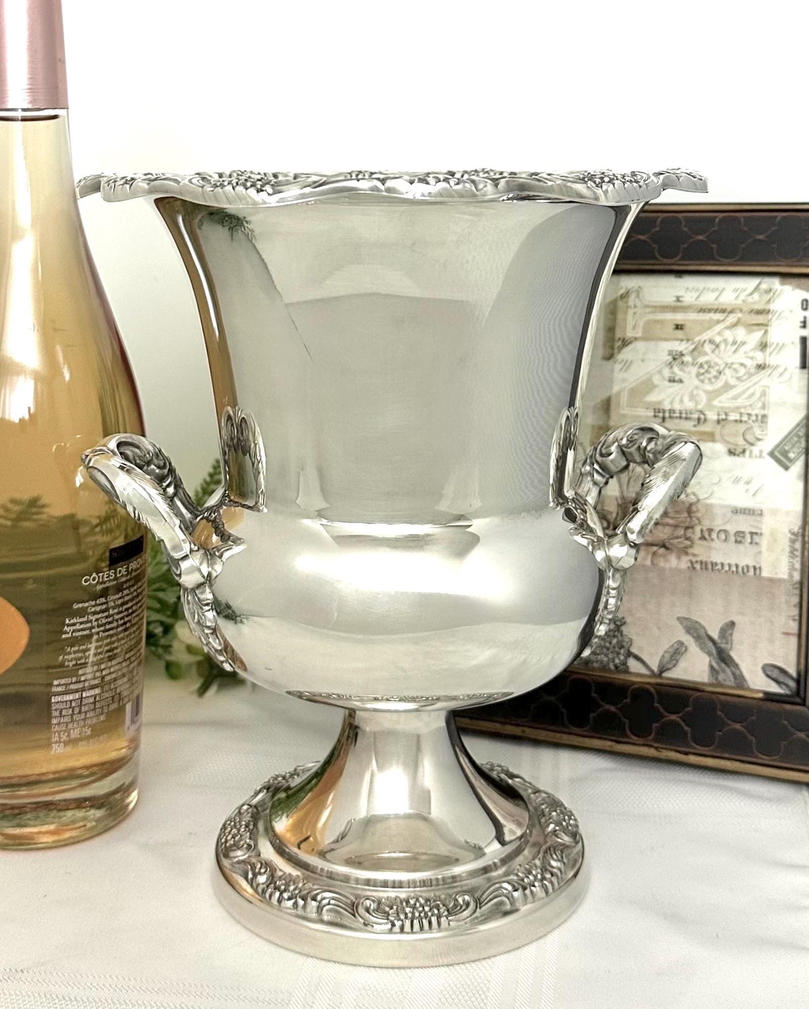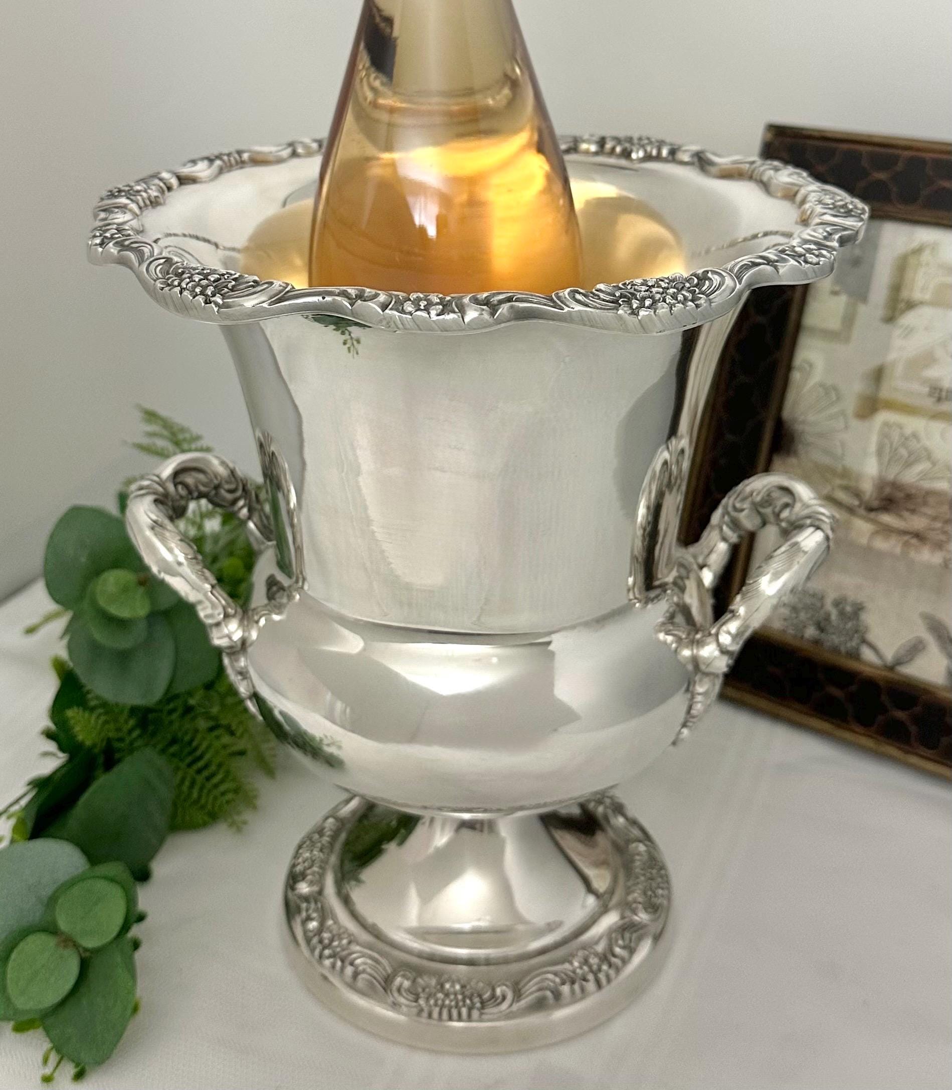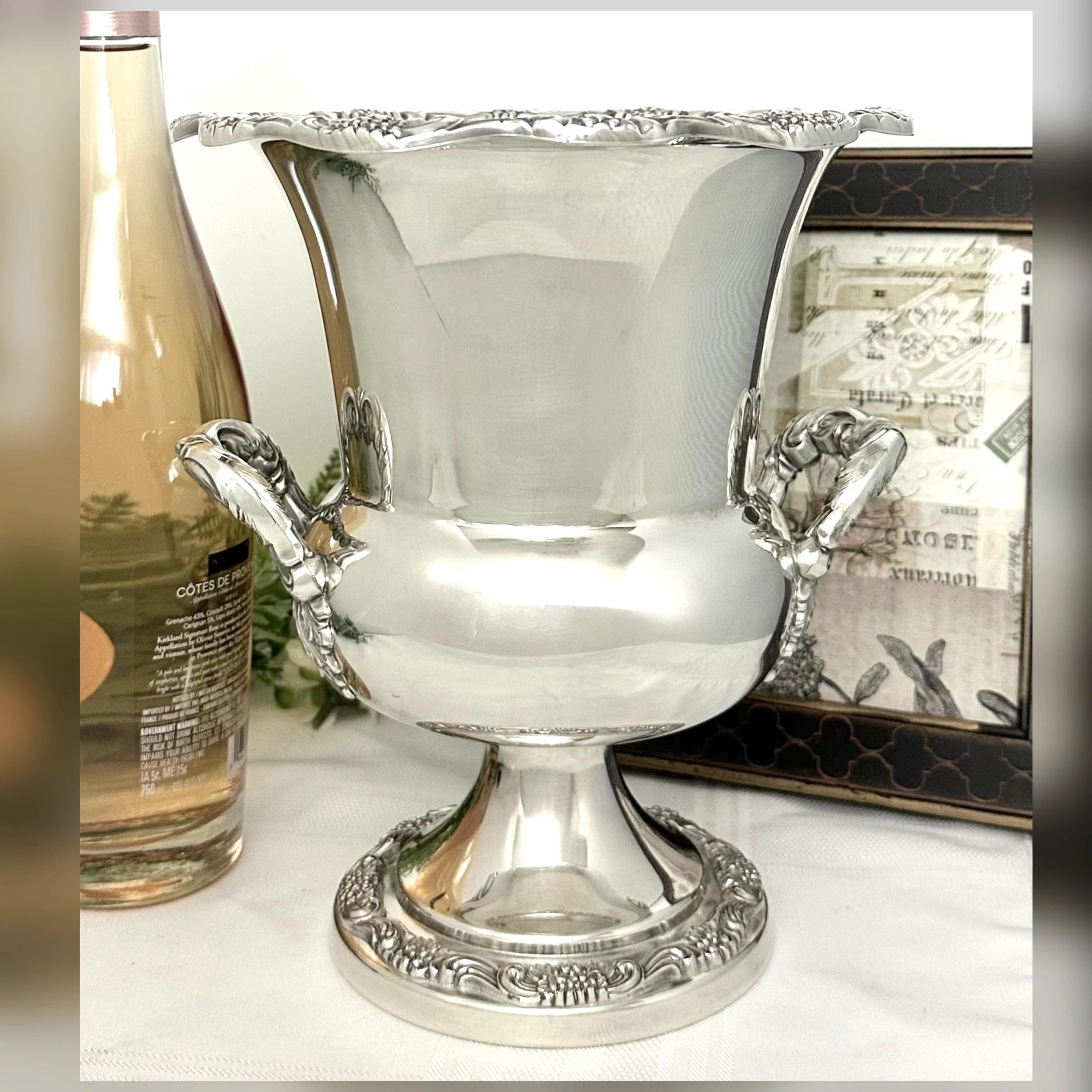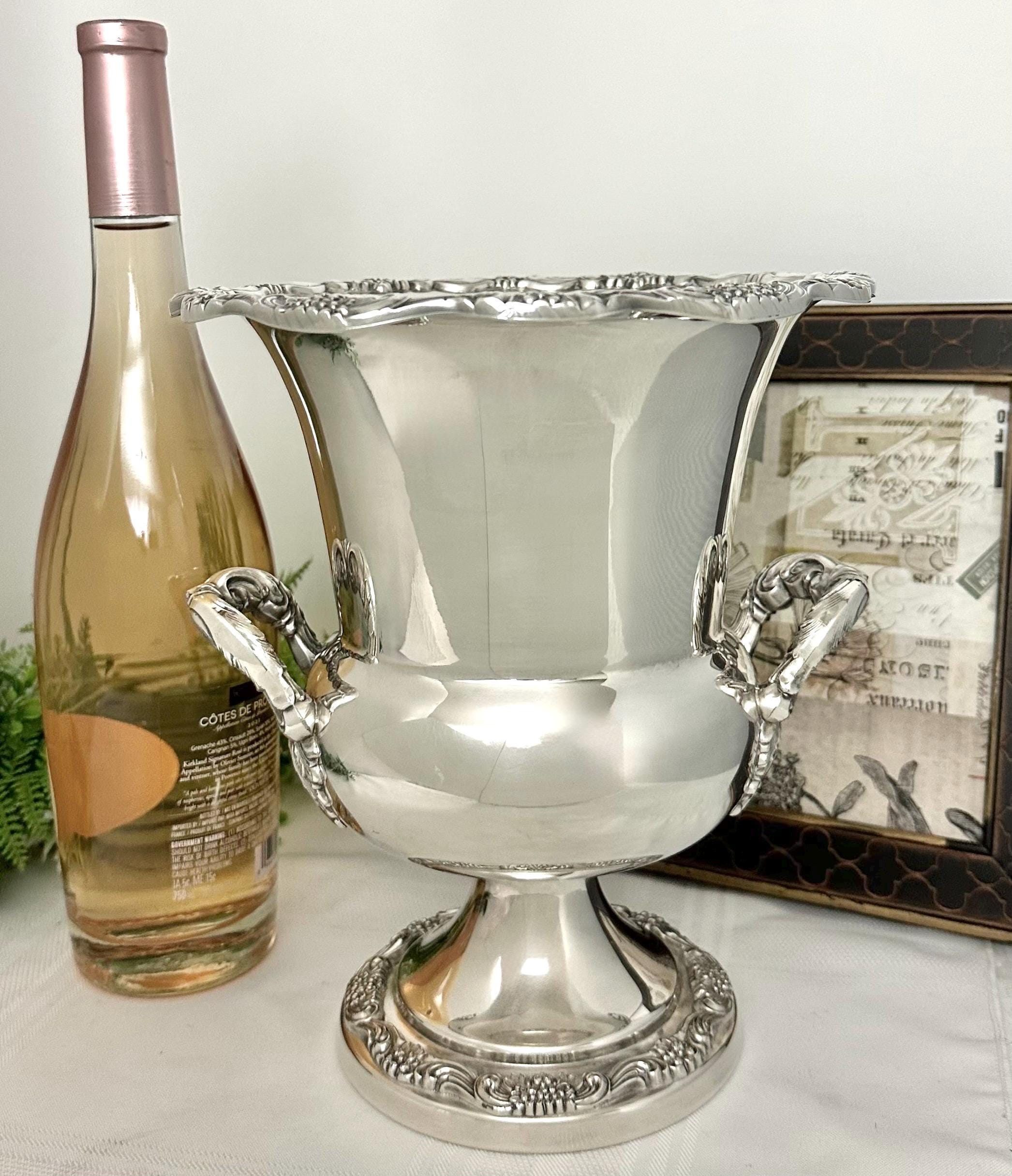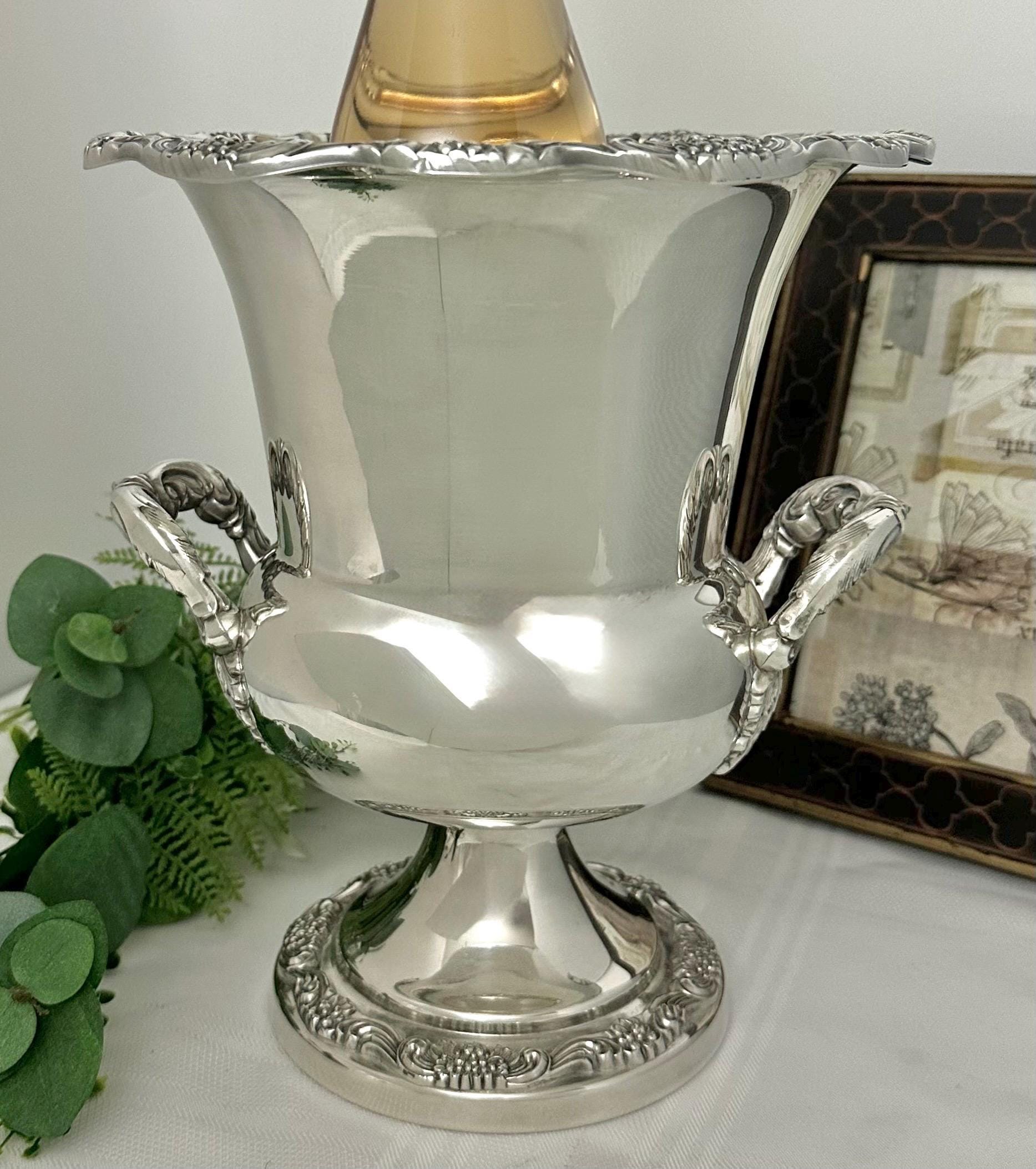 This is for a beautiful Ornate Silver Plated Ice Bucket / Champagne Bucket / Wine holder. It is marked on the bottom with the makers name, Poole, and pattern #423 and is in the Lancaster Rose pattern. The bucket measures 9.5 inches tall x 8.25 inches in diameter.