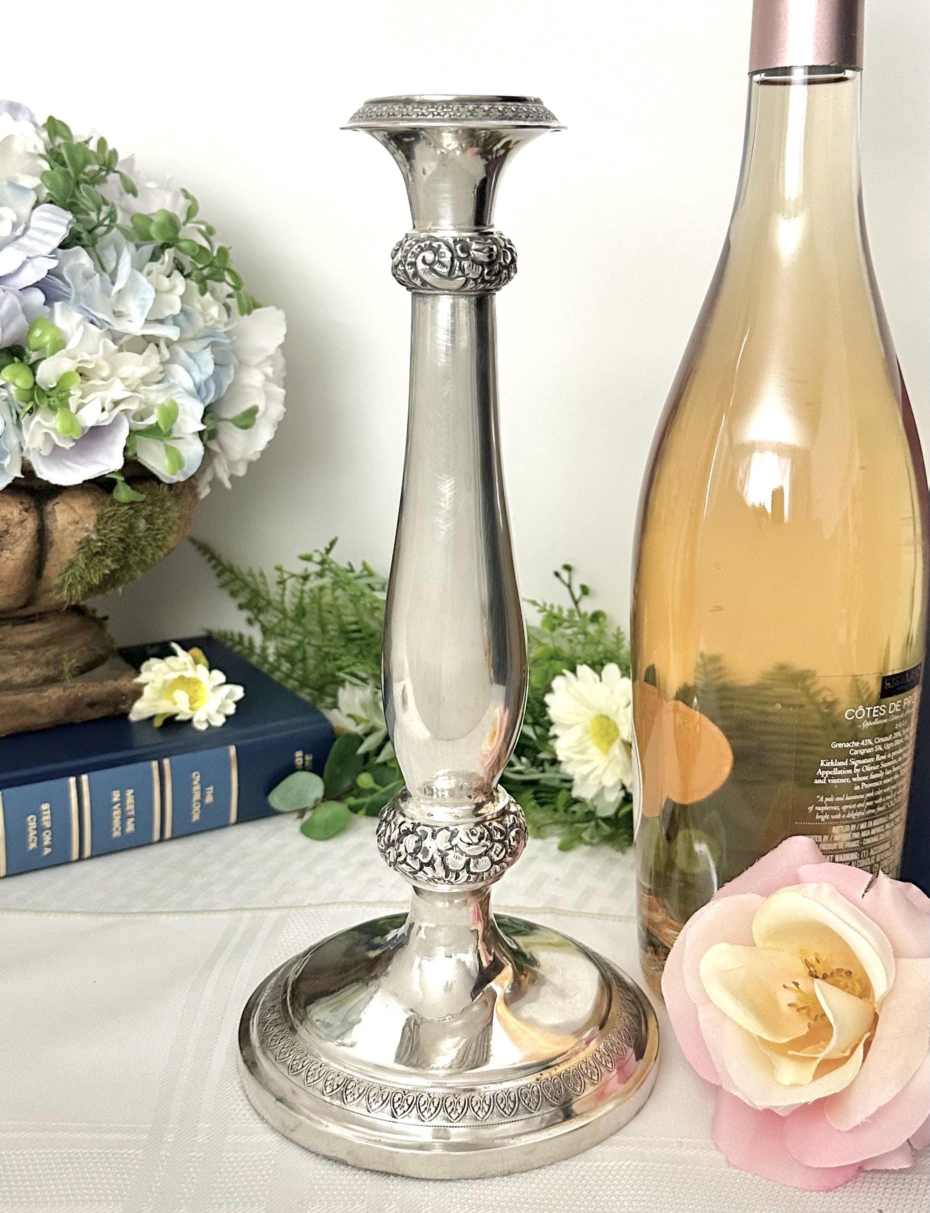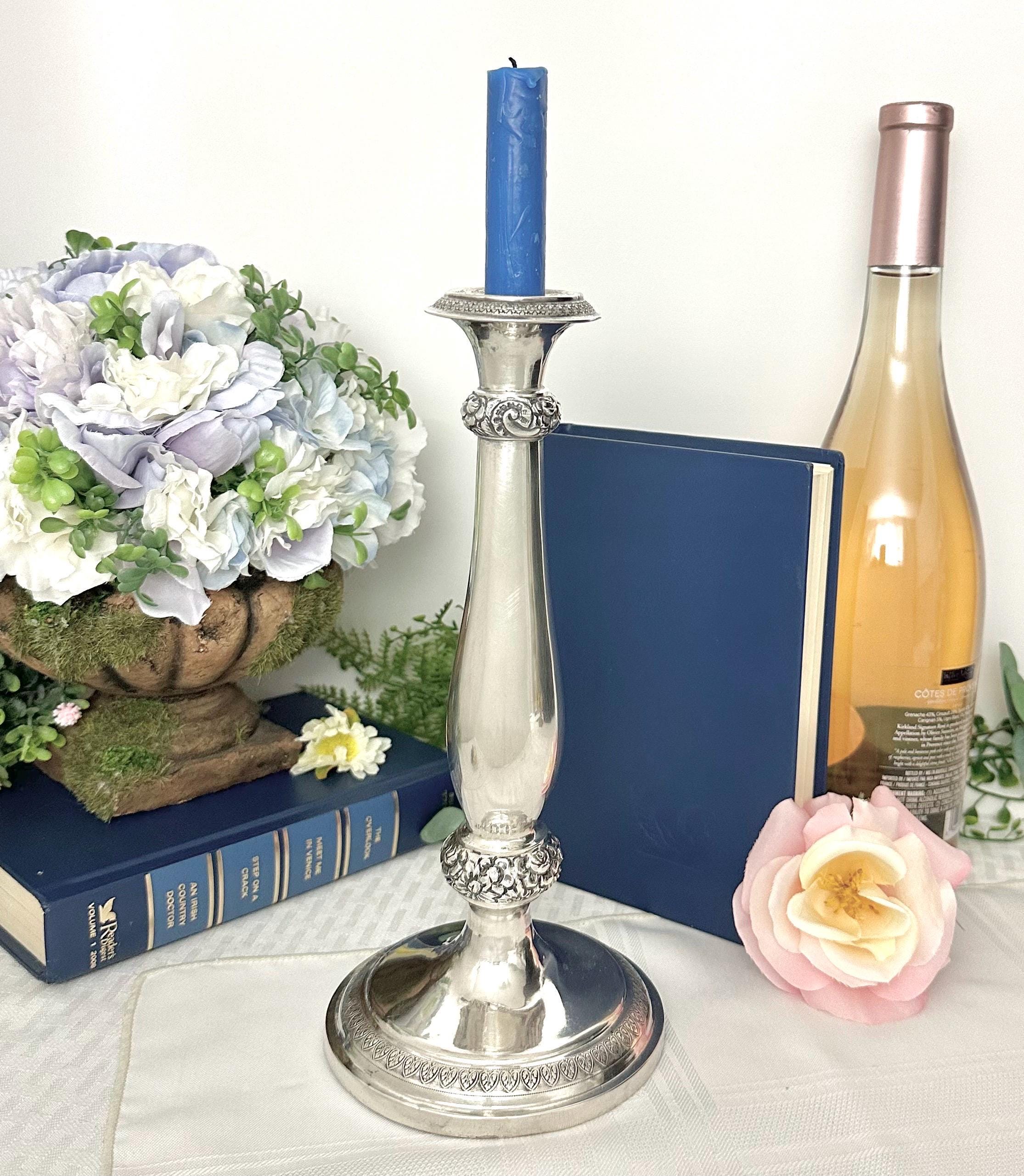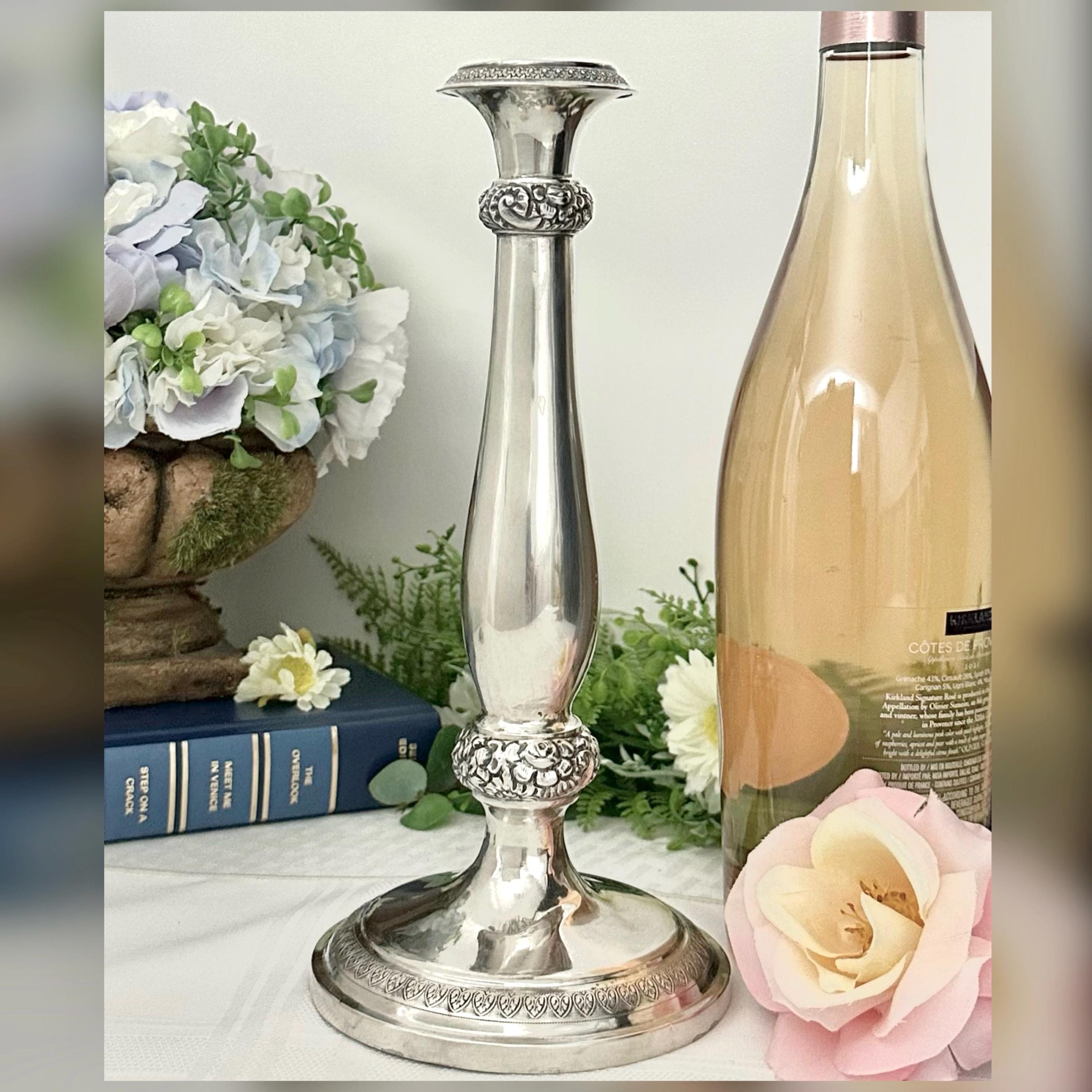 This is for a Vintage Sterling Silver Wiener Biedermeier candle holder which is a beautiful addition to any space with its Victorian style and floral pattern. Standing at 10 inches tall, this candlestick features a single stick design and a diameter of 4.5 inches, making it a unique and elegant piece for any home decor.