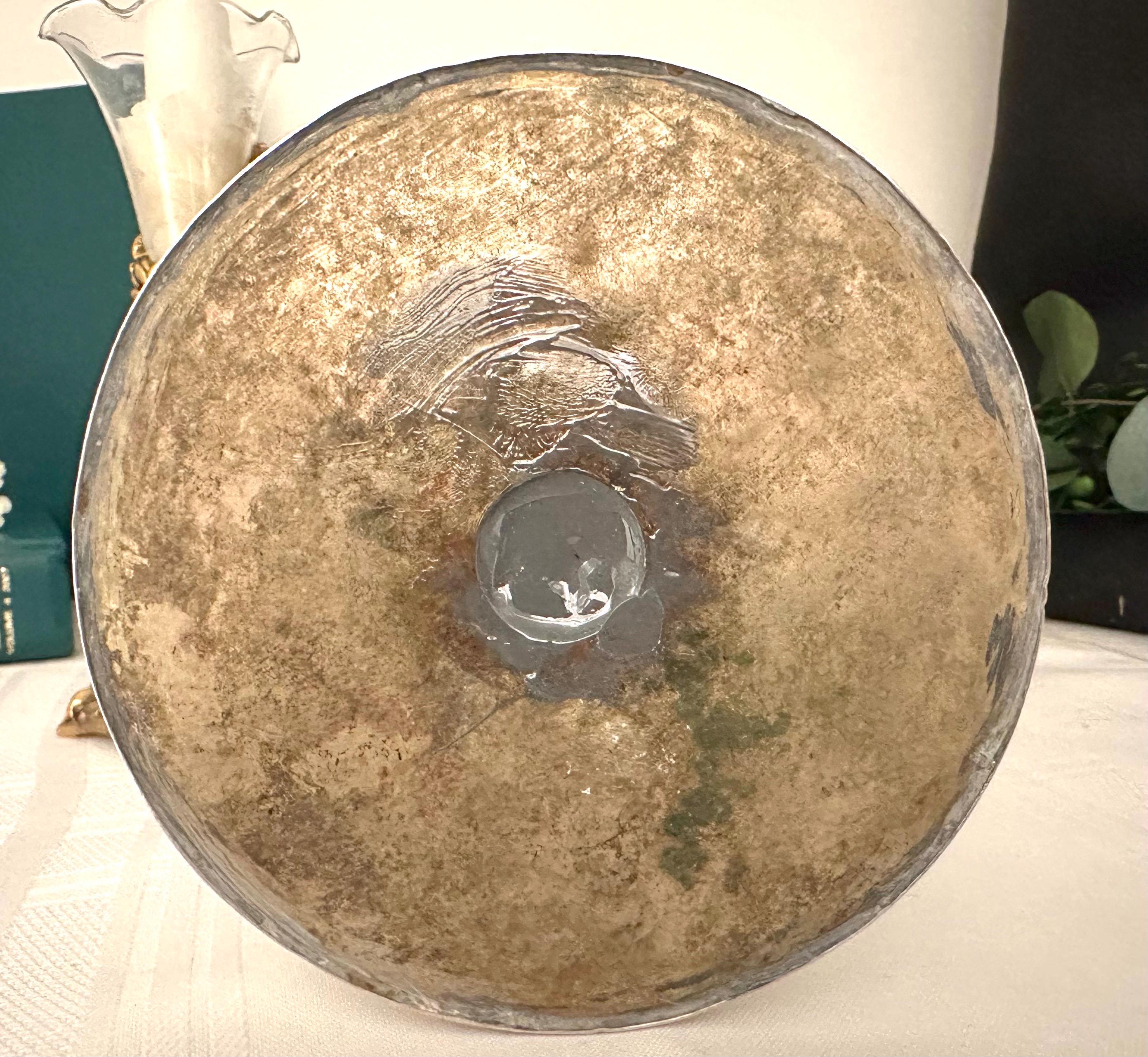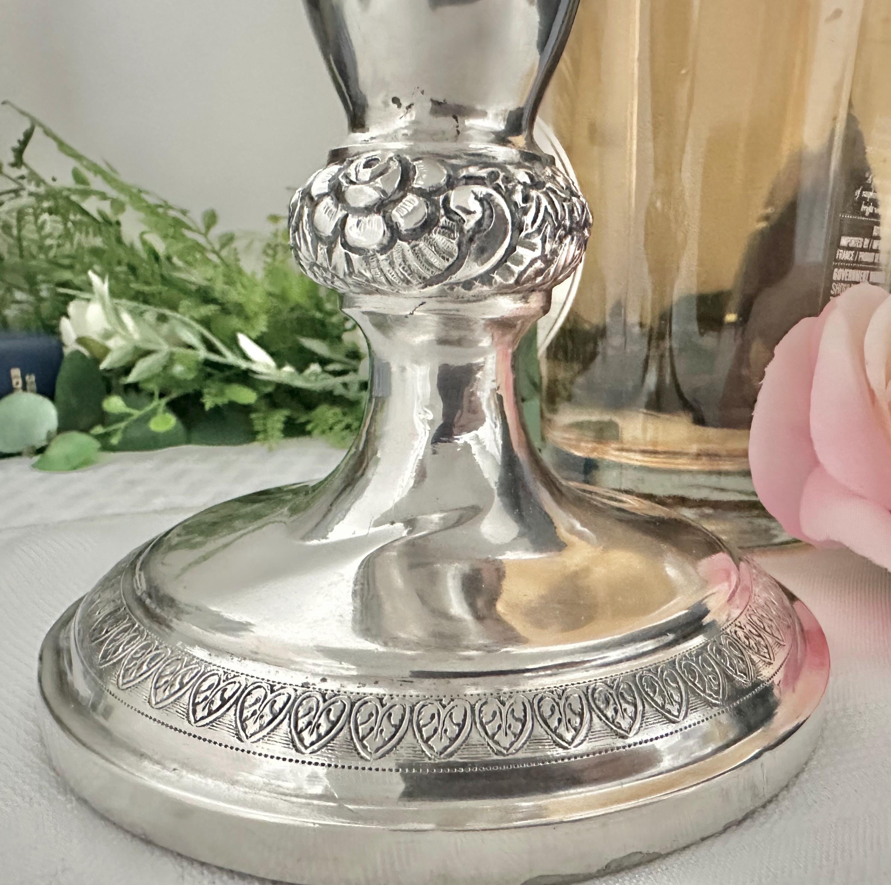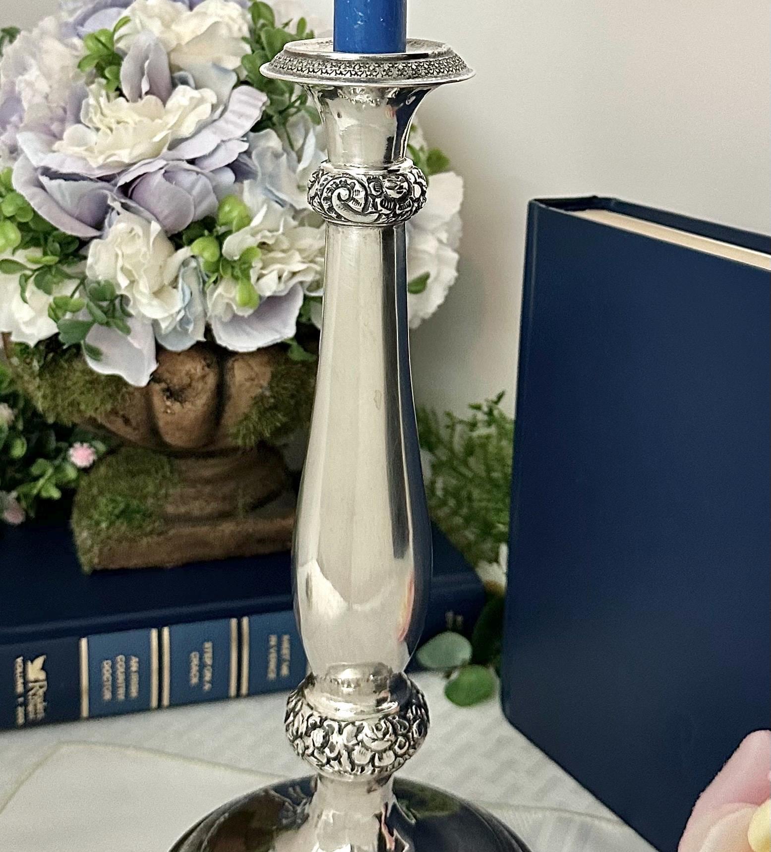 Made of sterling silver with a .925 composition, this candle holder exudes a classic and timeless charm that will complement any antique or traditional decor. The base of the piece is missing which would have had the makers marks and sterling and perhaps a pattern number. The weighted weight of the item is 543 grams.