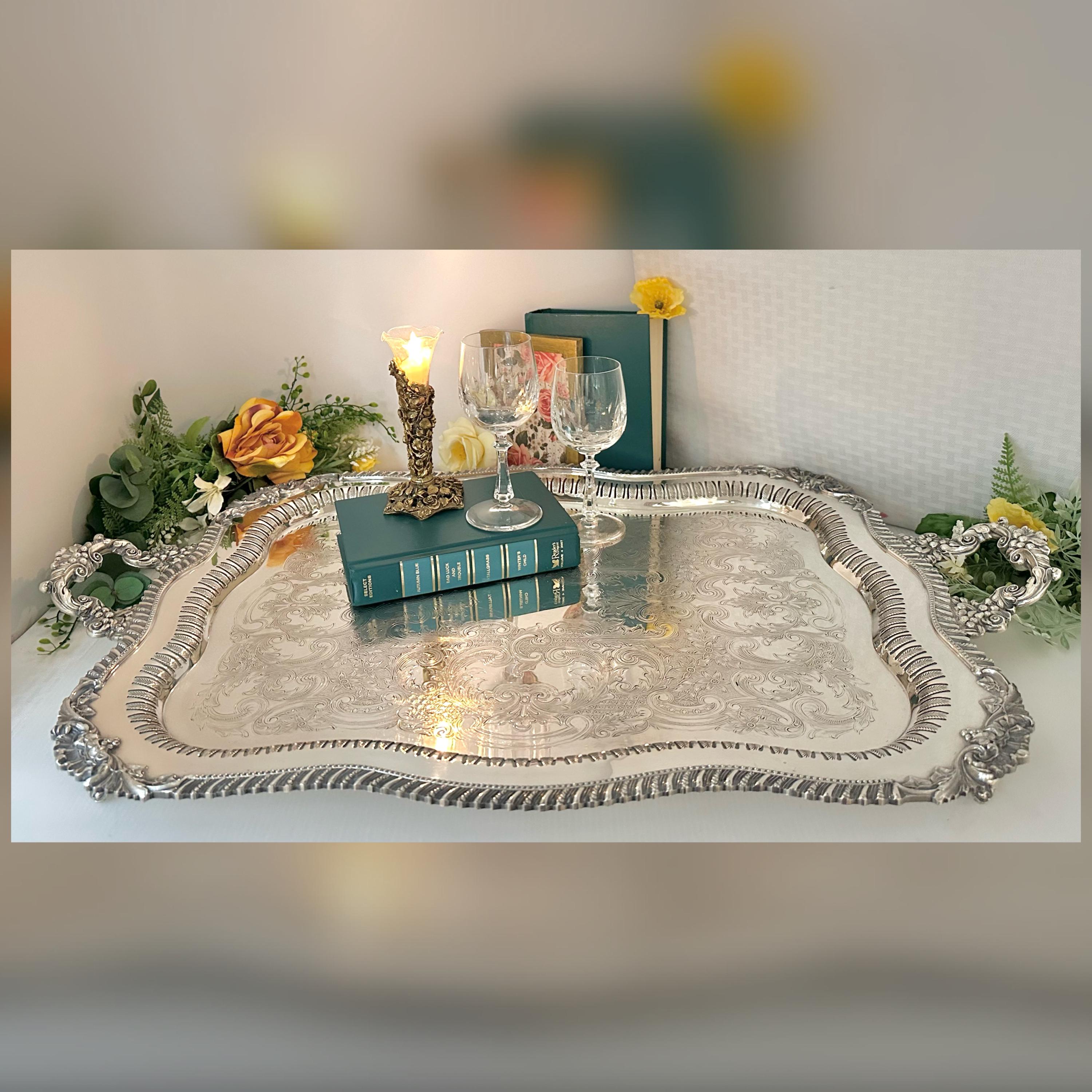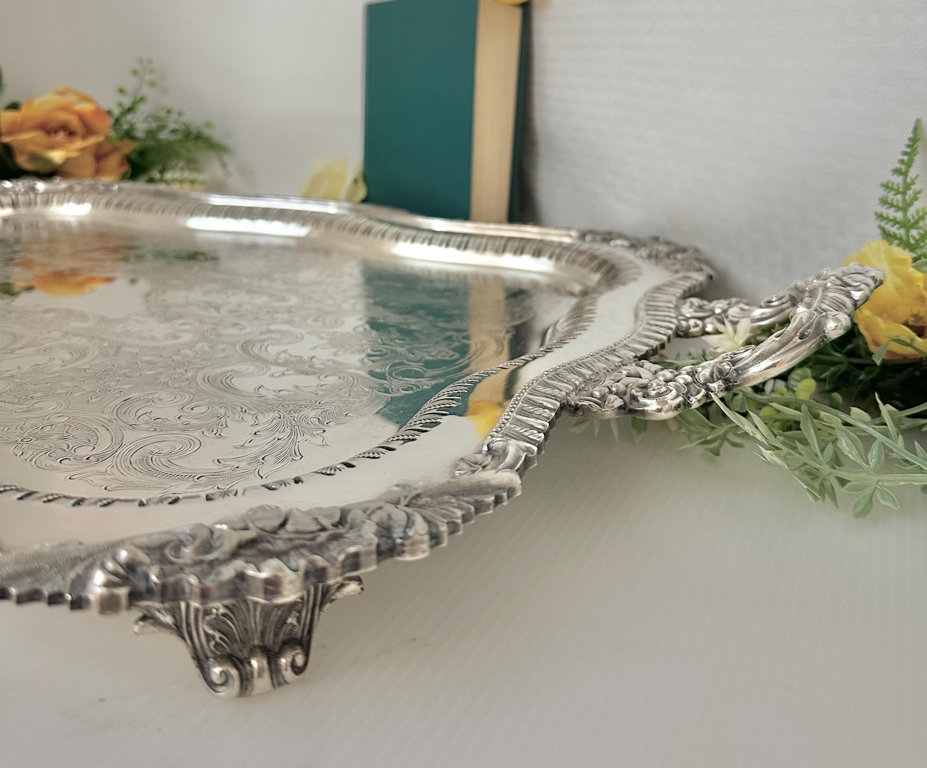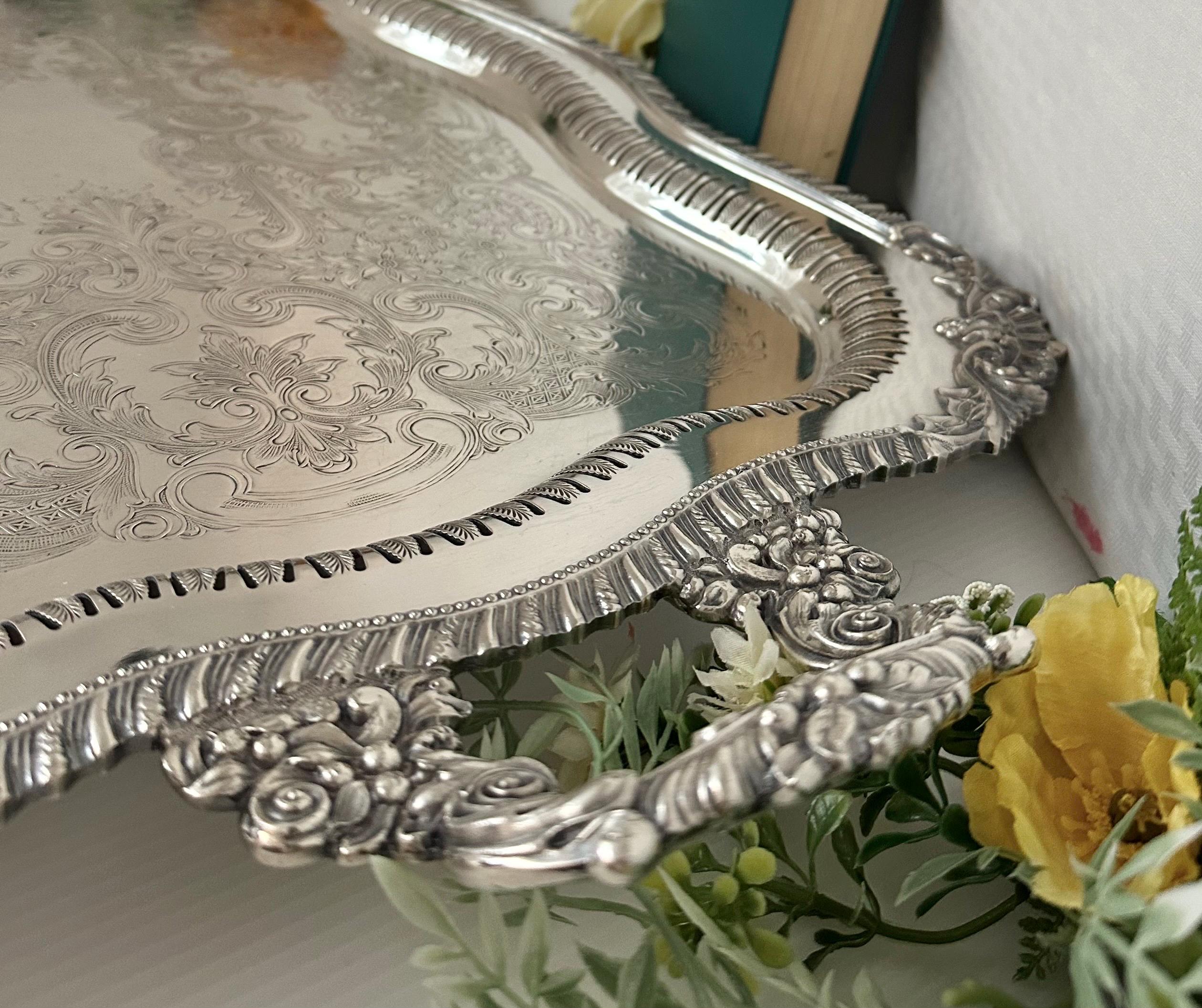 Perfect for holding a tea set or other beverage serving containers, this elegant tray adds a touch of antique charm to any table setting or home decor. The vintage silver tray is also perfect for holding candle holders to serving hors devours to your own tea set. The tray is in wonderful condition with light scratches in the center and no noted missing silver plate. The tray is a beautiful piece to add to any collection or display.