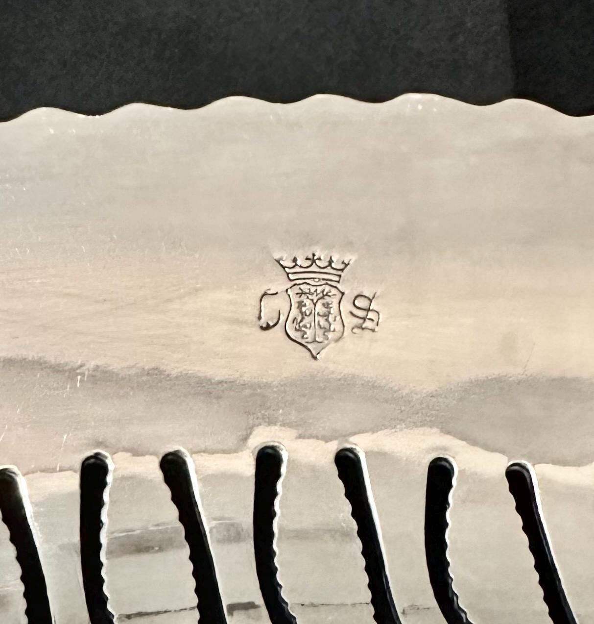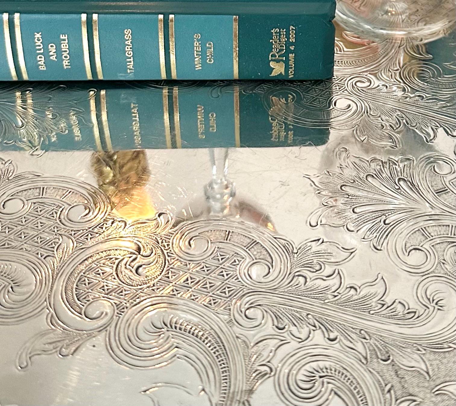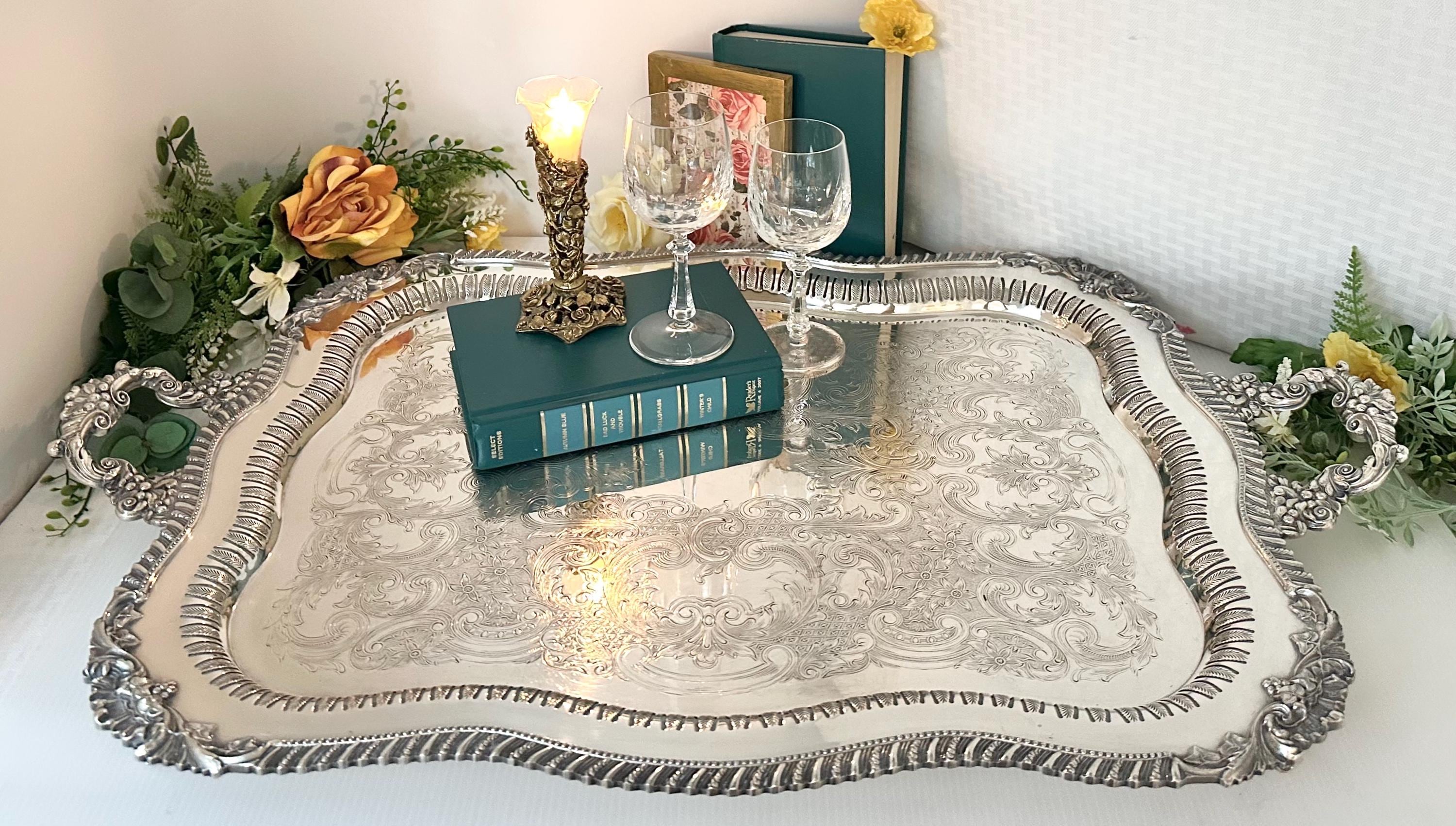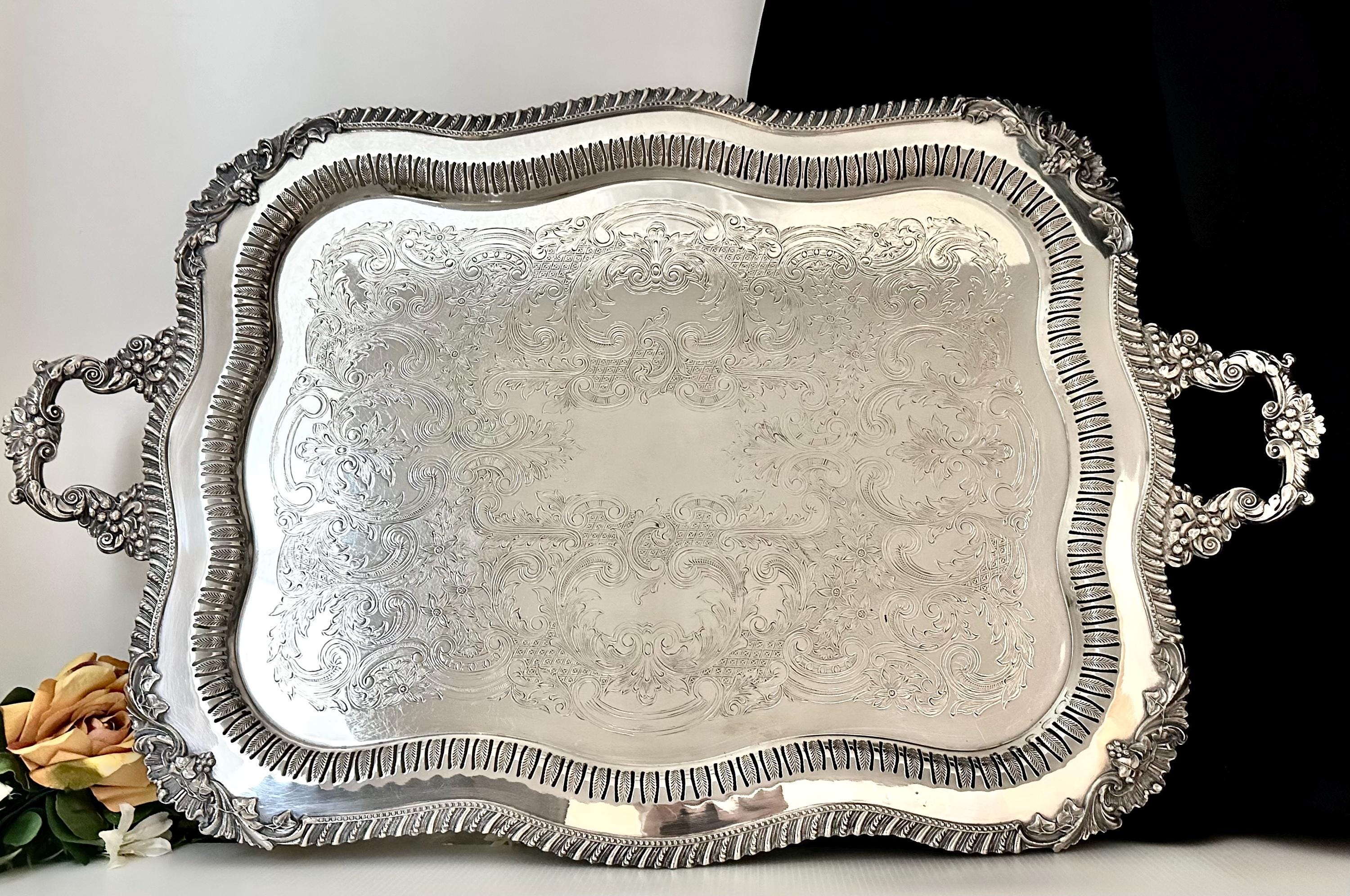 Perfect for holding a tea set or other beverage serving containers, this elegant tray adds a touch of antique charm to any table setting or home decor. The vintage silver tray is also perfect for holding candle holders to serving hors devours to your own tea set. The tray is in wonderful condition with light scratches in the center and no noted missing silver plate. The tray is a beautiful piece to add to any collection or display.