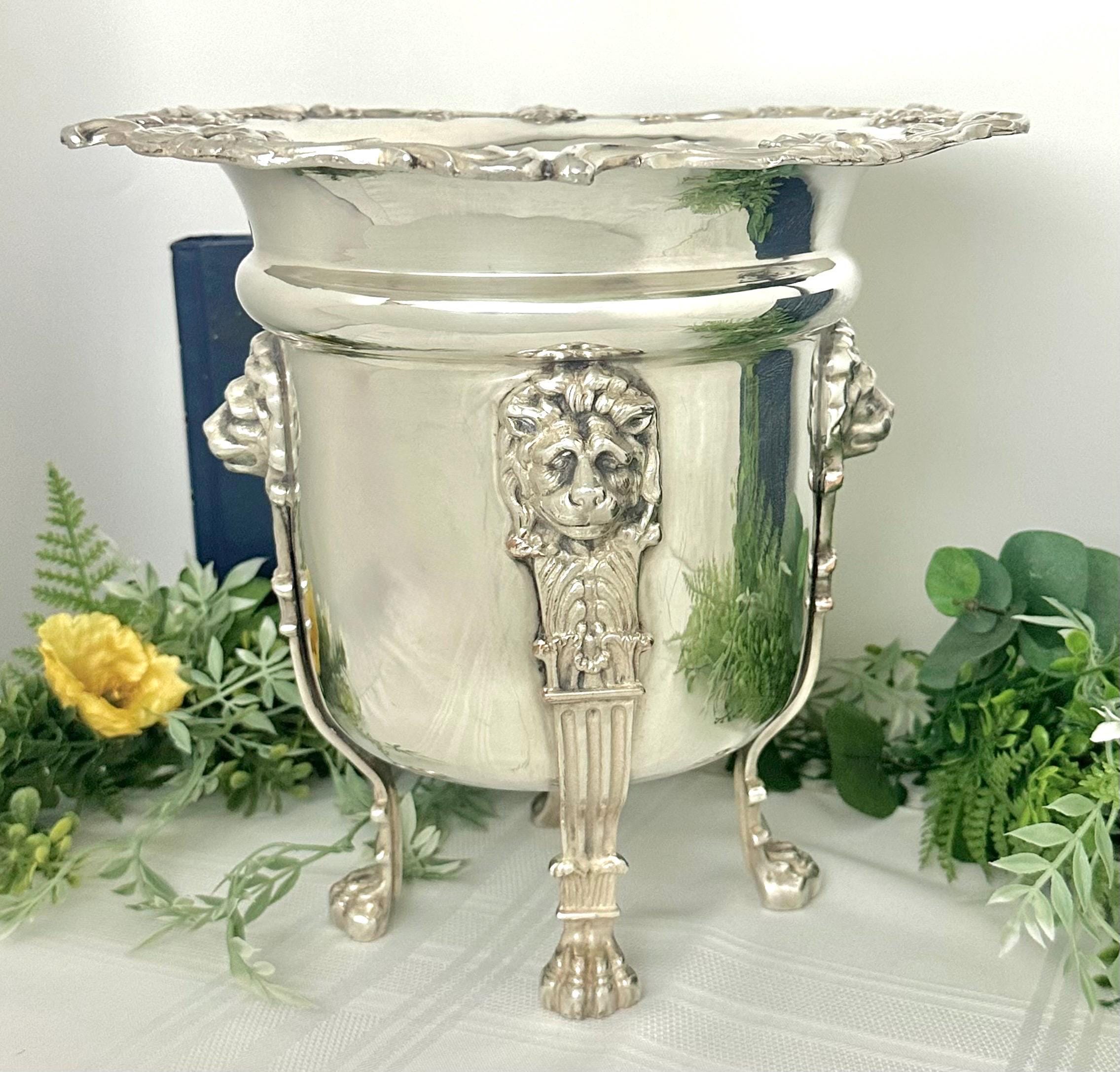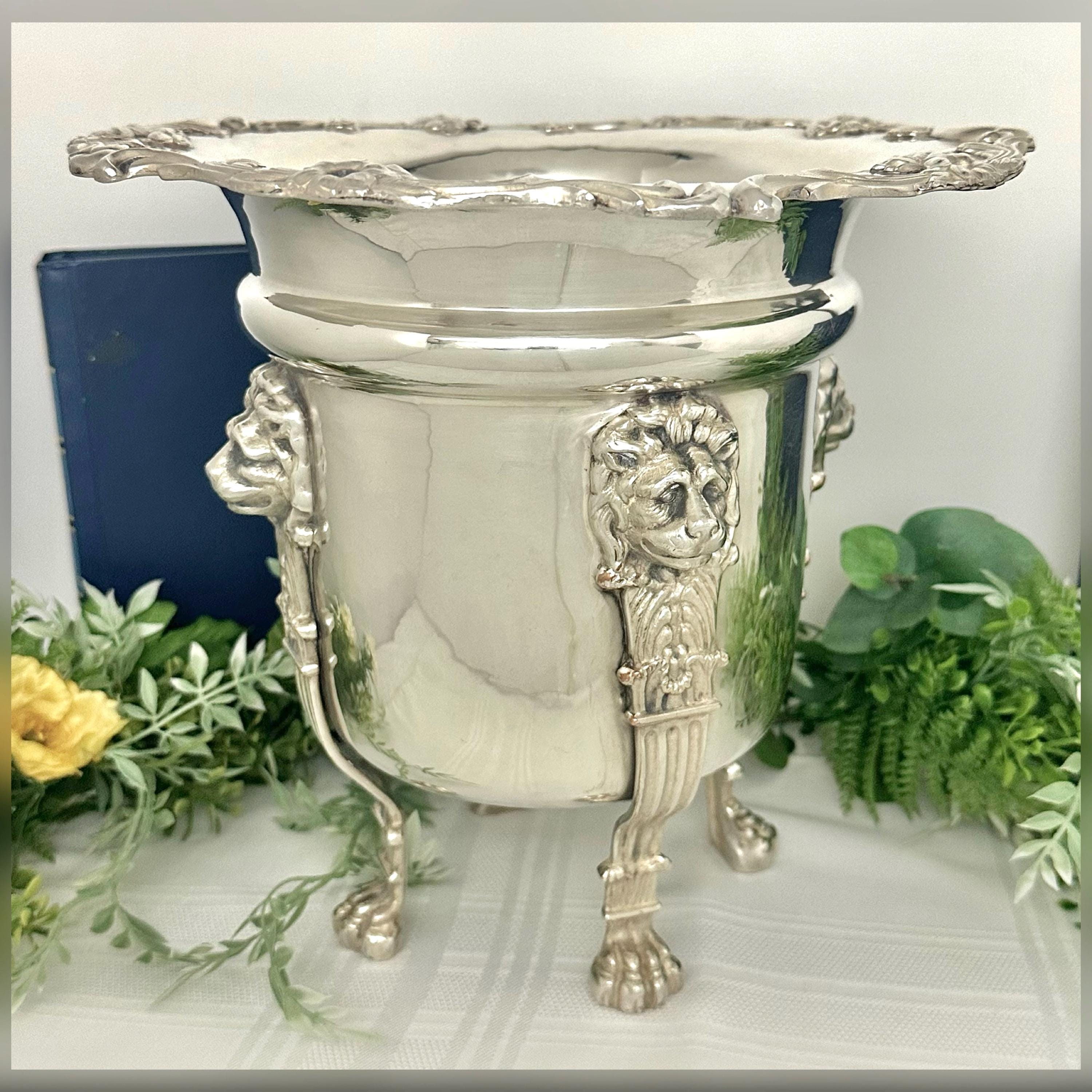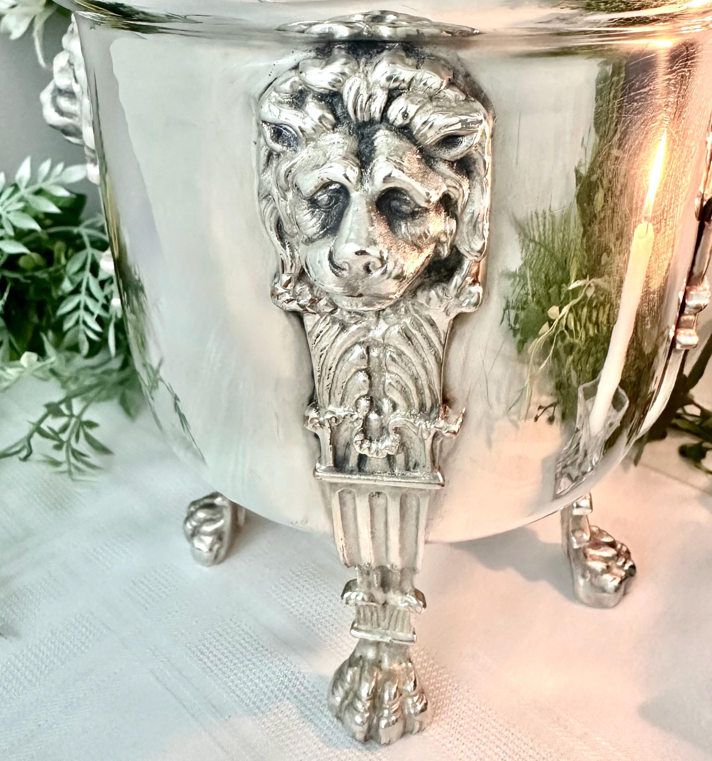This is for a Beautiful Antique Silver Plated wine cooler / cachepot / jardiniere that features a neoclassical design. This statement piece has large lion heads leading to lion paws for feet. The ornate design makes it a unique and stylish addition to any barware collection.