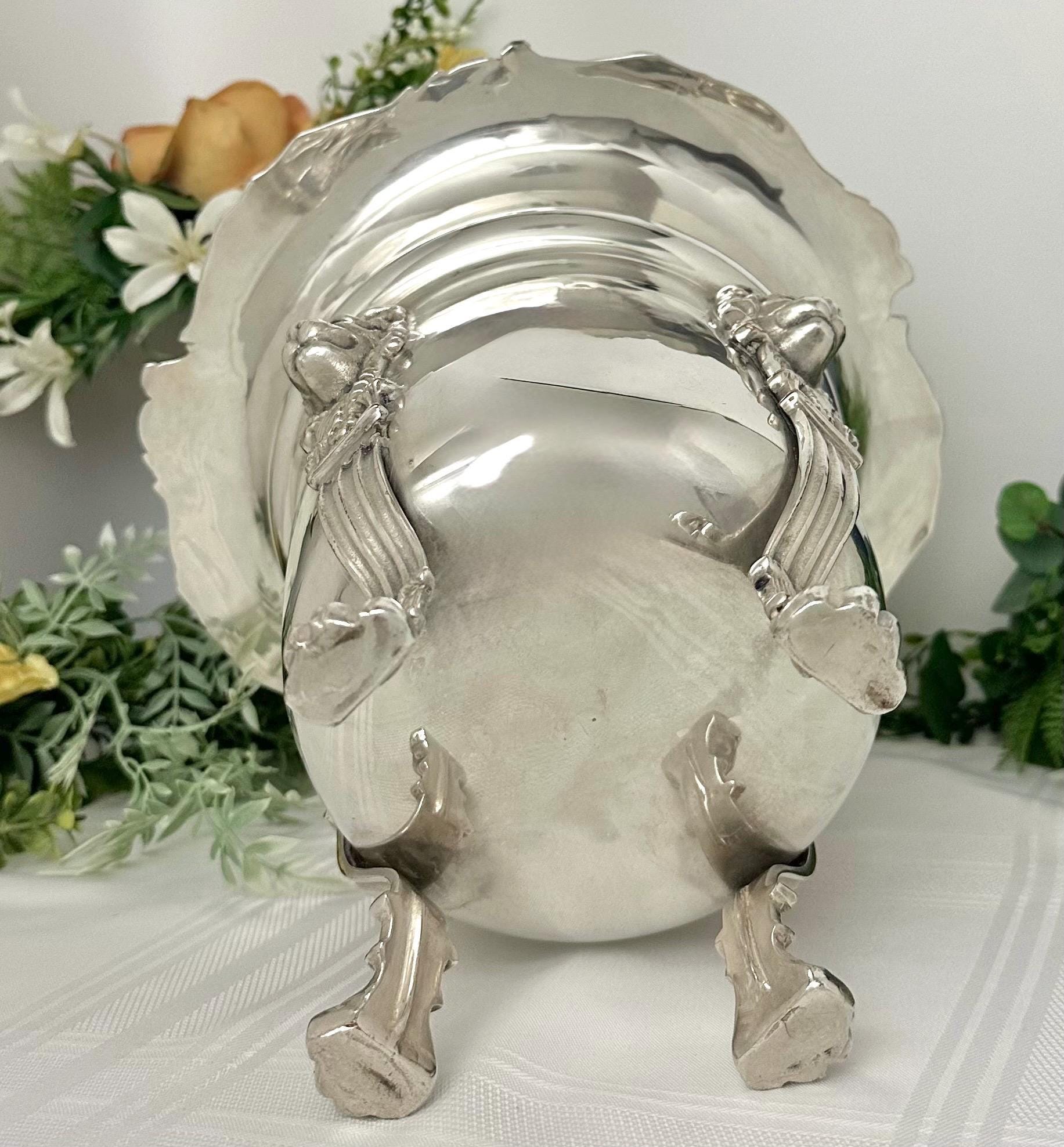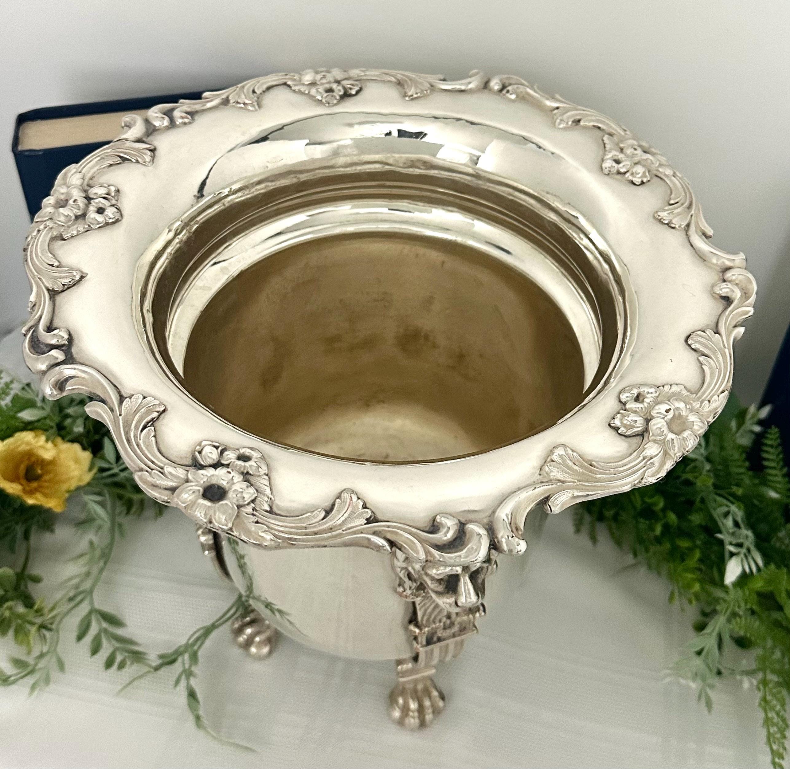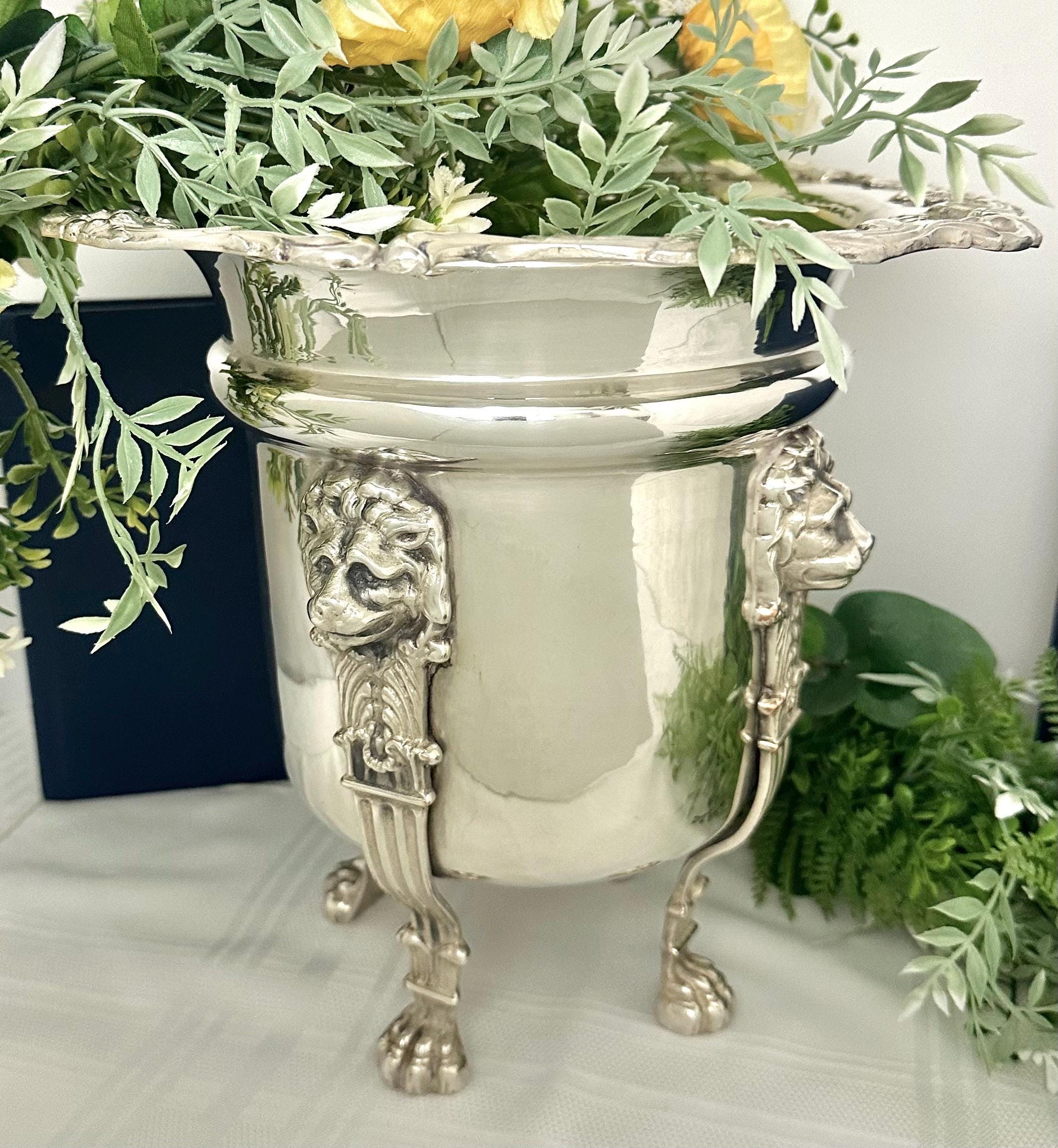 This is for a Beautiful Antique Silver Plated wine cooler / cachepot / jardiniere that features a neoclassical design. This statement piece has large lion heads leading to lion paws for feet. The ornate design makes it a unique and stylish addition to any barware collection.