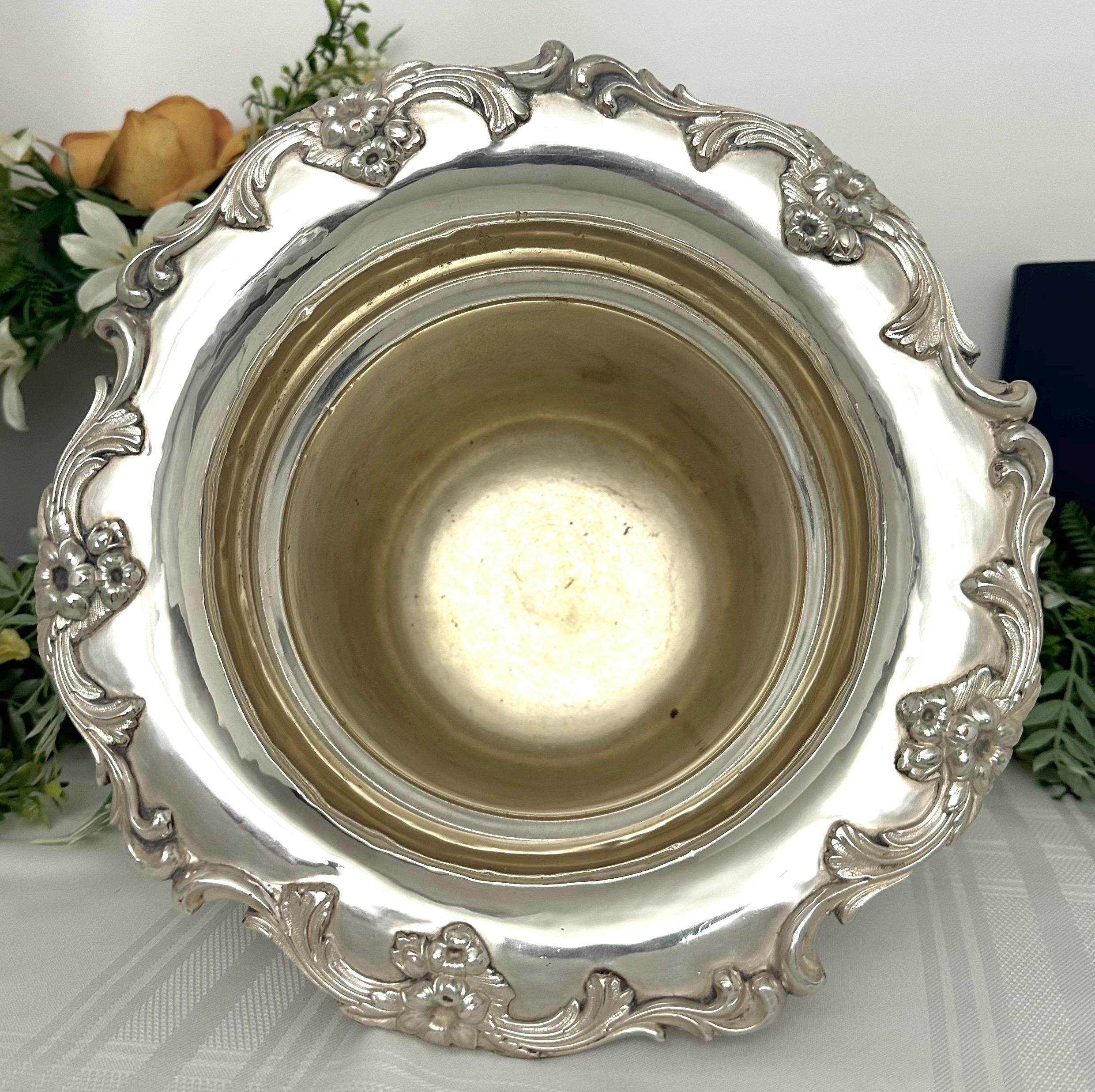 The silver plated wine chiller has a round shape with an all-over floral rim and a decorative vase design, perfect for all occasions. Handmade with attention to detail, this original piece will add an antique touch of elegance to any kitchen / bar or home decor.